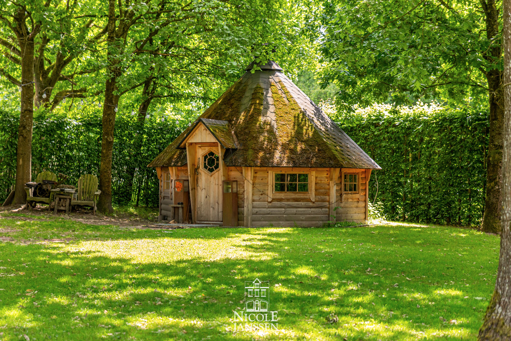 - Het volledige gazon wordt onderhouden met een robotmaaier