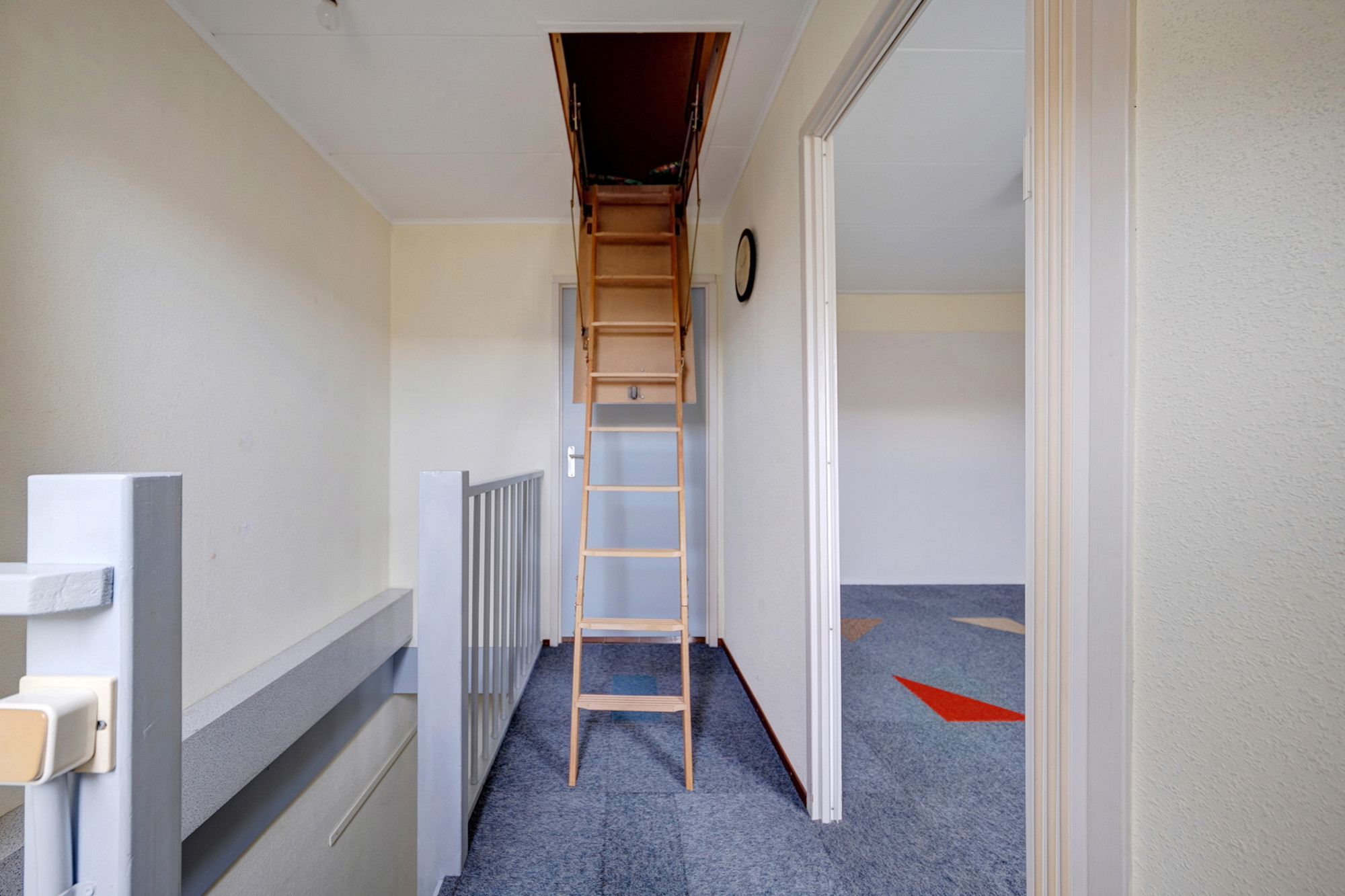 Middels de overloop heeft u toegang tot één slaapkamer, de wasruimte en de vliering, respectievelijk:
