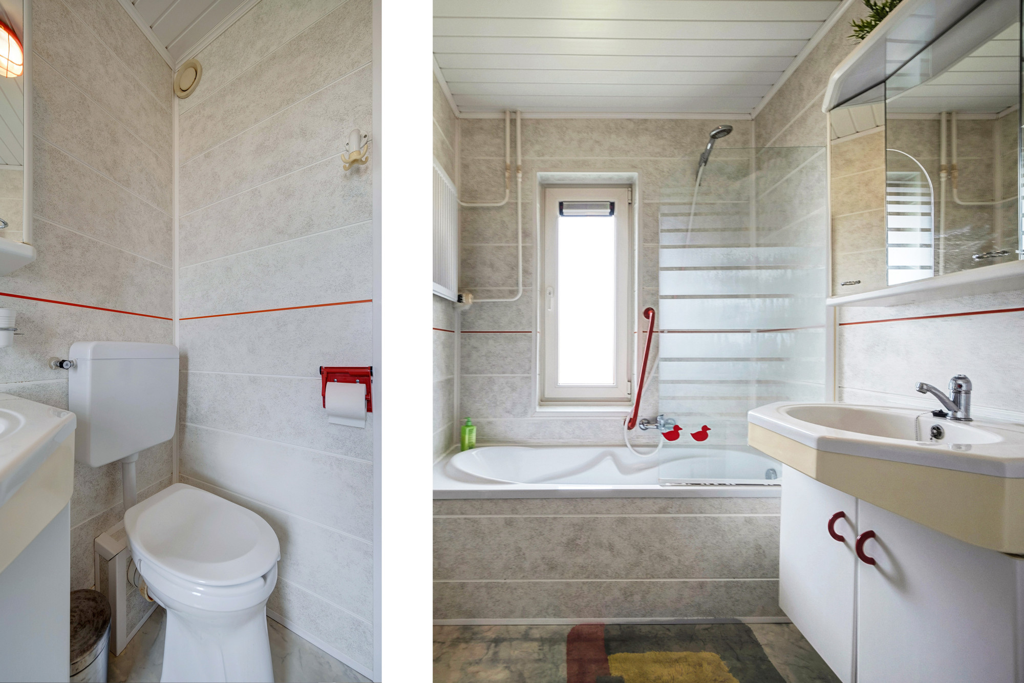 De betegelde badkamer is voorzien van een ligbad, staandcloset en wastafelmeubel.