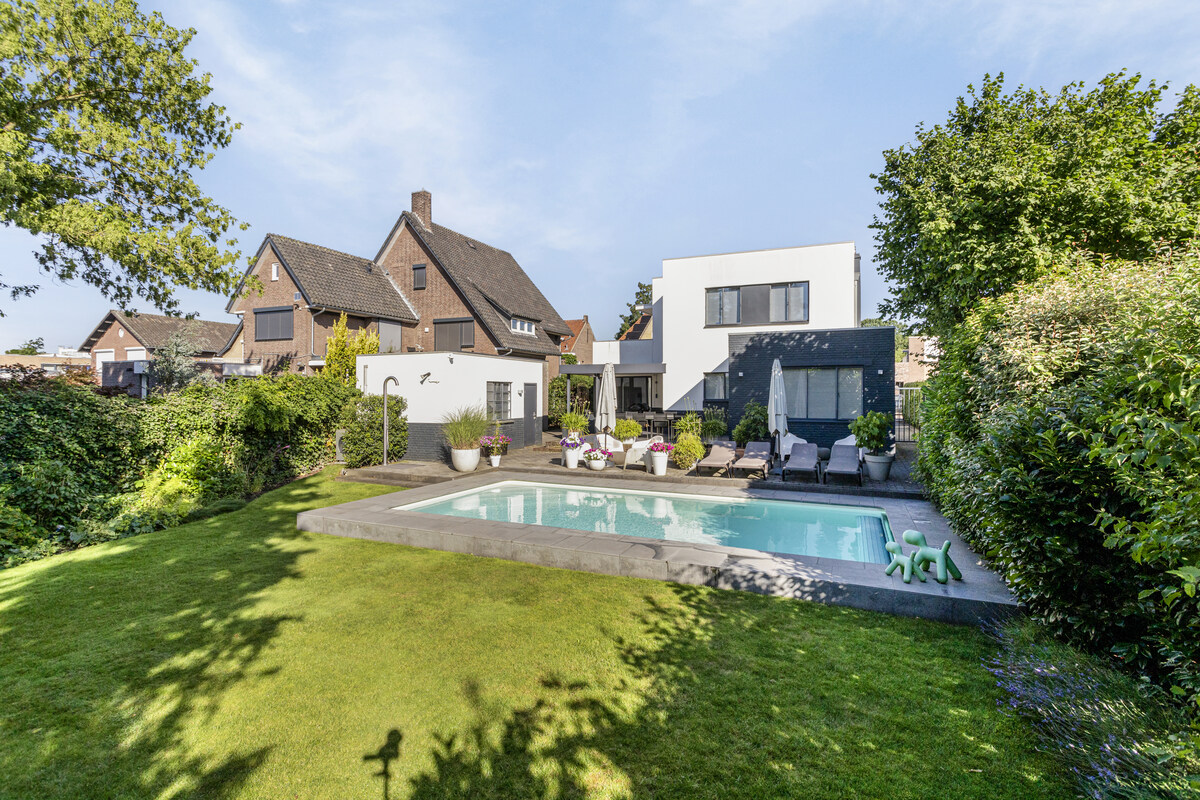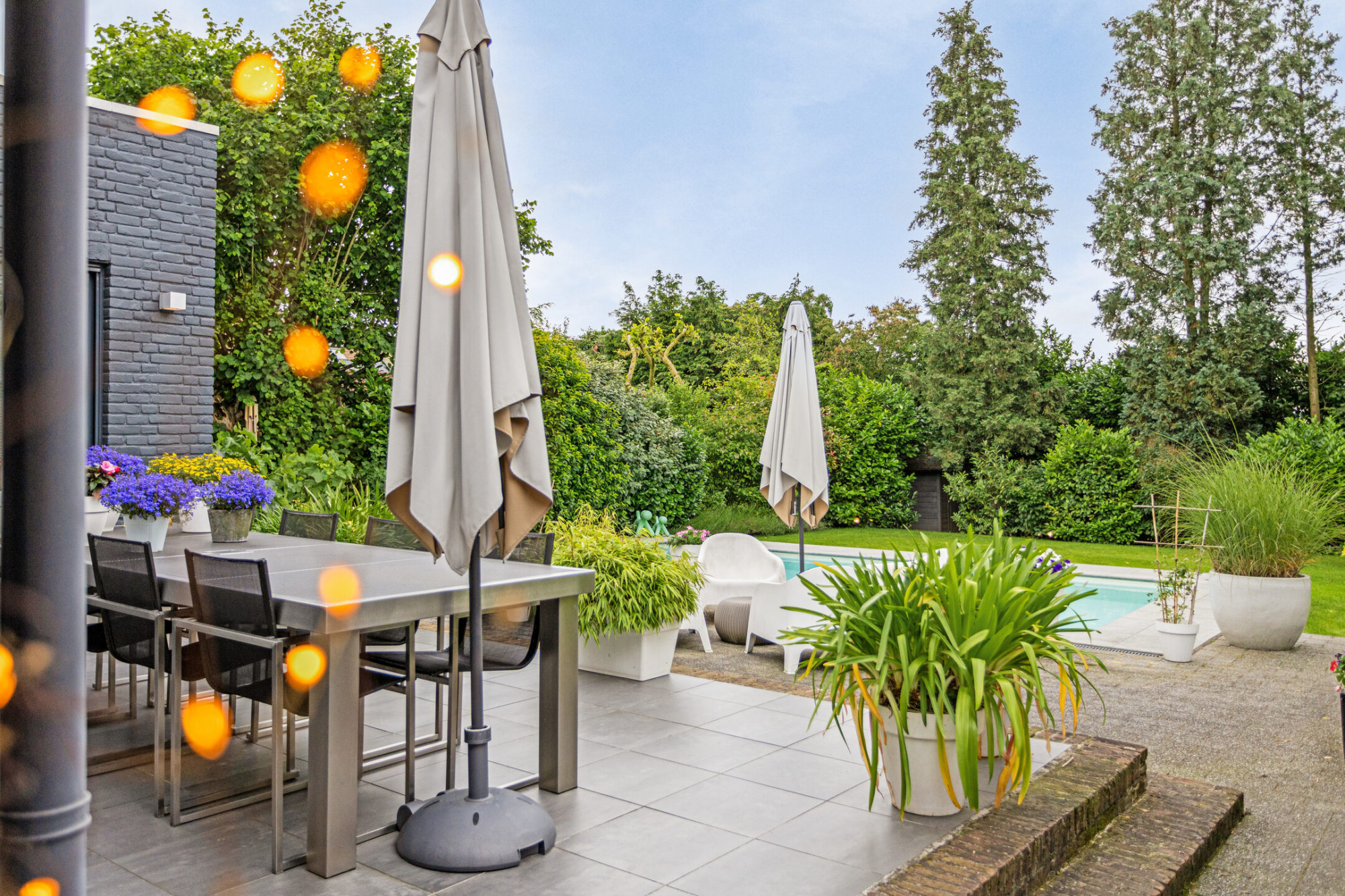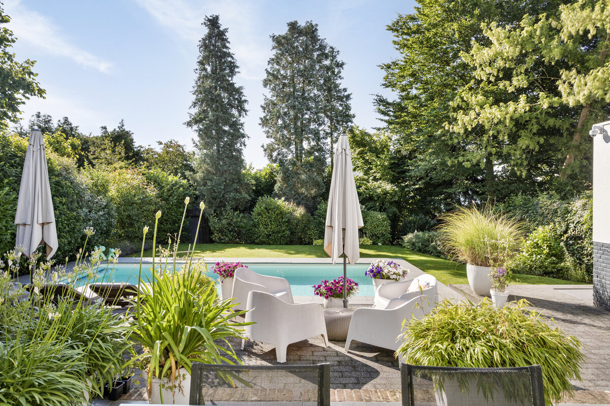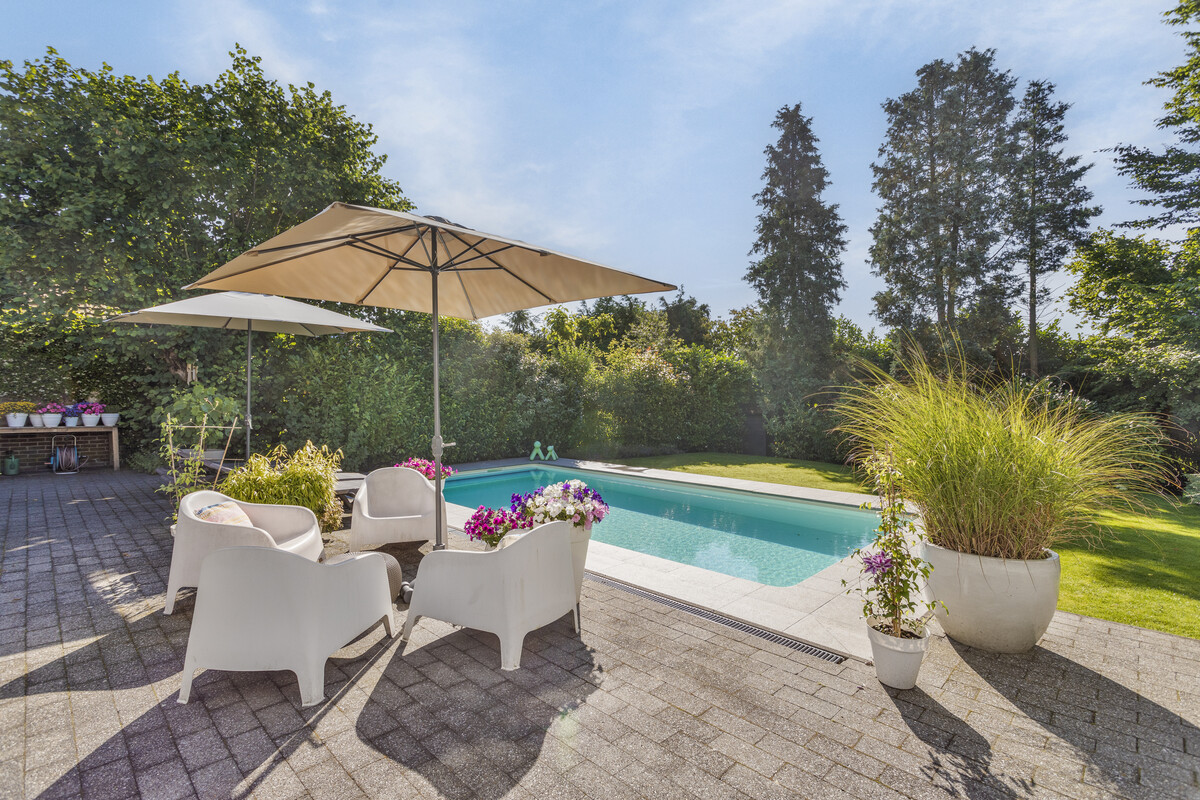 Achtertuin met terrassen, gazon, aanplanting, verwarmd zwembad (8.00 x 4.00 x 1.50 m) met warmte pomp, buiten douche en tuinberging. De tuin biedt een prima privacy waardoor ongestoord genieten elke dag mogelijk is.