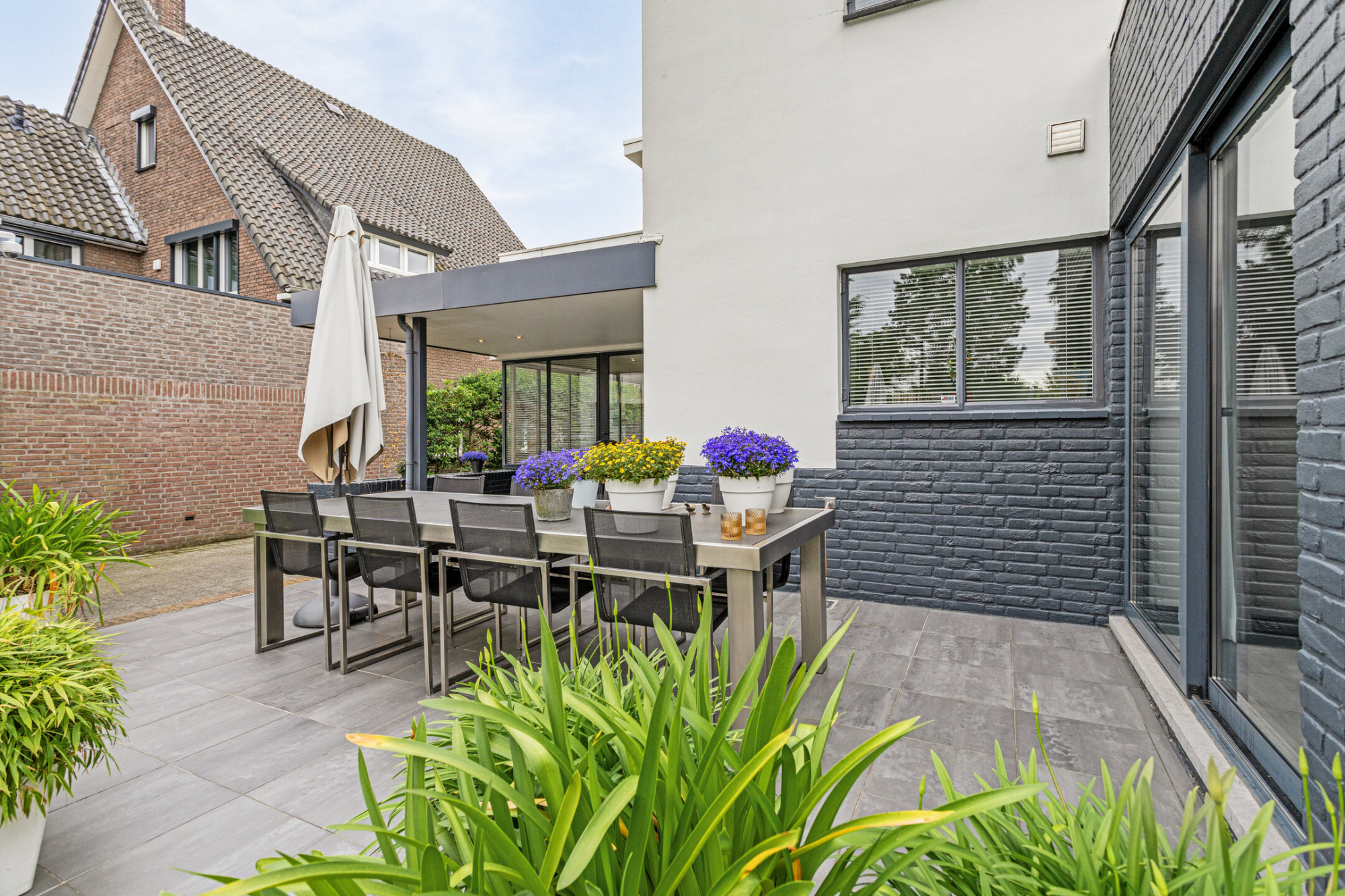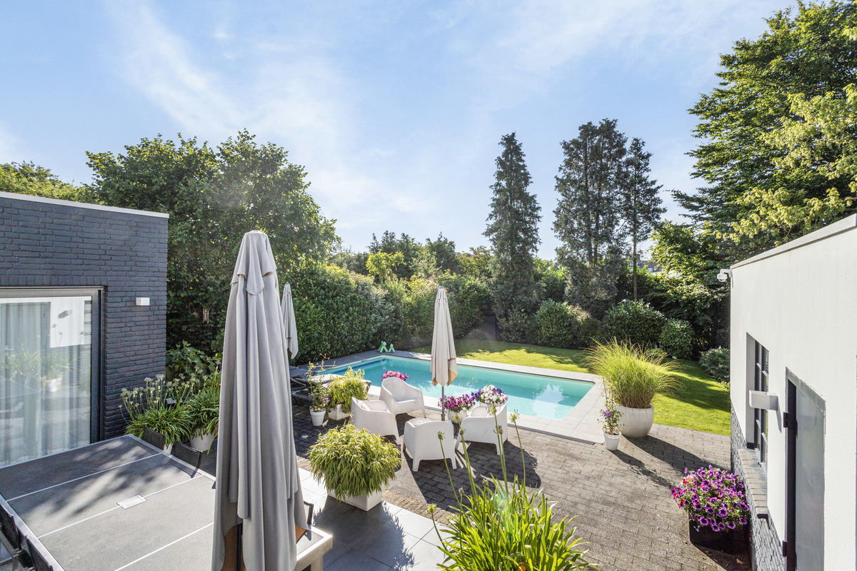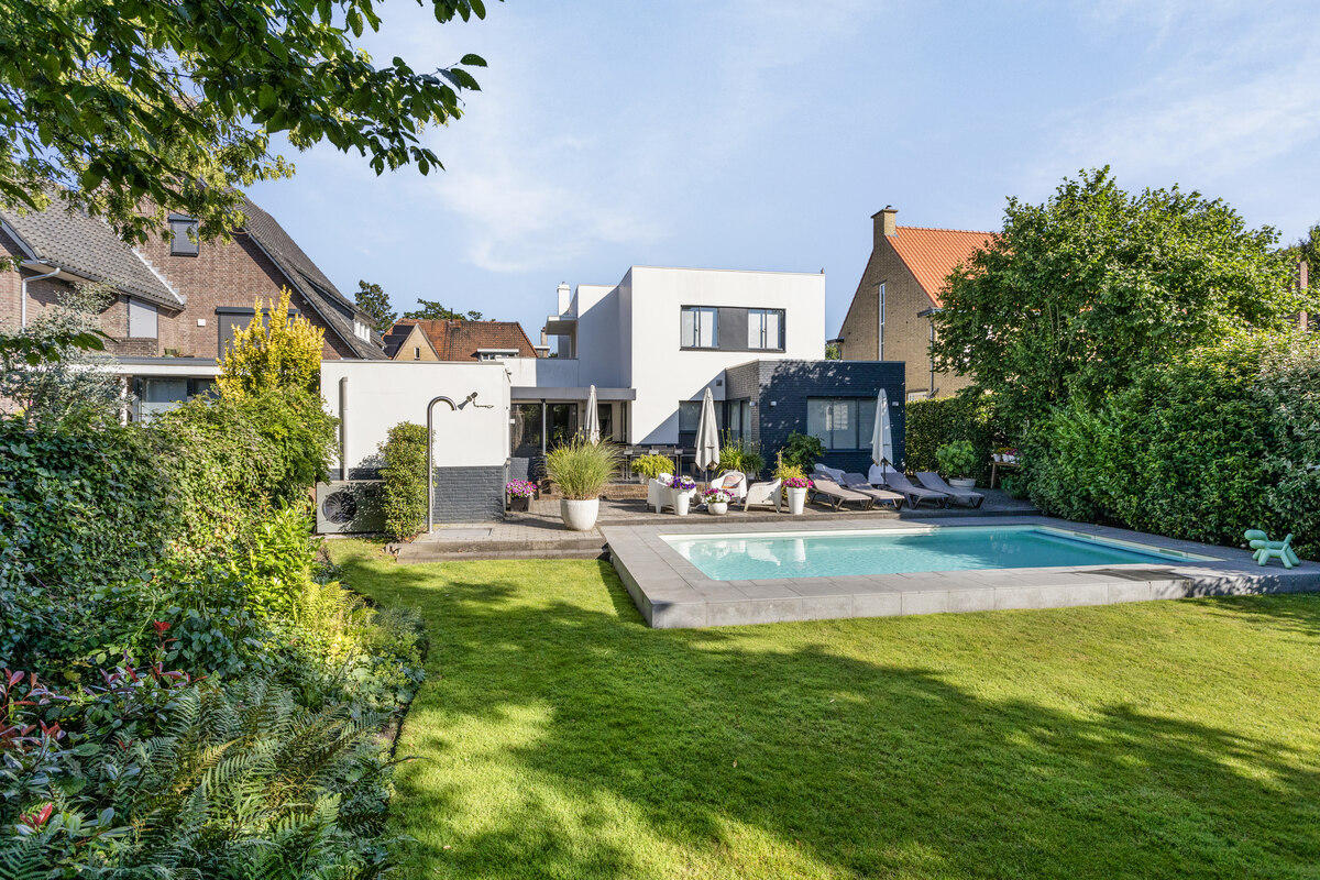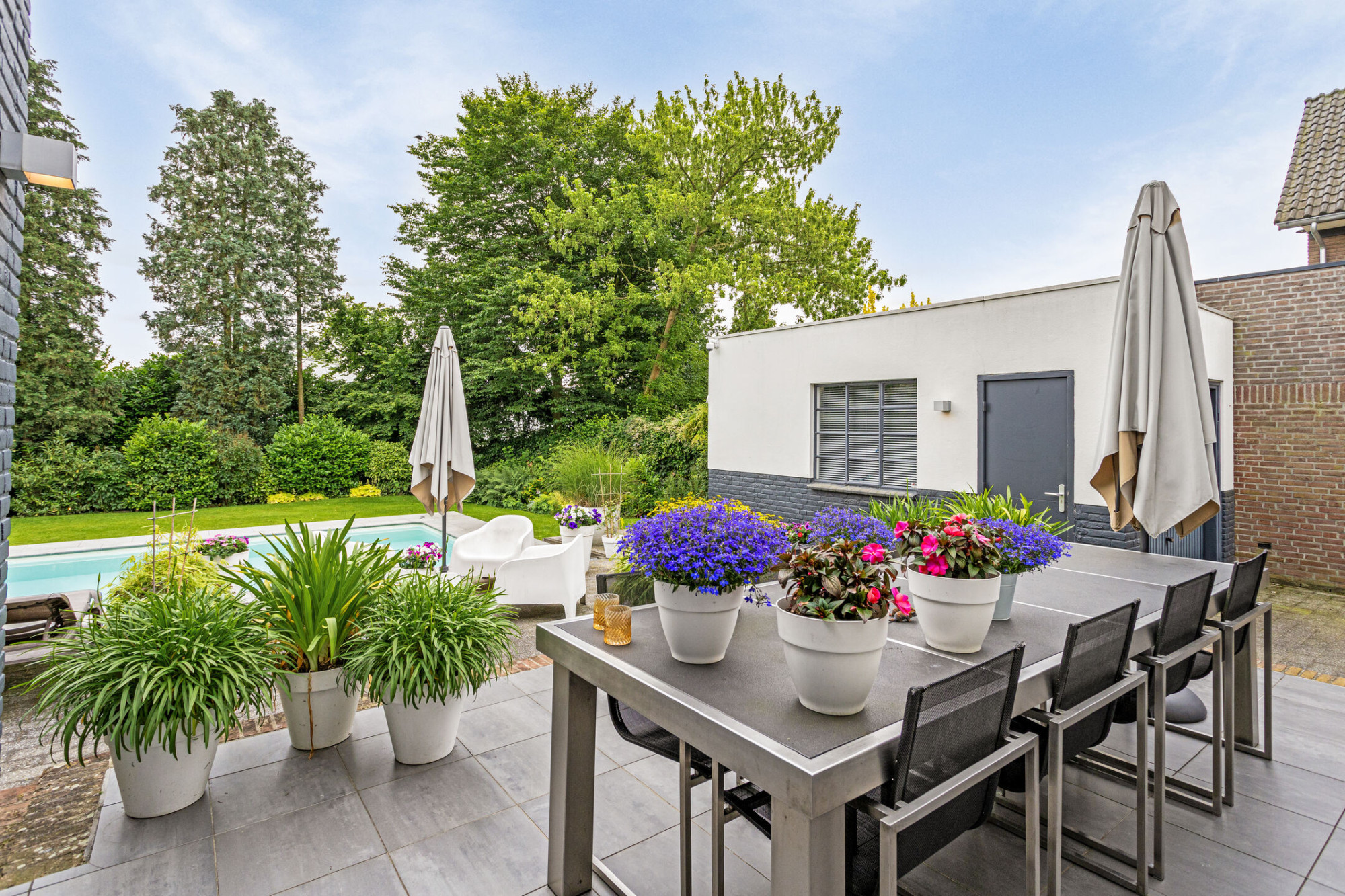 Achtertuin met terrassen, gazon, aanplanting, verwarmd zwembad (8.00 x 4.00 x 1.50 m) met warmte pomp, buiten douche en tuinberging. De tuin biedt een prima privacy waardoor ongestoord genieten elke dag mogelijk is.