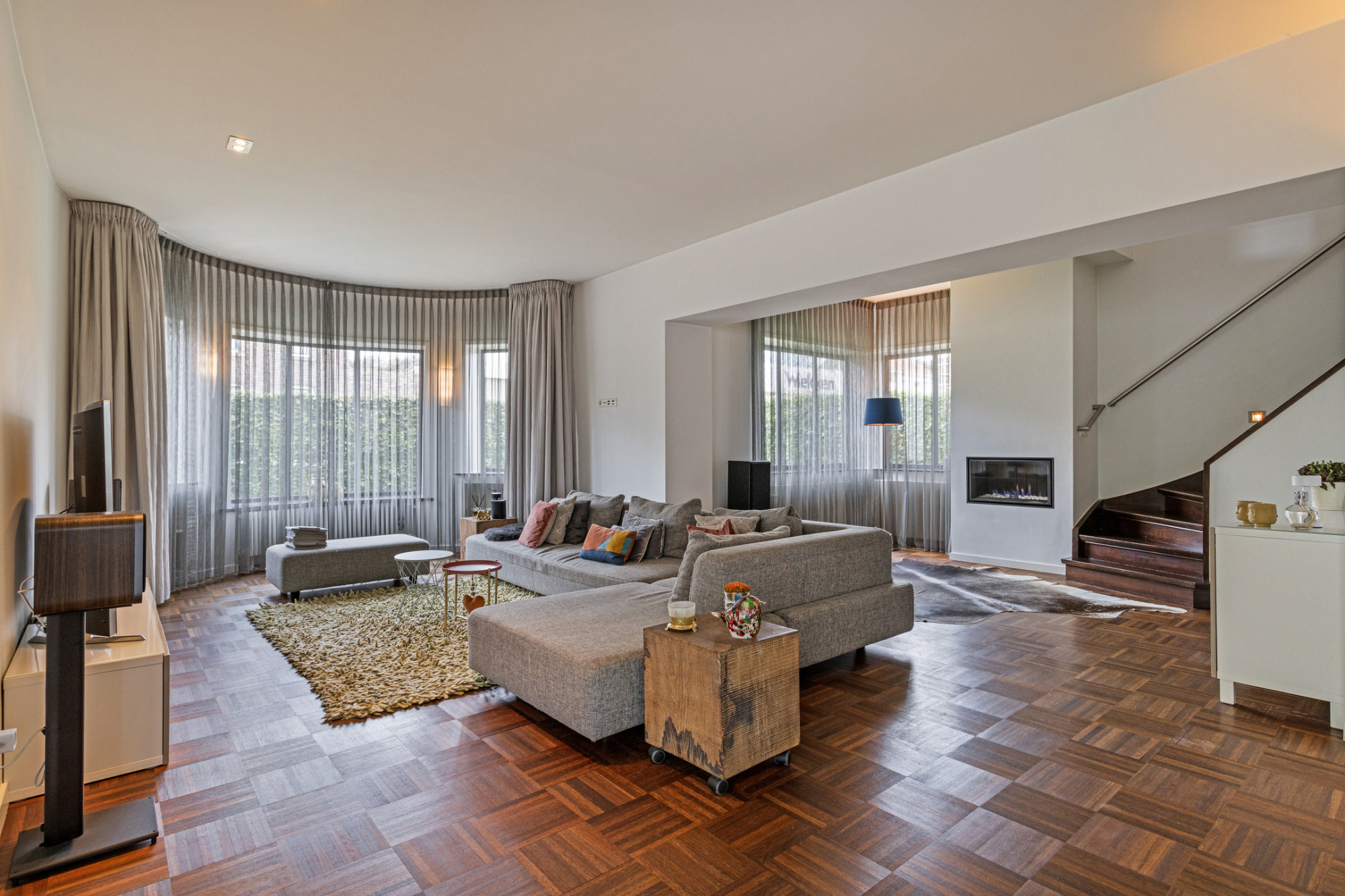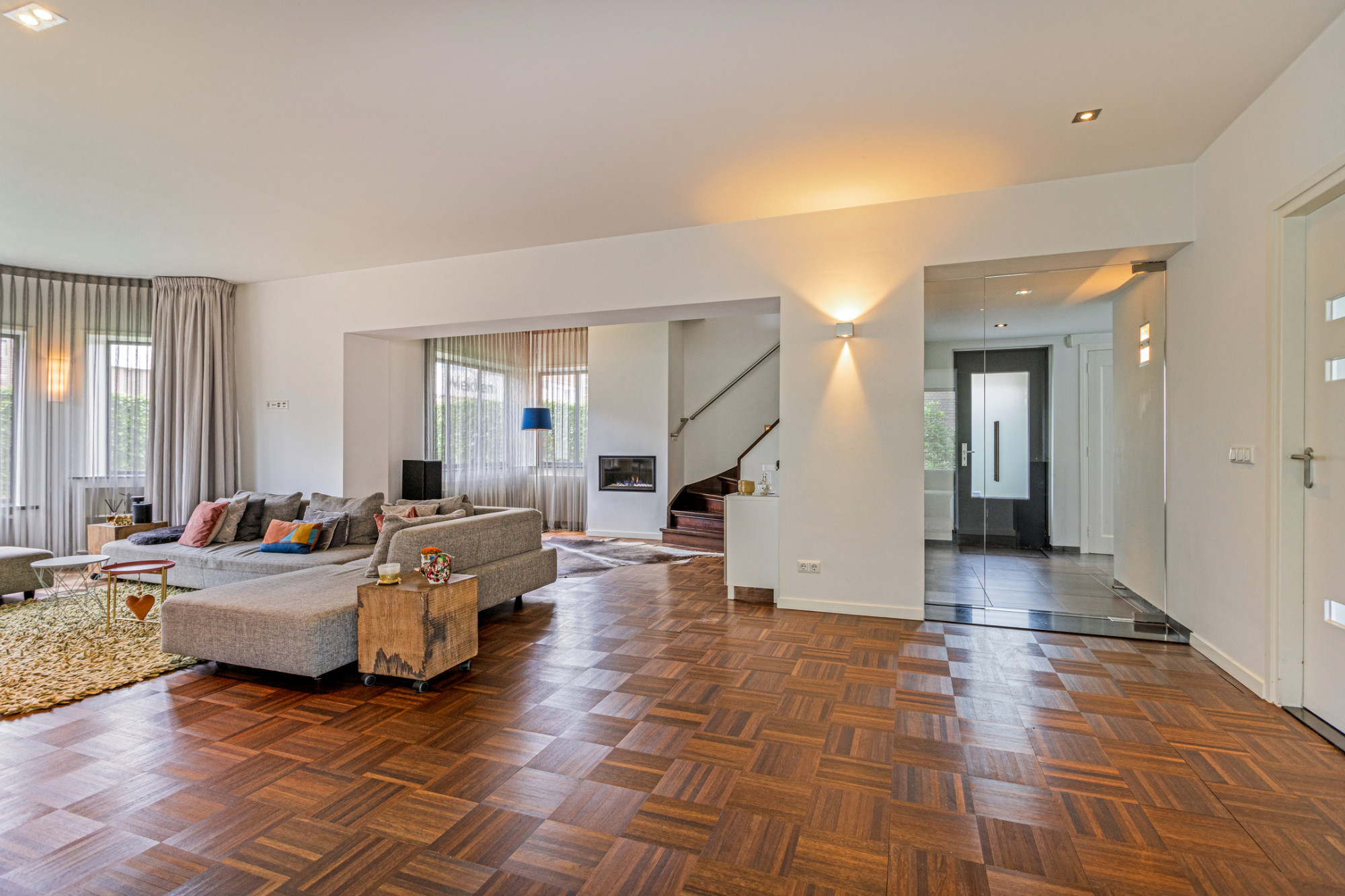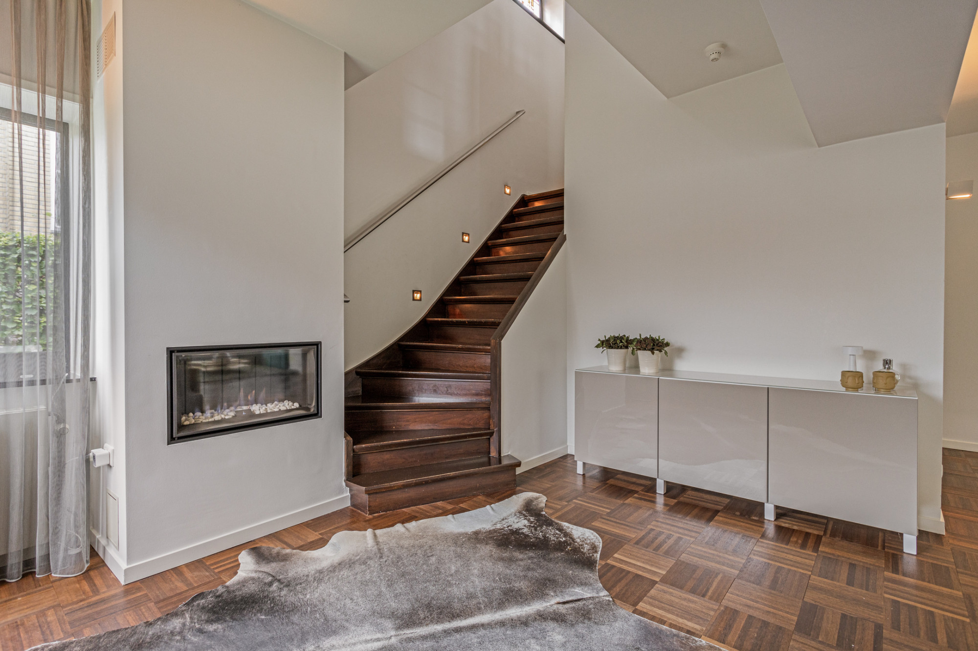 Living (circa 74 m2) voorzien van mooie parketvloer, gashaard en trap naar verdieping.