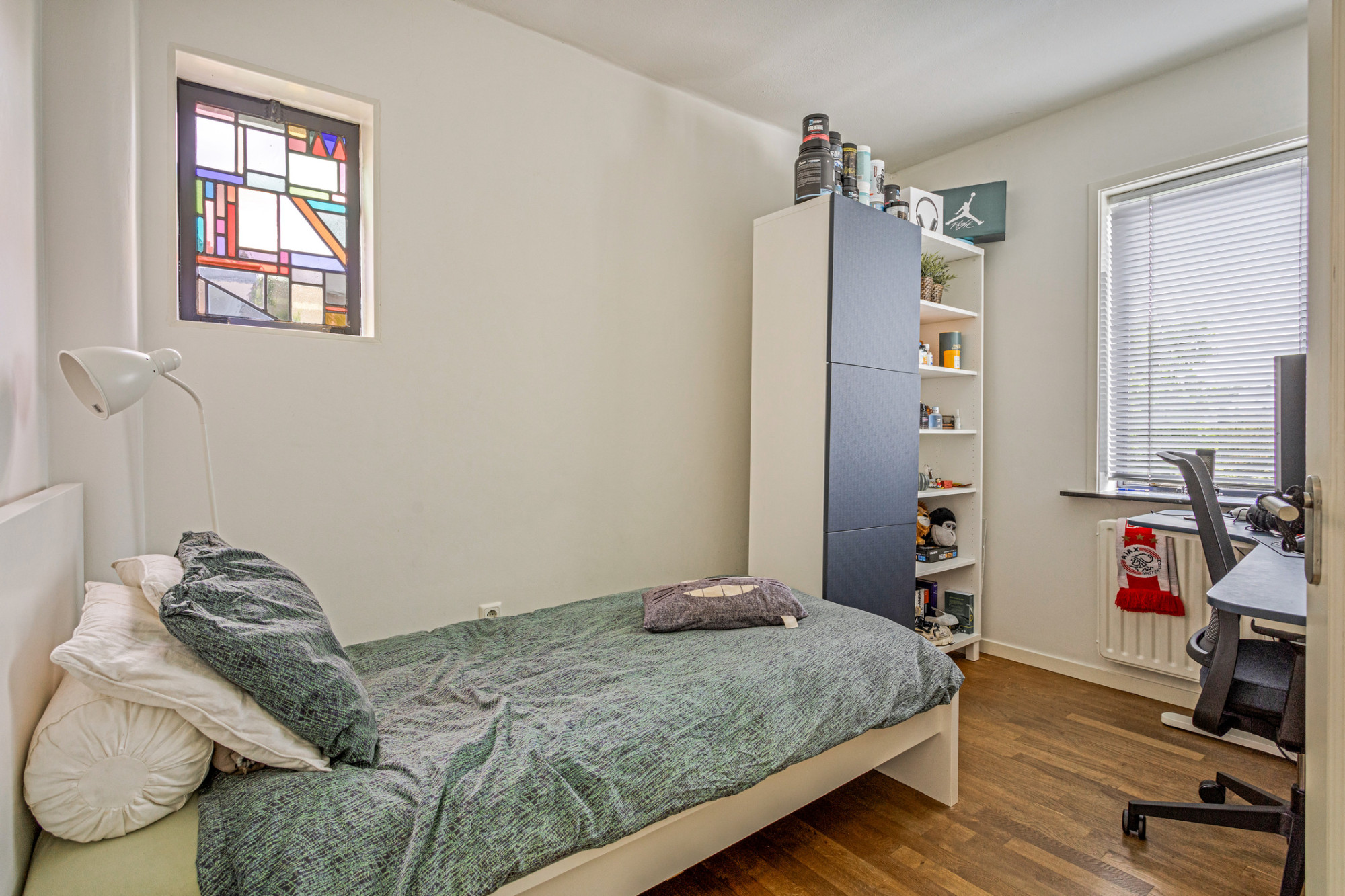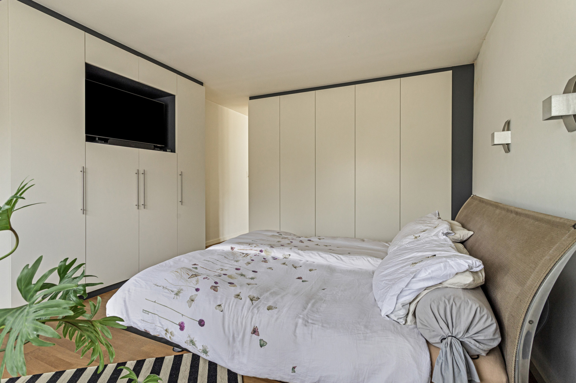 Zeer riante slaapkamer 1 (8.55 x 4.01 m) voorzien van parketvloer en met ruime kastenruimte. Tevens toegang tot dakterras (4.93 x 2.67 m) waar men ongestoord van de zonligging kan genieten of een ochtend ontbijtje.
