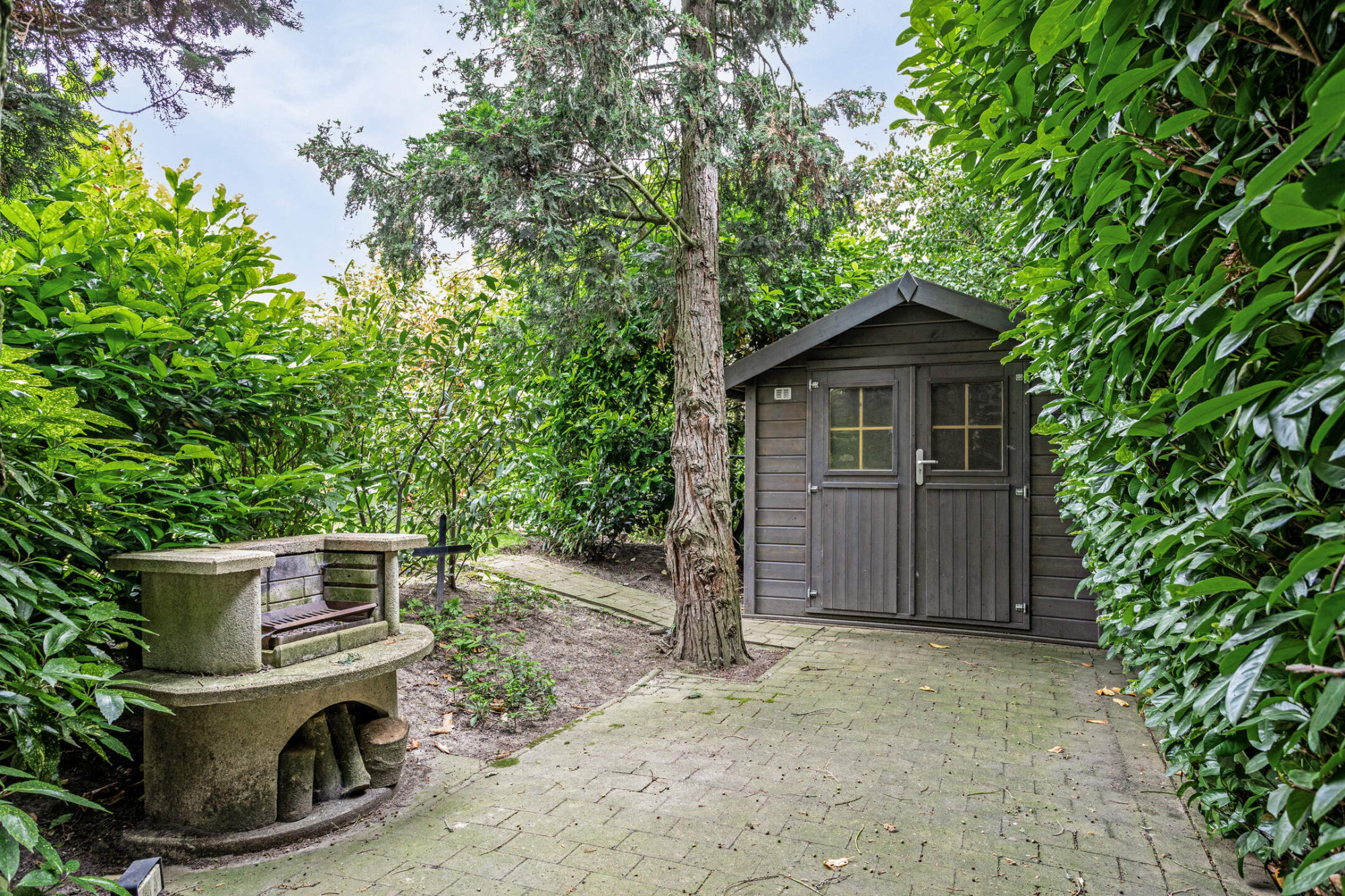 Het volledige perceel is omsloten door hekwerk en poorten en biedt daarmee veel privacy. De prachtig aangelegde tuin kent meerdere terrassen en niveaus, waaronder een schaduwterras met bomen alwaar zich ook het tuinhuis bevindt en een vaste tuinhaard annex barbecue.