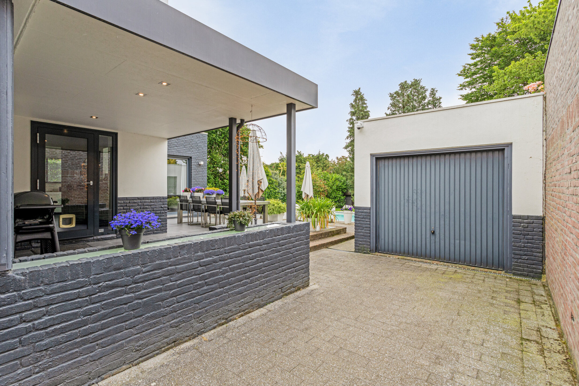 Ruime voortuin voorzien van hekwerk met schuifpoort en loopdeur. Bestrating naar entree en garage/berging. Tevens bevindt zich een oplaadpunt voor elektrische auto aan de voorzijde.