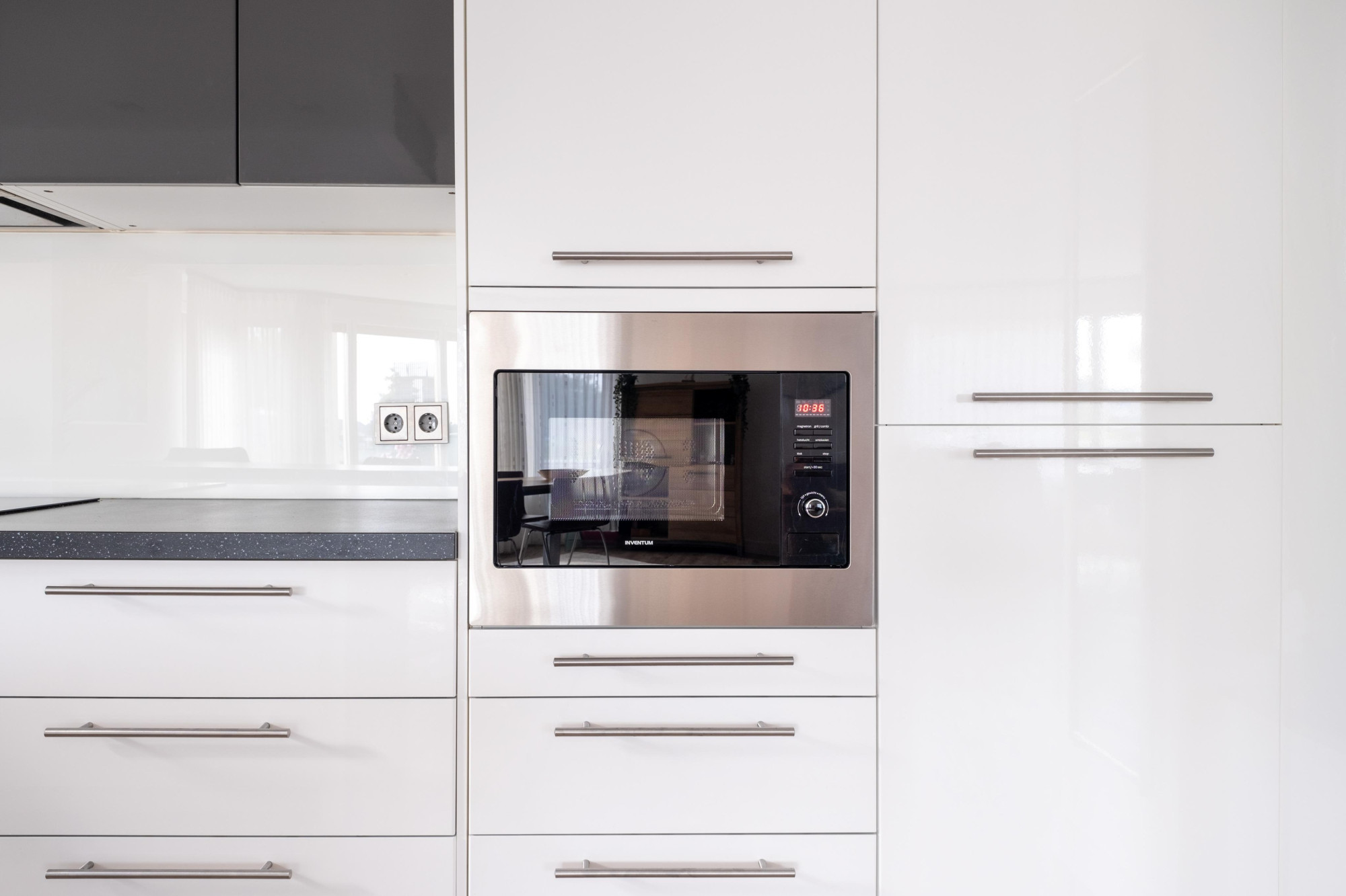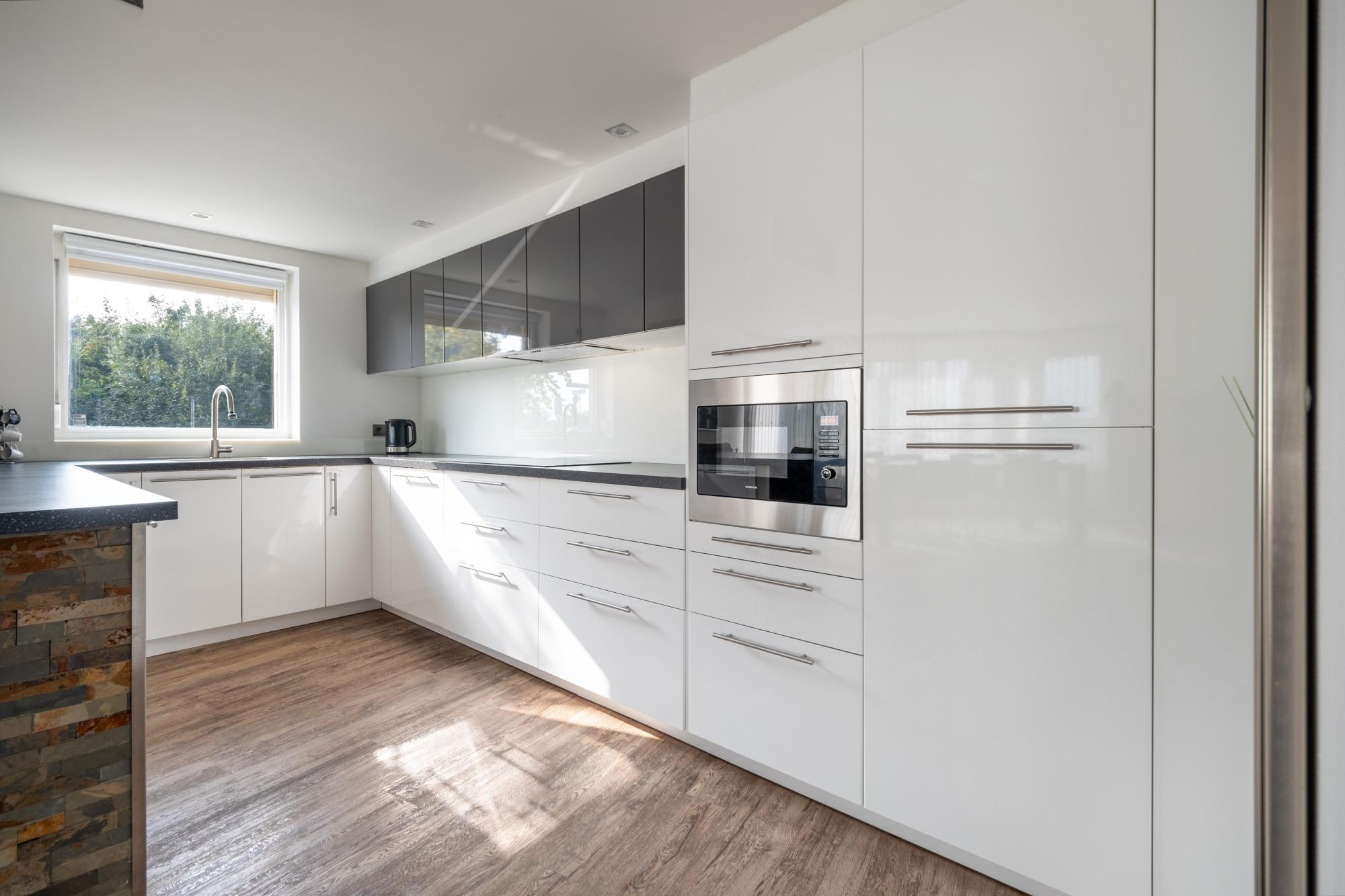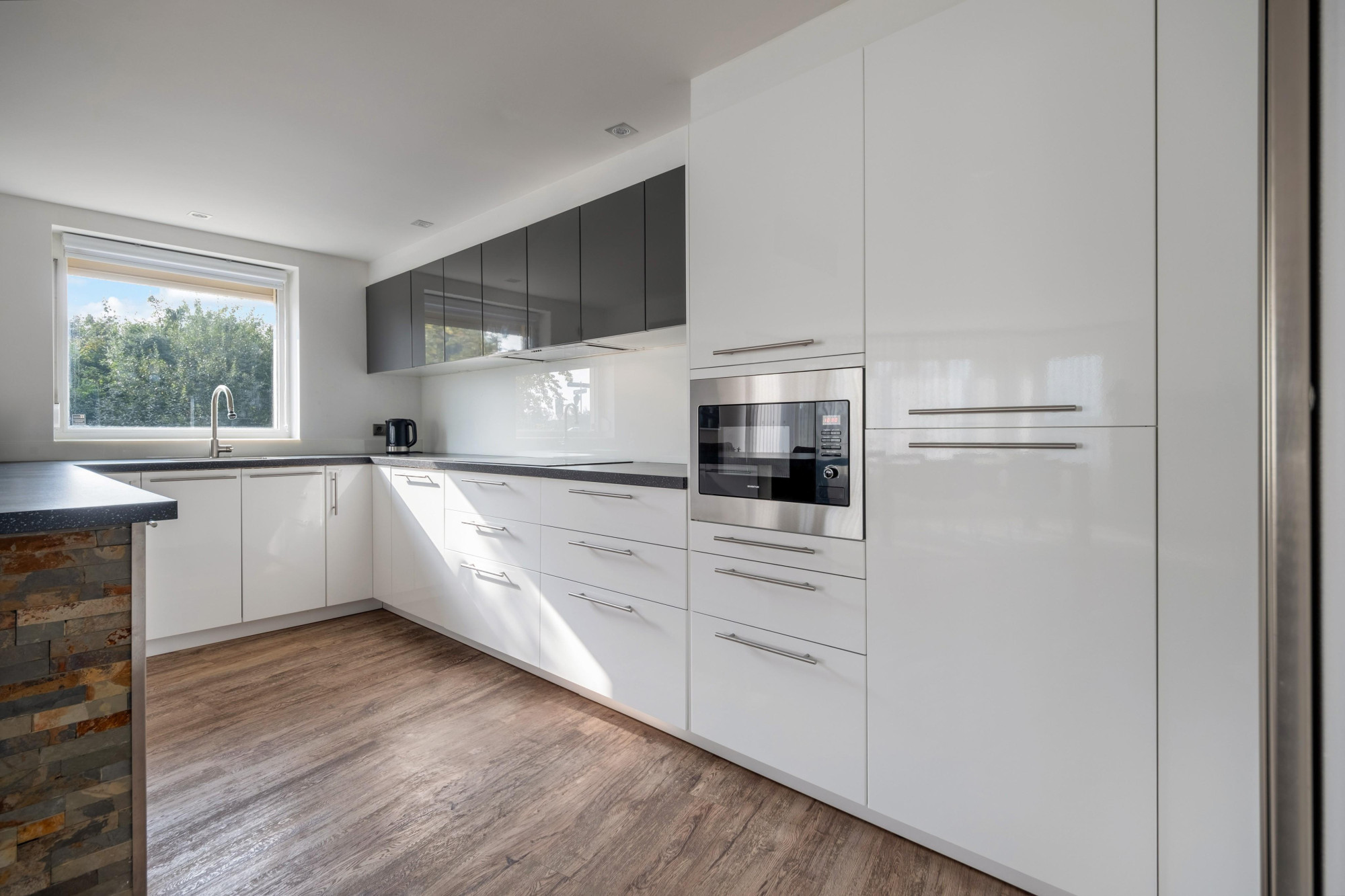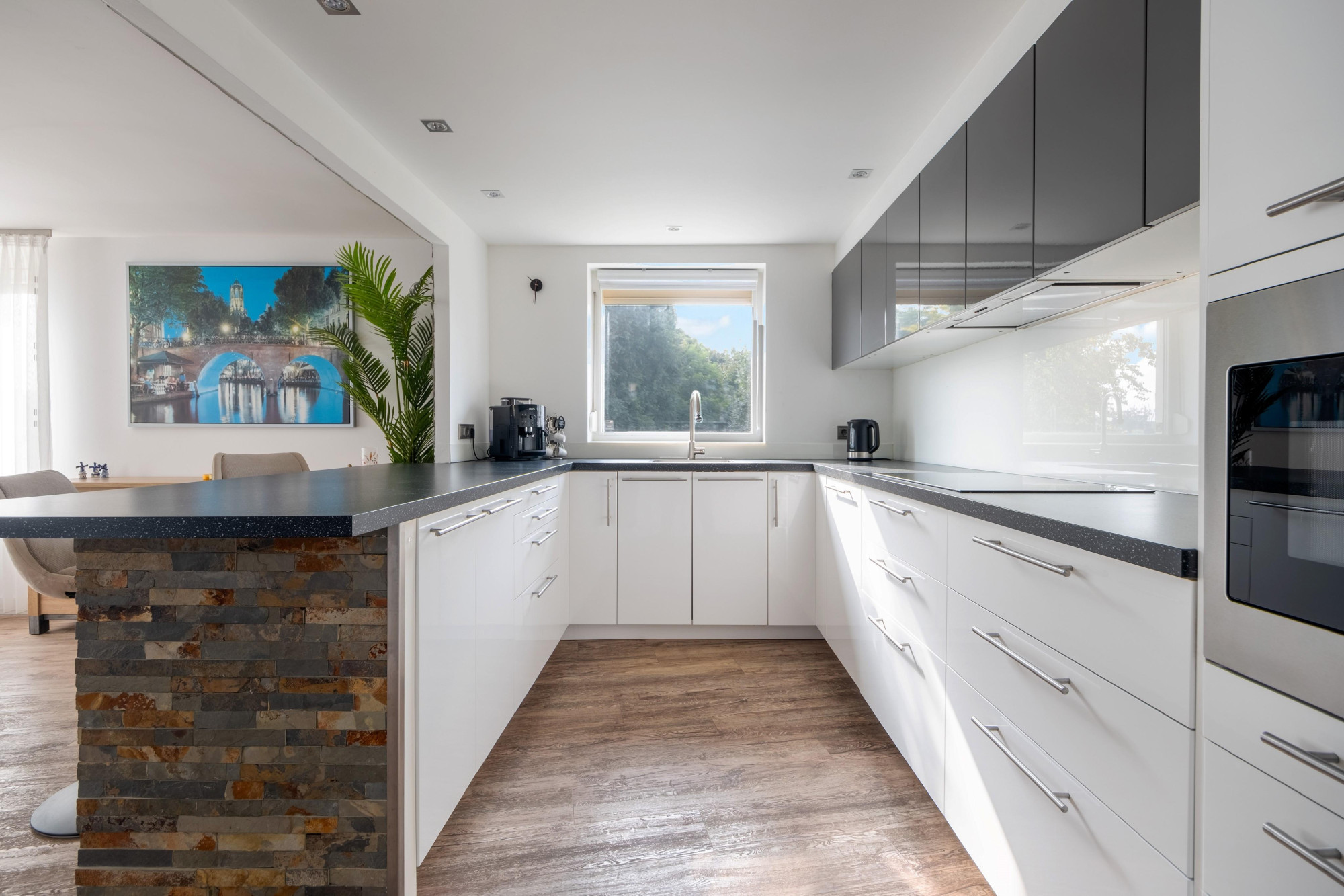 een open luxe aanbouwkeuken met keukenapparatuur w.o. een keramische kookplaat, koel/vriescombinatie, afzuigkap, vaatwasser en nieuwe combimagnetron (2024).