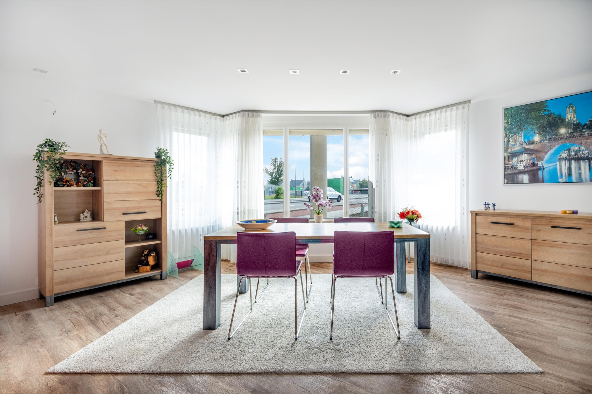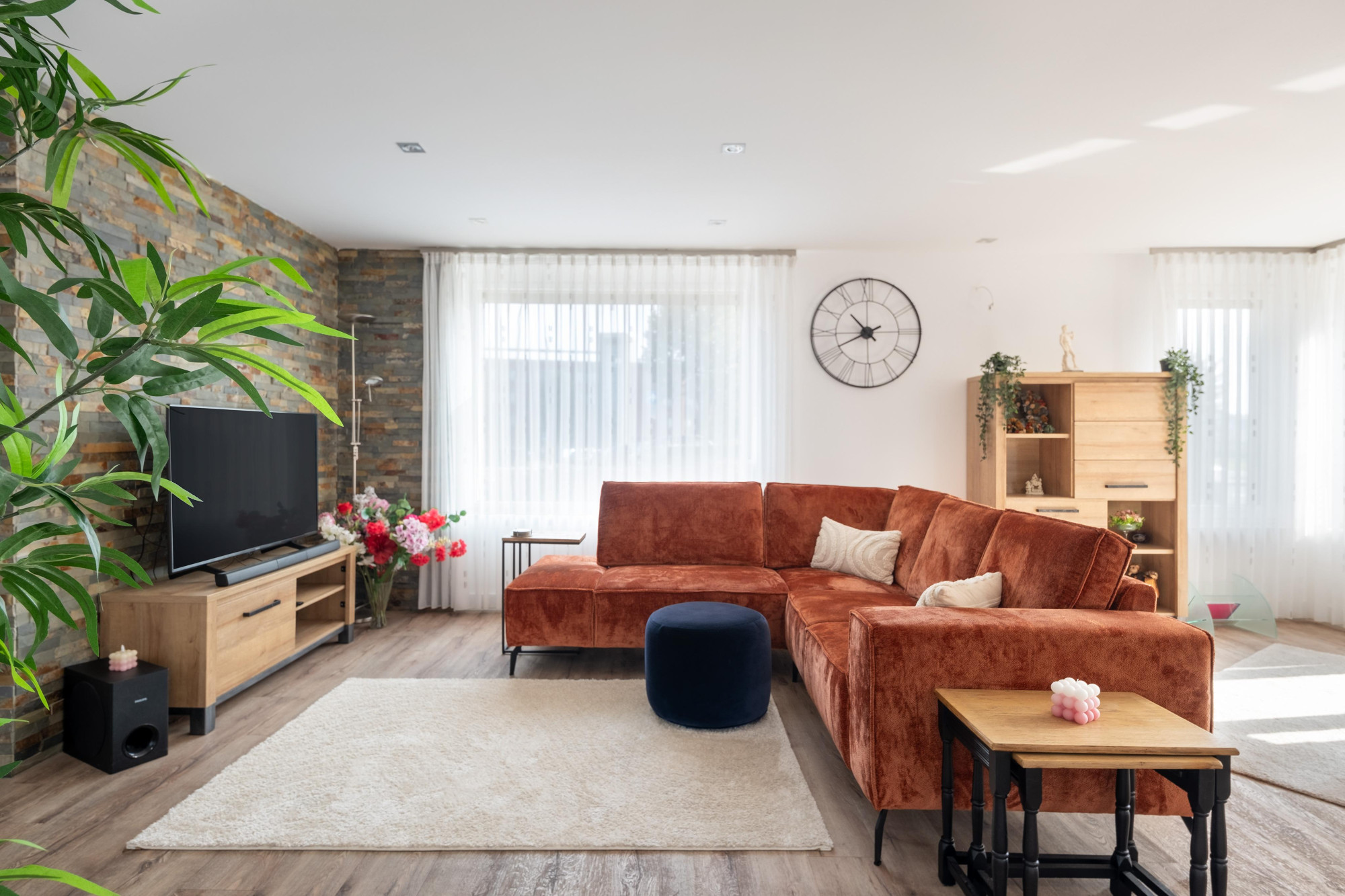 Zeshoekige woonkamer (9.20mx8.20m/4.40m) met pvc vloer en vloerverwarming, een grote erker met topuitzicht, muurkast,