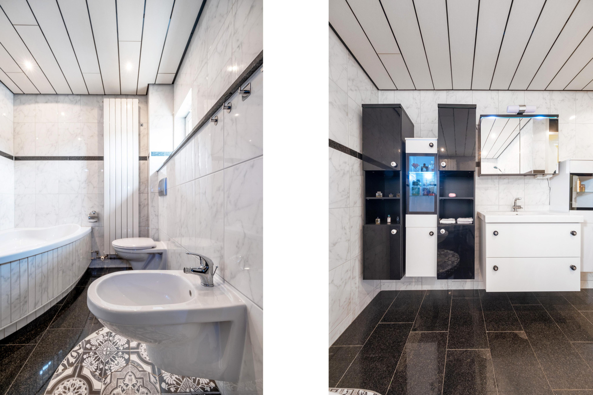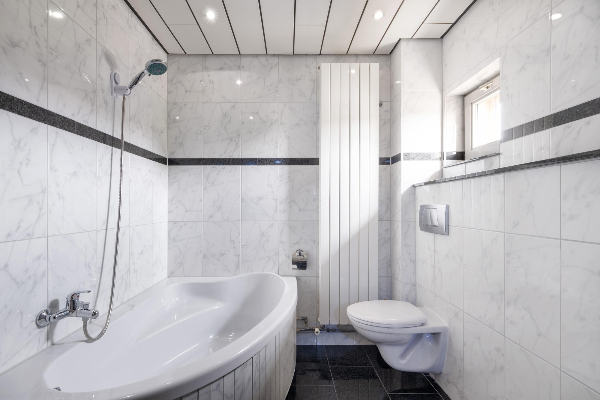 Badkamer(3.00mx2.00m/3.50m) met ligbad, douche, vaste wastafel, 2e toilet en bidet.