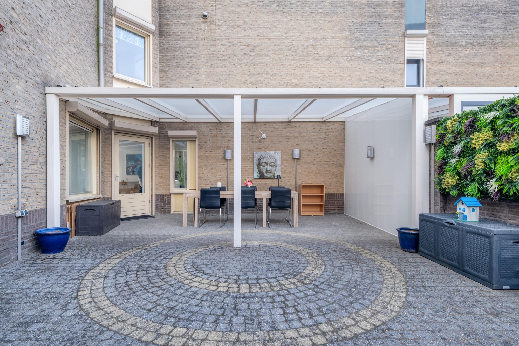 Gezellige beklinkerde tuin met berging aan de achterzijde.