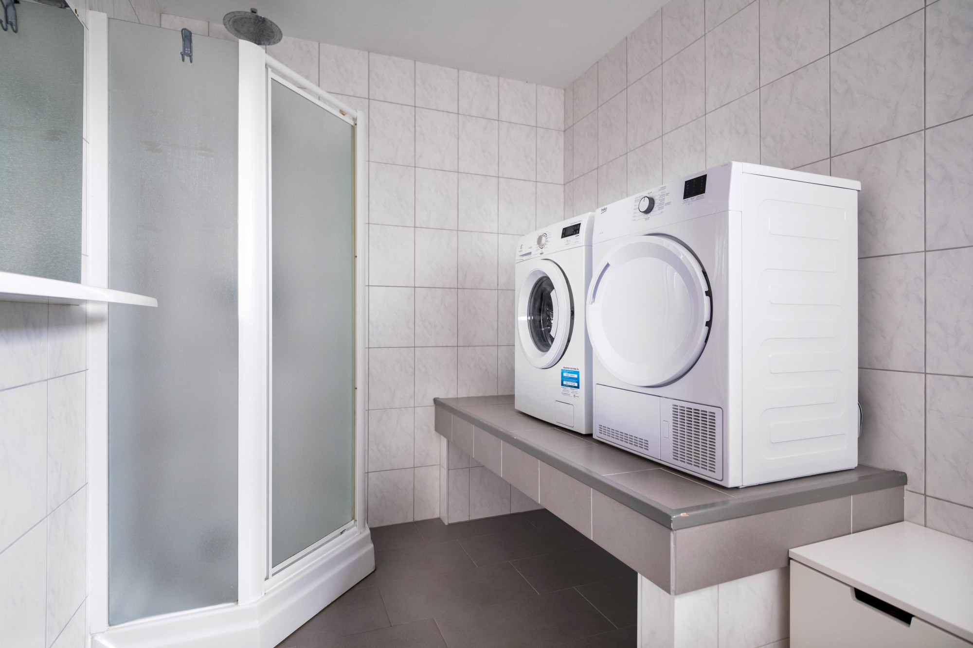Wasruimte met opstelplaats voor de wasmachine en droger plus een douche (3.40mx2.10m).