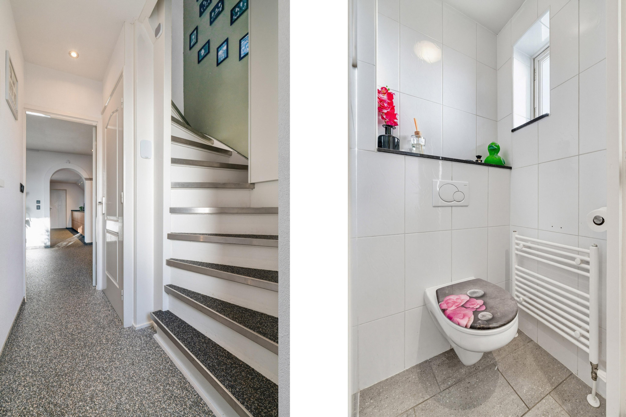 Entree met grindvloer, meterkast en volledig betegeld modern toilet met fonteintje.