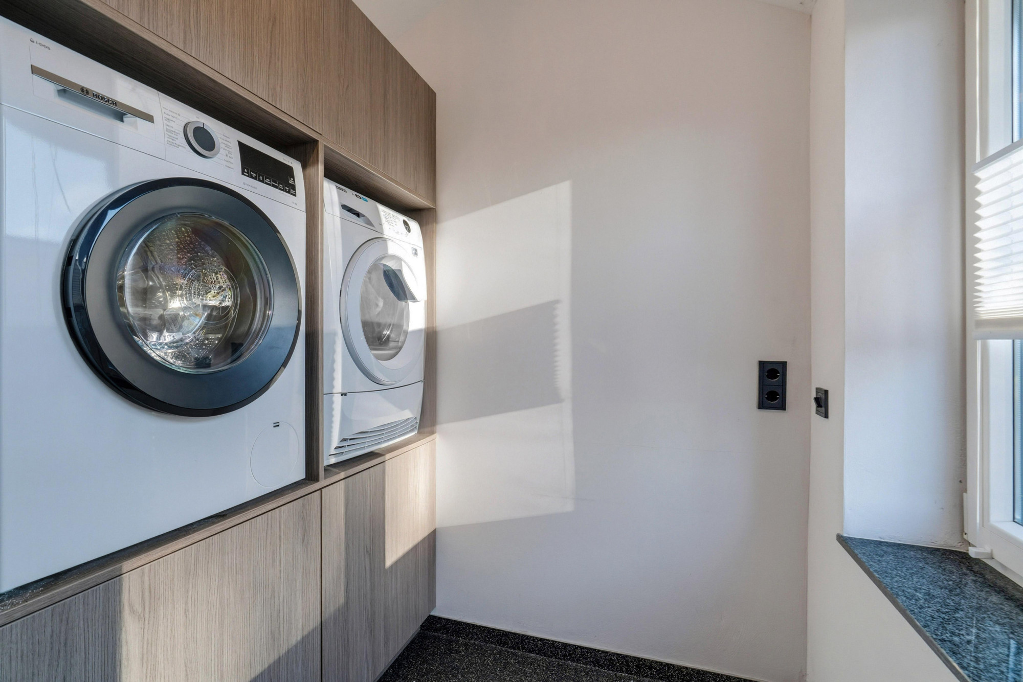 Provisieruimte, opstelplaats voor wasmachine en droger.