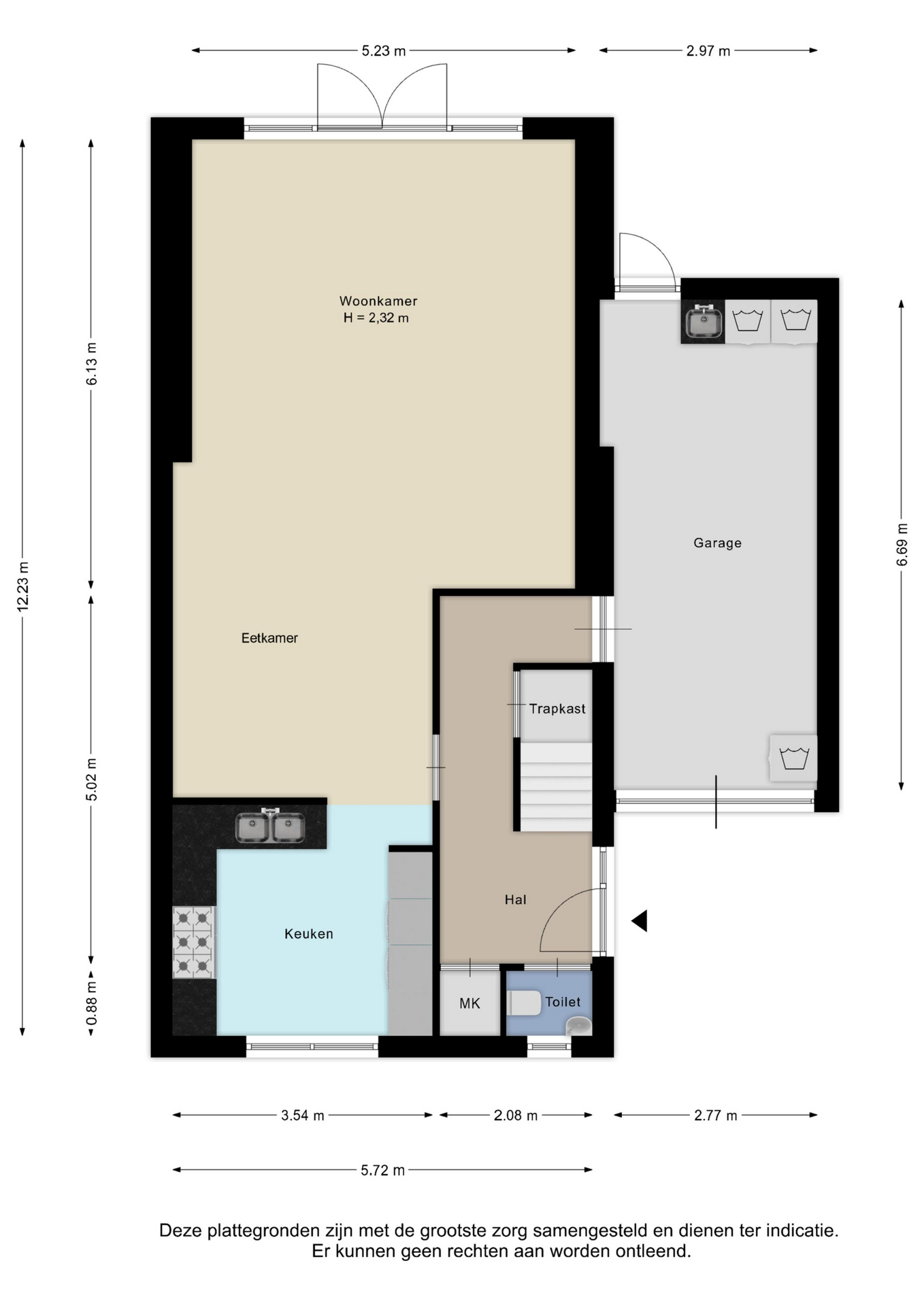 Alle door ons kantoor verstrekte informatie omtrent onroerende zaken, moet beschouwd worden als een uitnodiging om in onderhandeling te treden, en is geheel vrijblijvend! Alle vermelde maten en afmetingen zijn slechts bij benadering. Aan deze beperkte info kunnen geen rechten worden ontleend. Indien in enige documentatie of op enige website informatie staat die niet overeen komt met de werkelijkheid, dan geldt de feitelijke situatie waarin de woning zich bevindt, zoals koper deze tijdens de bezichtiging heeft kunnen waarnemen, en wordt de woning in deze feitelijke situatie/staat verkocht. Een (eventueel) bijgevoegde plattegrond dient uitsluitend als globale indicatie/visualisatie. Hieraan kunnen uitdrukkelijk geen rechten worden ontleend.