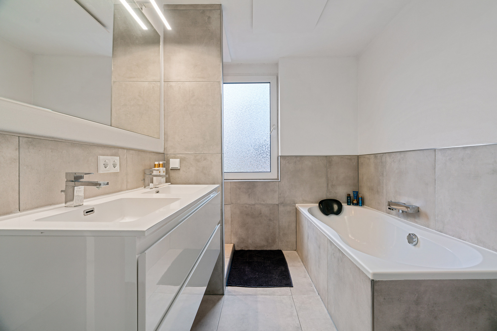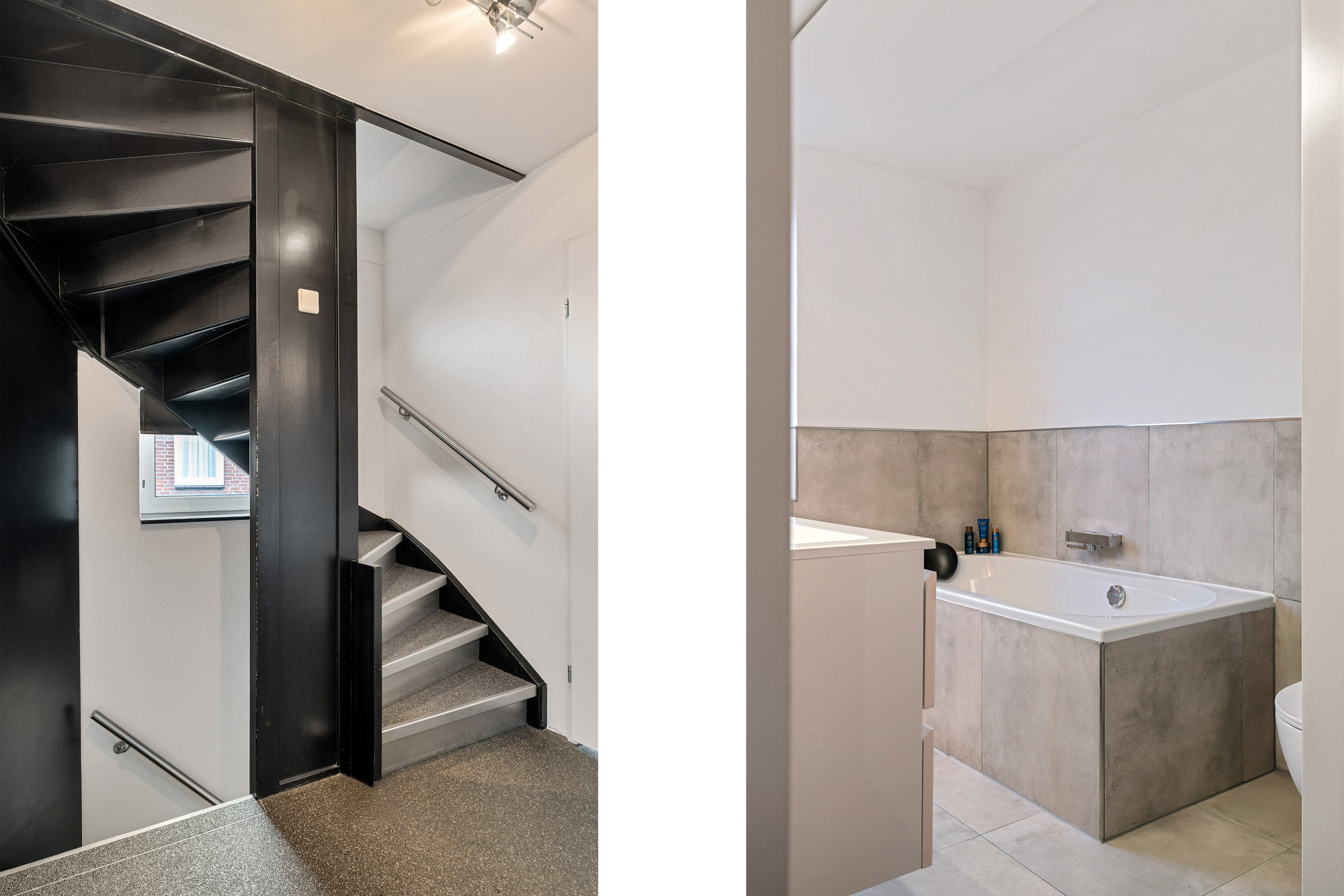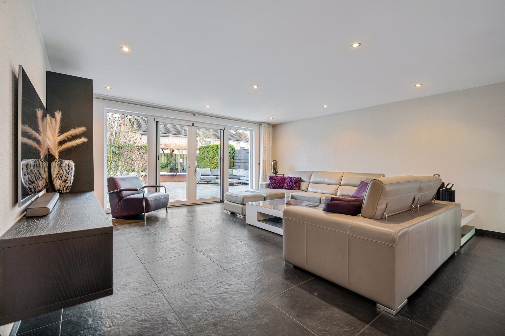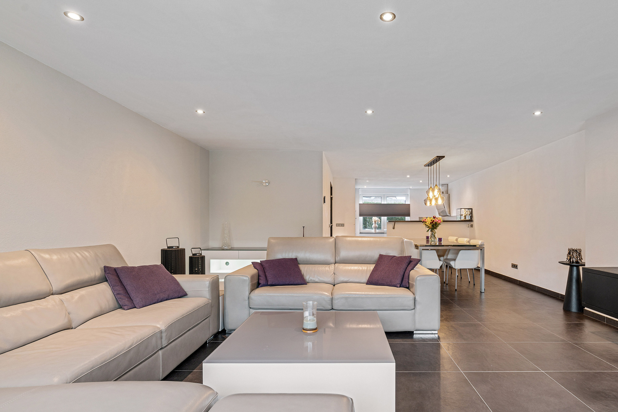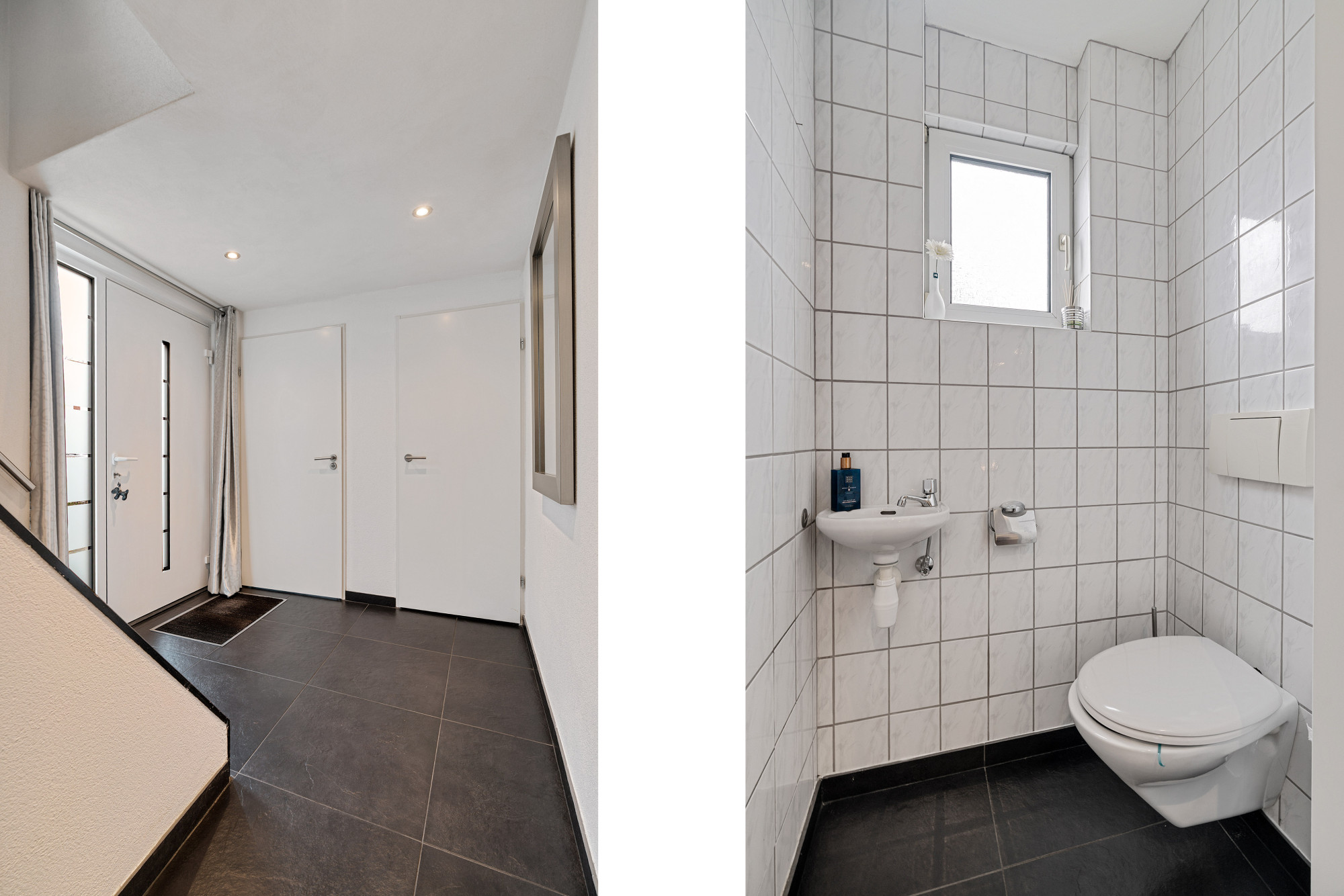 De gehele begane grond is betegeld en voorzien van vloerverwarming en sfeervolle spotverlichting. Het toilet is volledig betegeld en voorzien van een hangend closet en fonteintje.