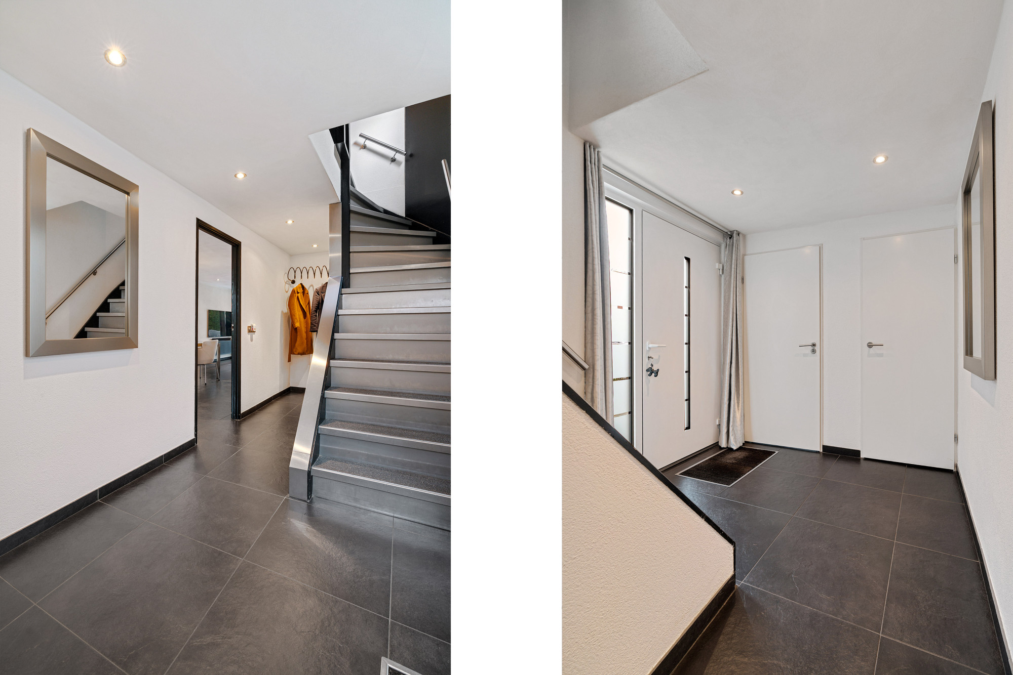 Bij binnenkomst betreedt u de ruime hal, die toegang biedt tot de moderne meterkast met handige opslagruimte, het toilet, de trapkast, de garage en de vaste trap naar de eerste verdieping.