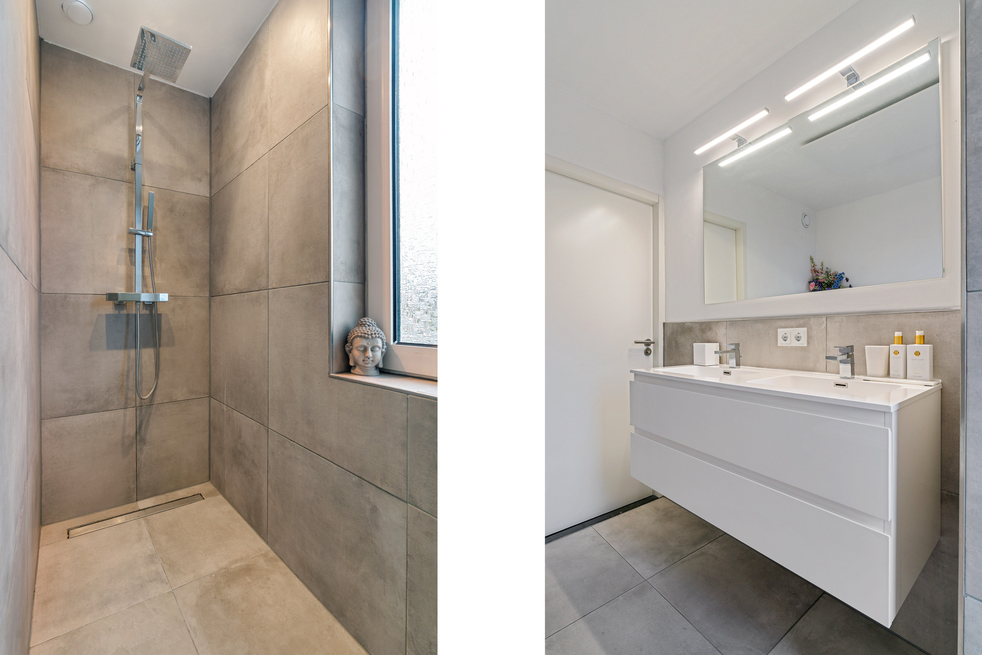 Op de eerste verdieping vindt u drie ruime slaapkamers, allen met grindvloer en handmatige rolluiken. De slaapkamer aan de achterzijde beschikt over een airco voor aangenaam comfort. De luxe betegelde badkamer is voorzien van een ligbad, toilet, inloopdouche en een dubbele wastafel met meubel. Vanuit de overloop is tevens de vaste trap naar de tweede verdieping bereikbaar.