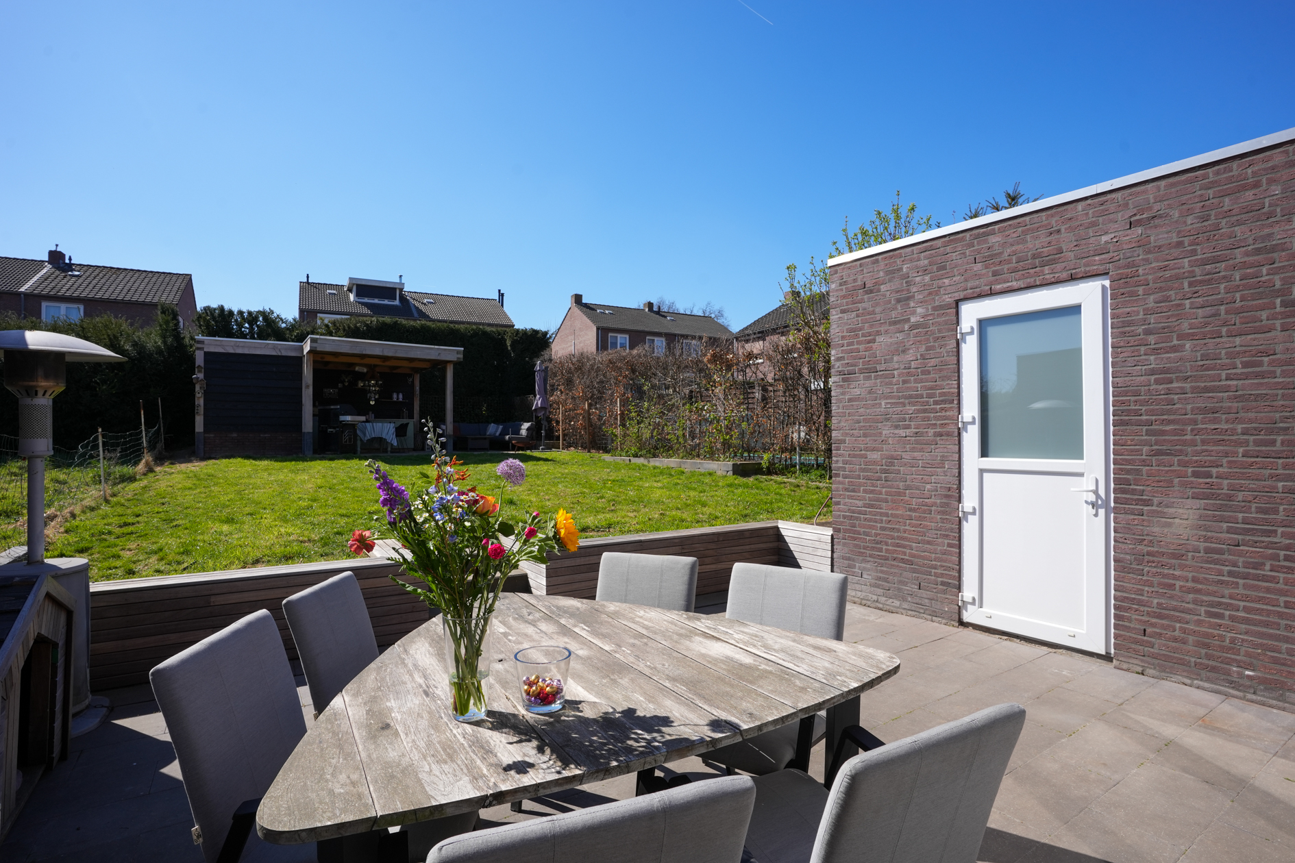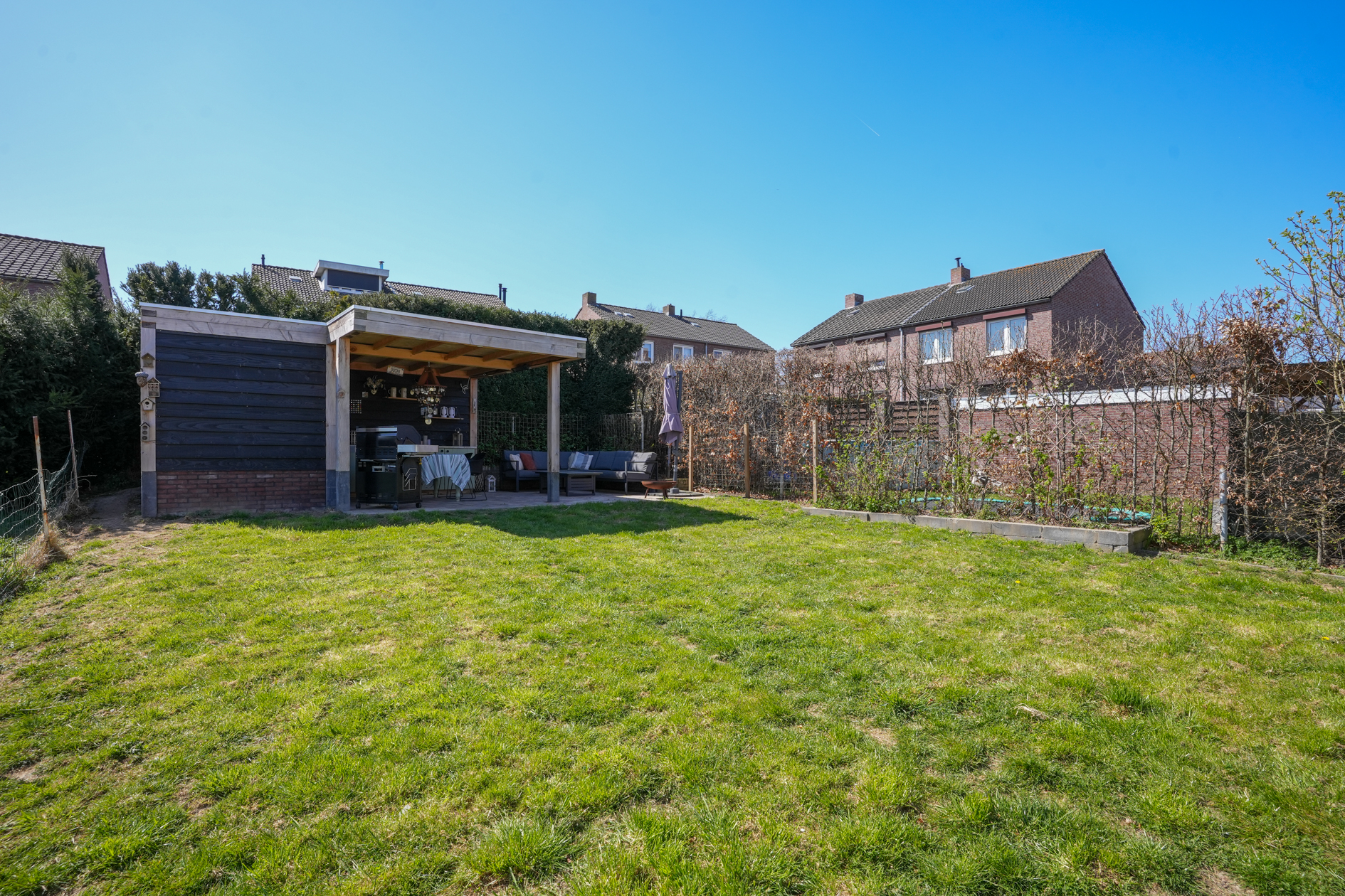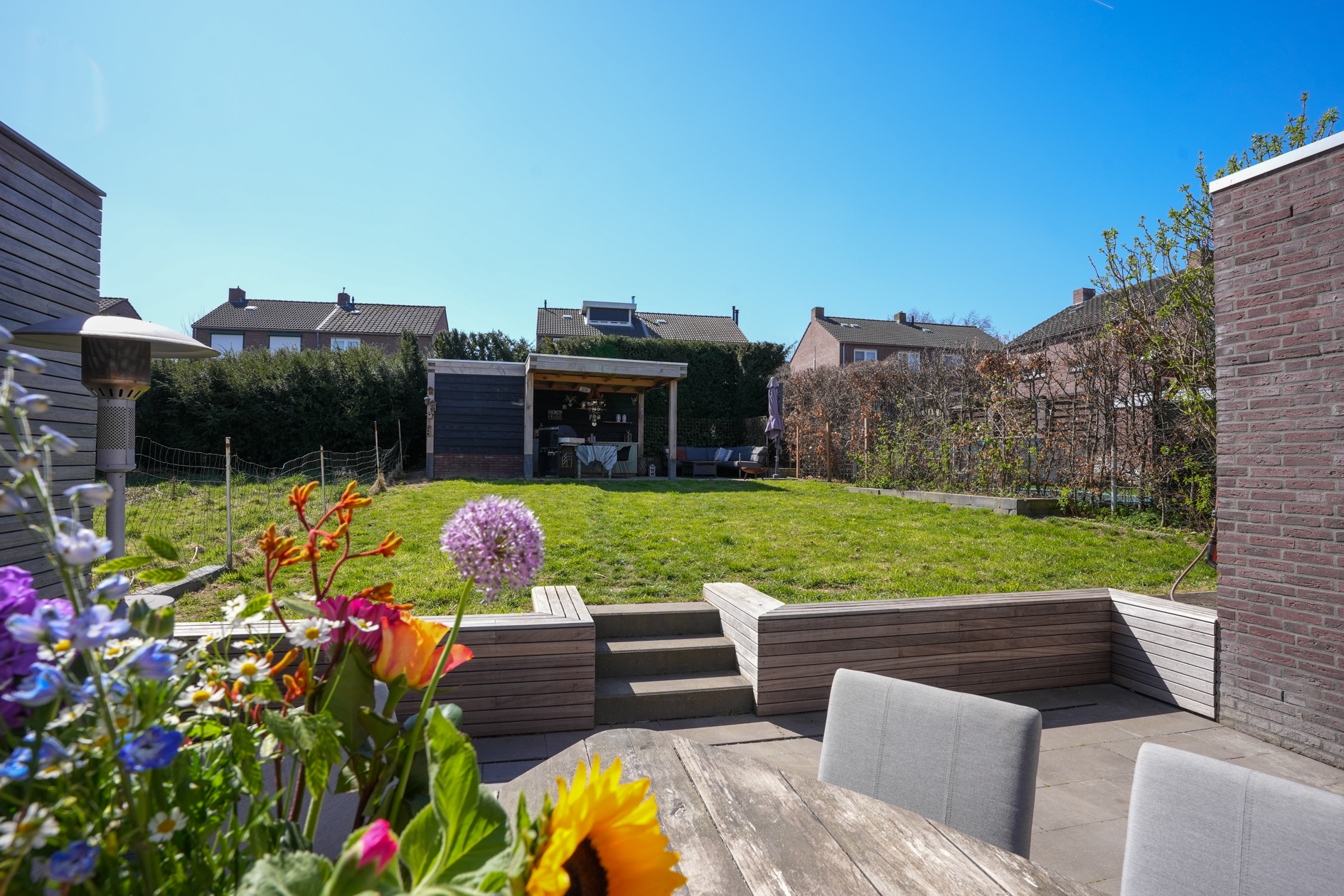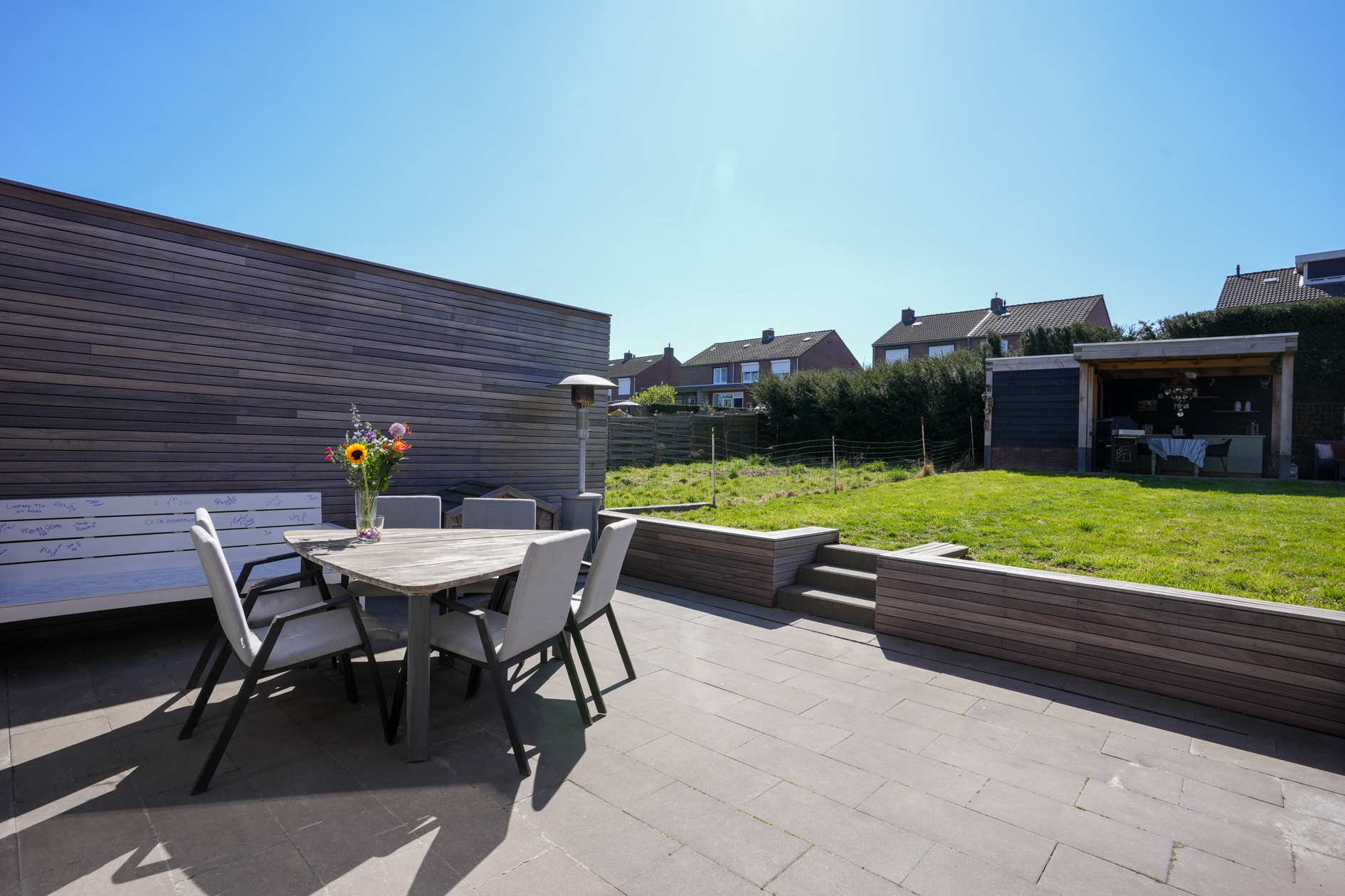 De verzorgde tuin met privacy heeft een tuinterras / berging met overkapping.