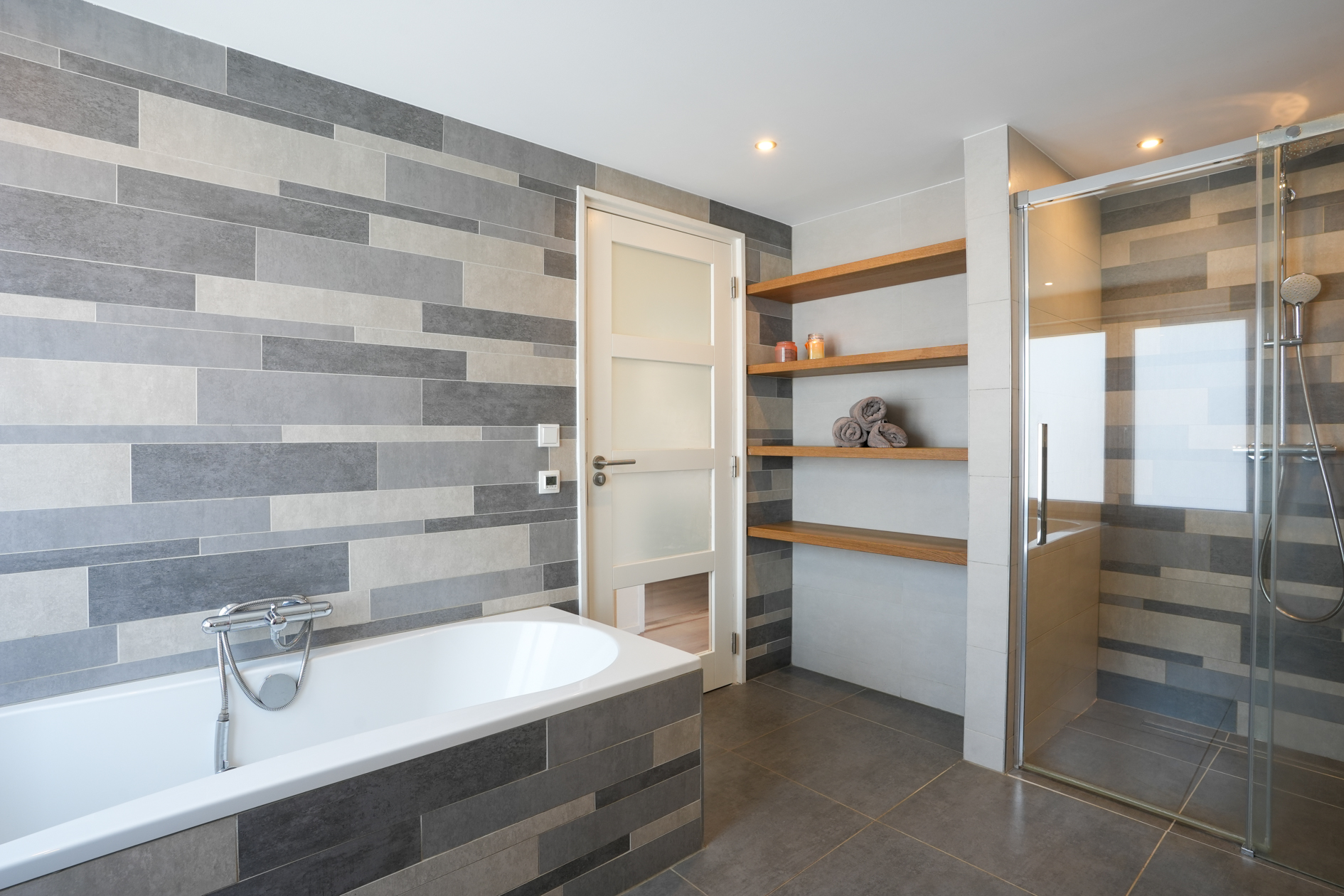 Verdieping: deze heeft een overloop (met vlizotap naar de zolder), badkamer is uitgerust met een ligbad, inloopdouche, wastafelmeubel, en toilet; geschakelde mechanische ventilatie.