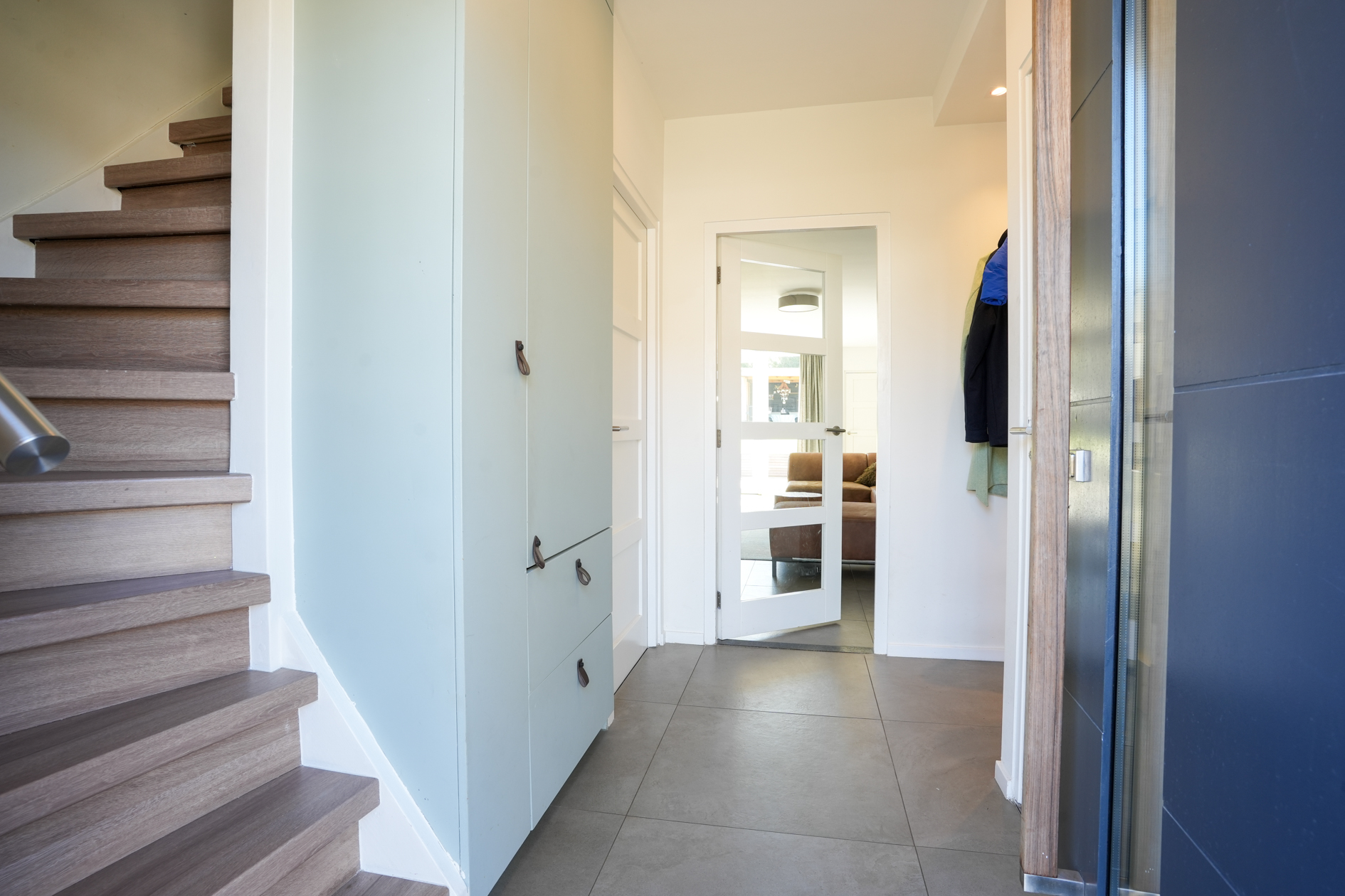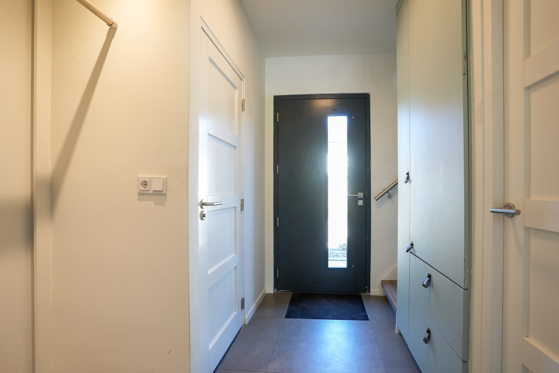 Begane grond: via de houten voordeur in houten kozijn betreedt men de entree/hal; deze is voorzien van tegels in een groot formaat, de wanden zijn strak gestukadoord. De toilet ruimte heeft een zwevend toilet en fonteintje. Garderobe en meterkast; de dichte houten trap verschaft toegang naar de verdieping.