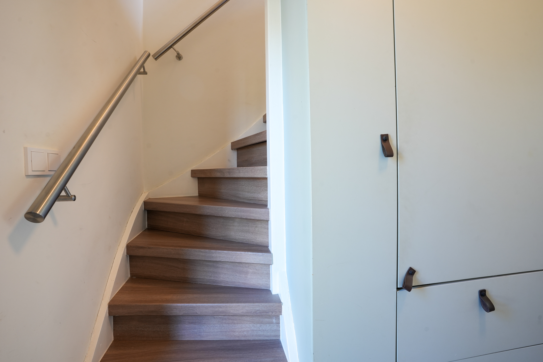 Kelder: open houten trap naar souterrain.