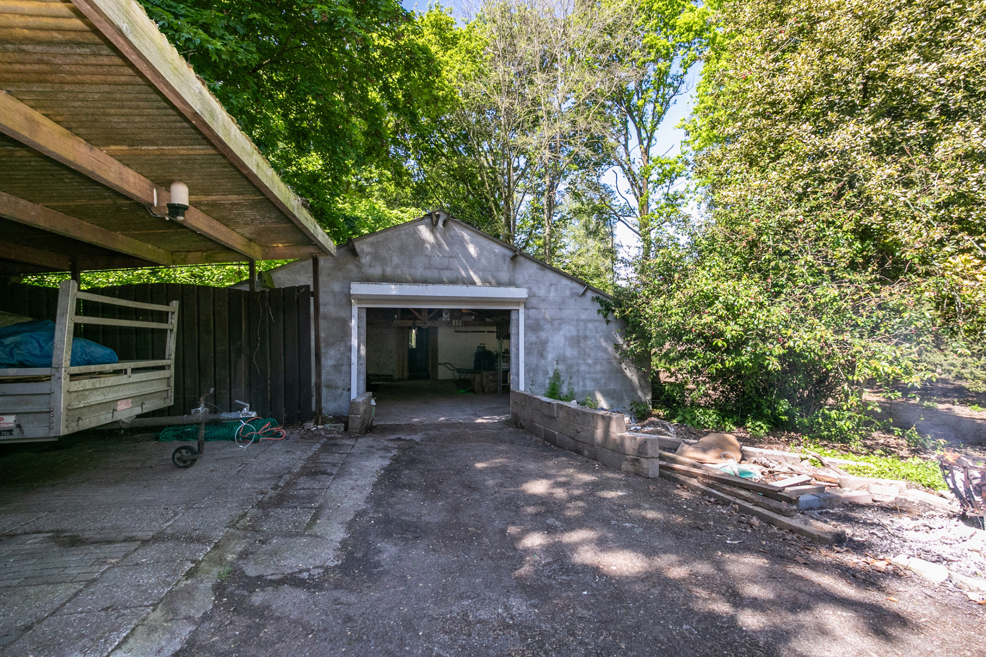 Een vrijstaande loods/werkplaats/garage van ruim 160 vierkante meter groot is gelegen westelijk van deze grote vrijstaande woning.