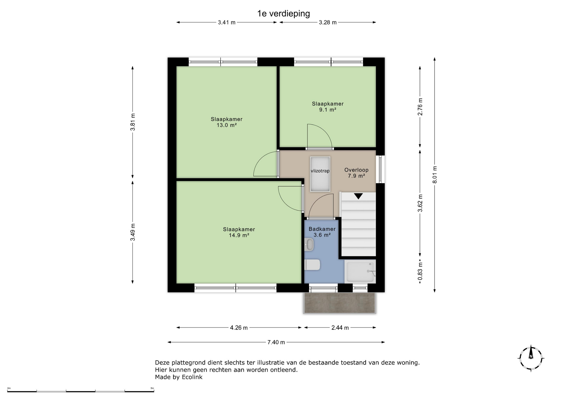 - Slaapkamer 3: ca. 3.28 x 2.76m.