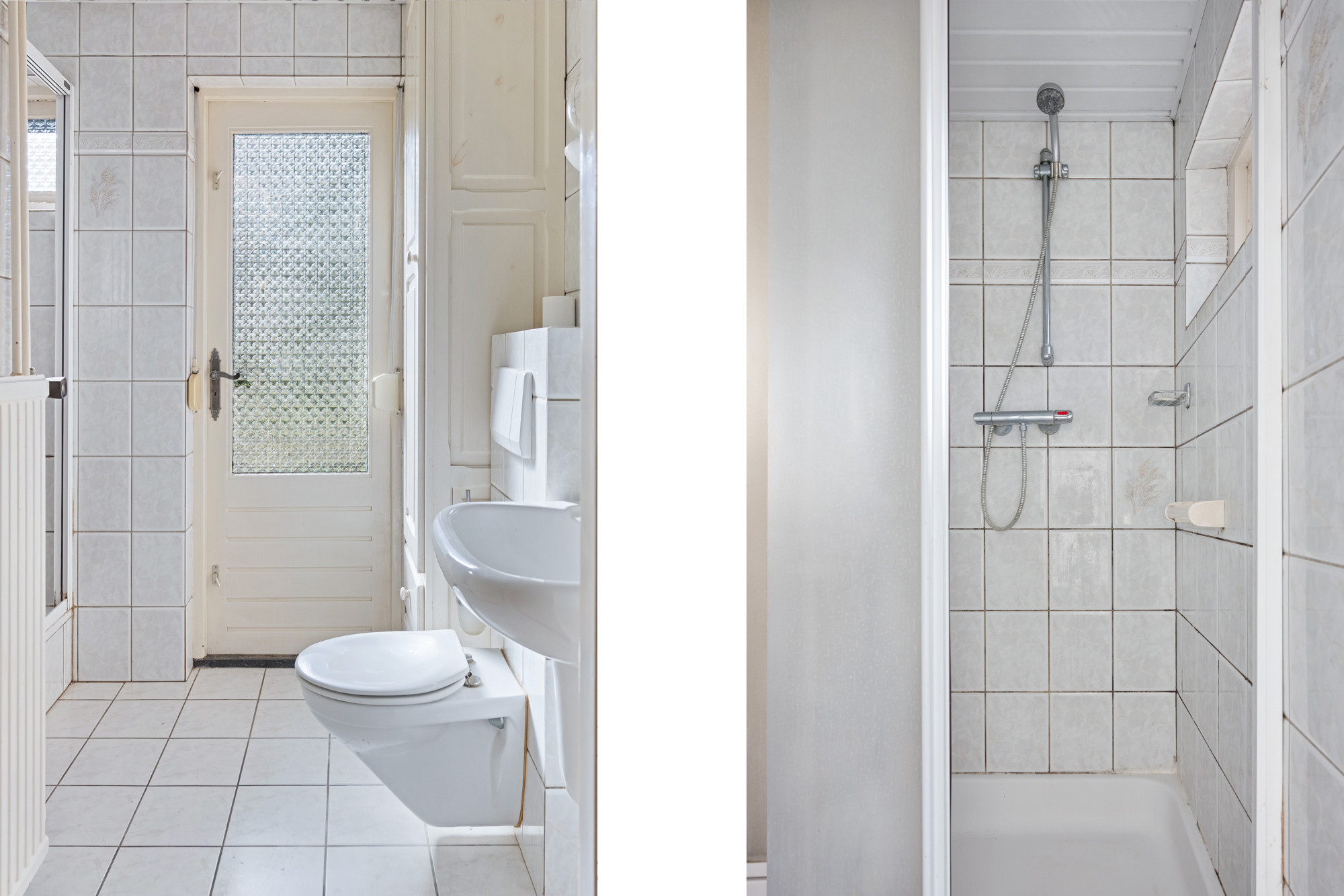De geheel betegelde badkamer (ca. 4 m²) is voorzien van een douche, 2de toilet en wastafel met spiegel. Ook is hier een deur naar een klein balkonnetje/terrasje.