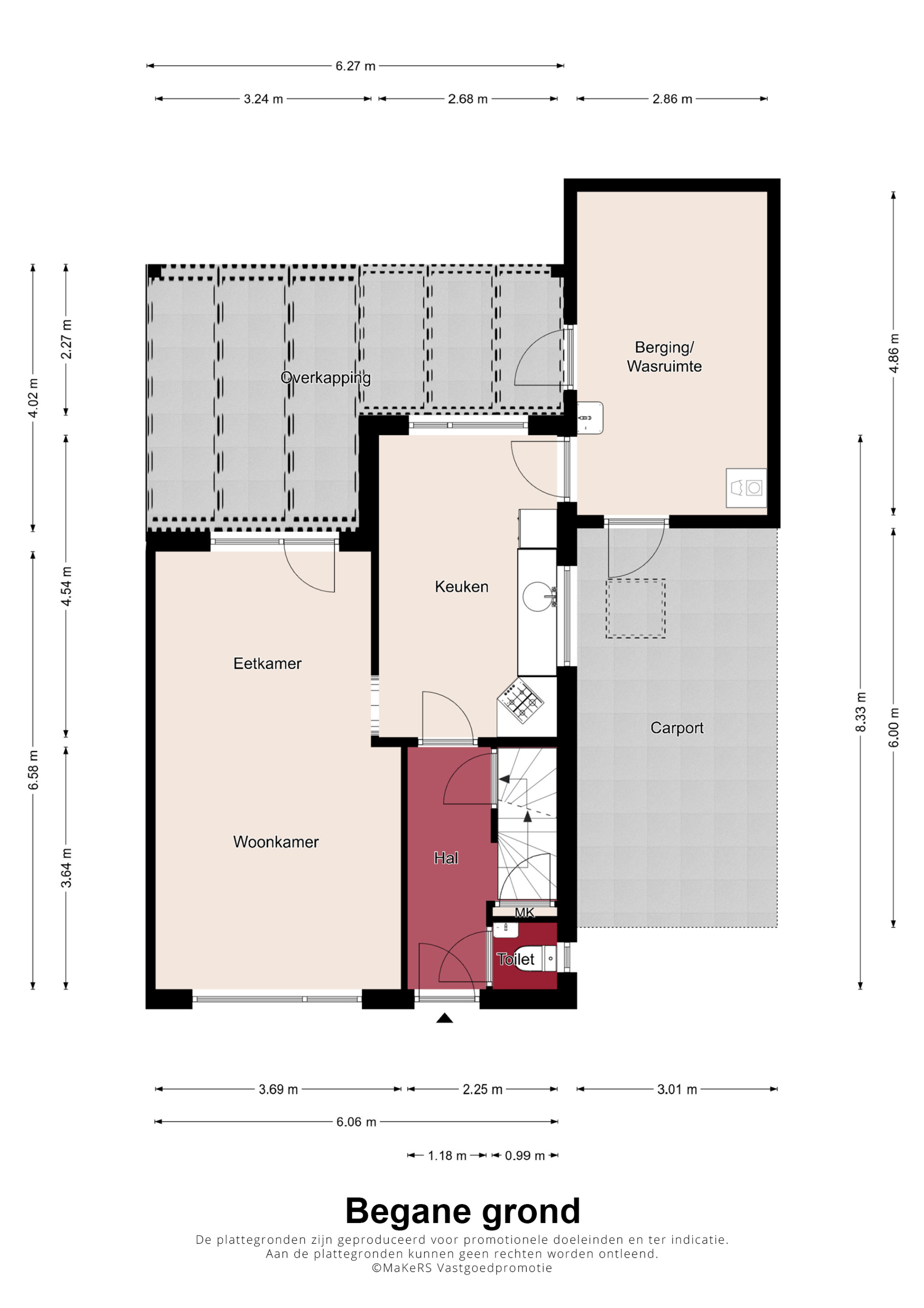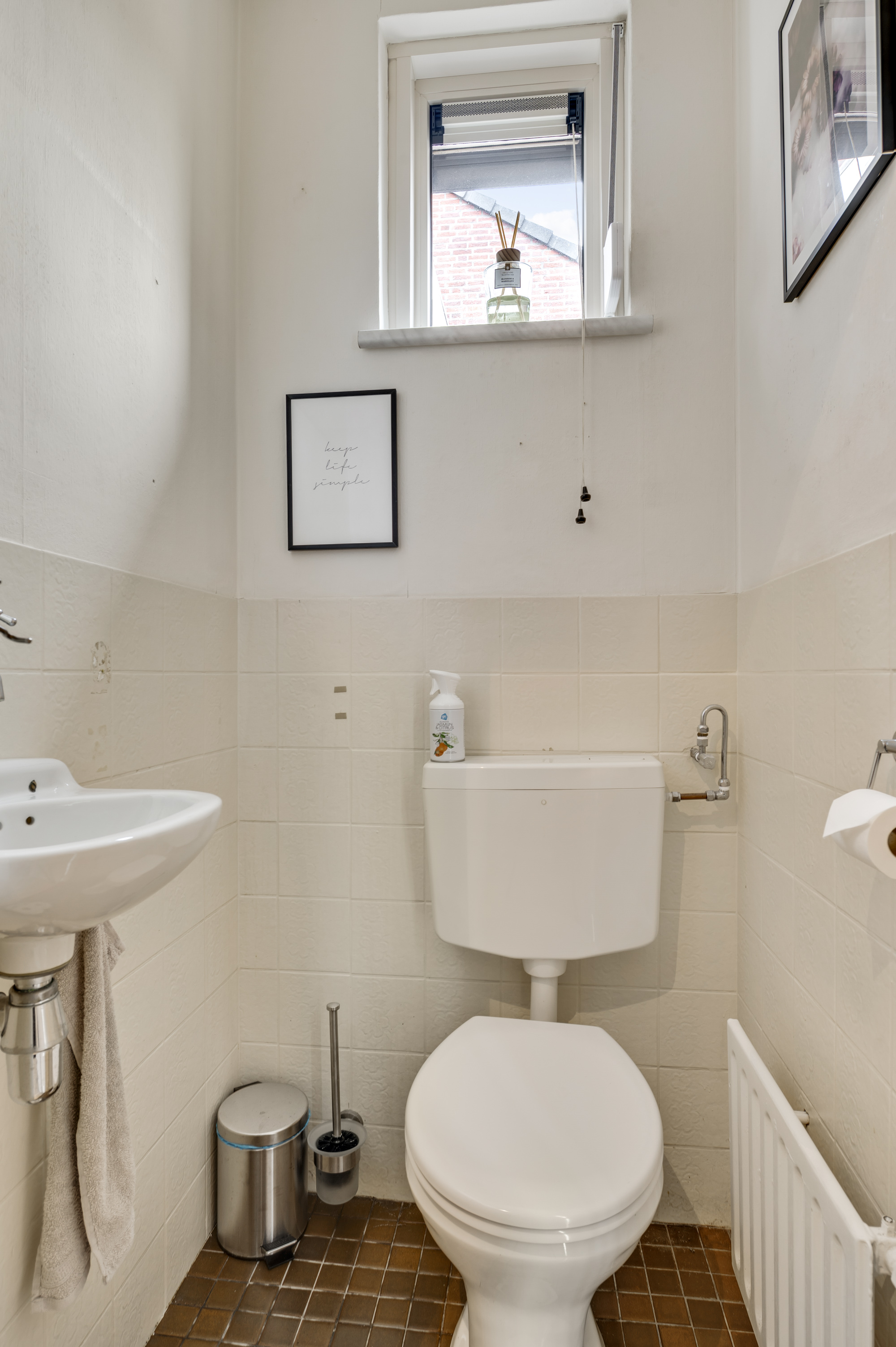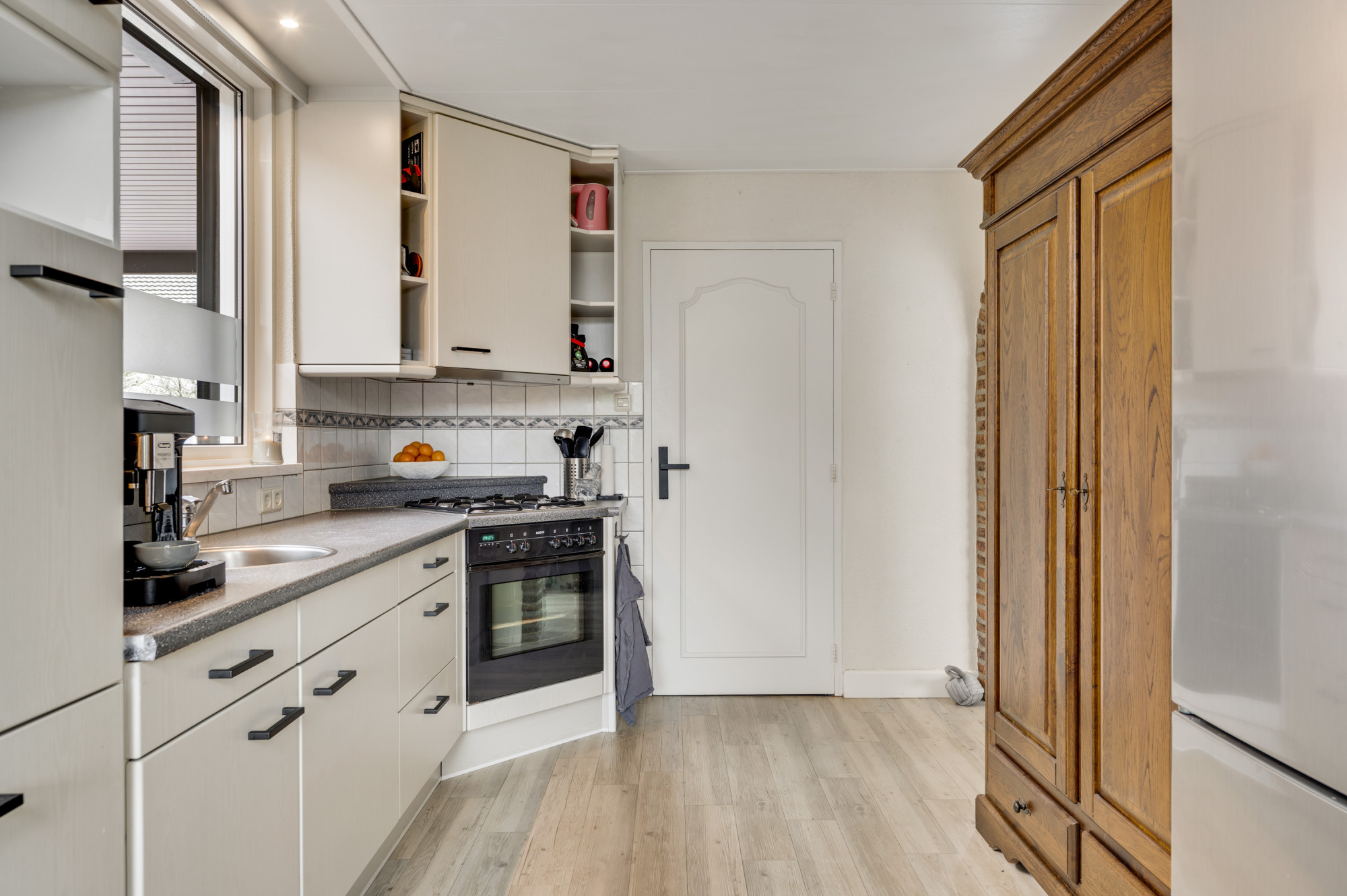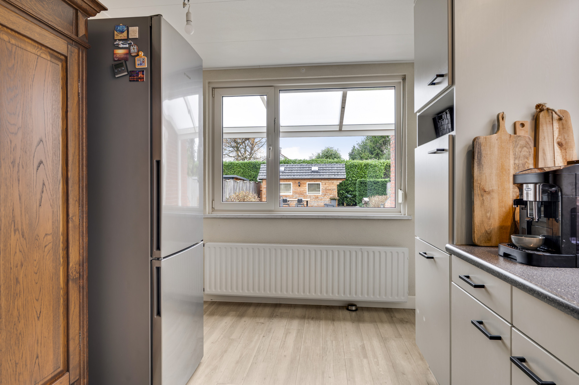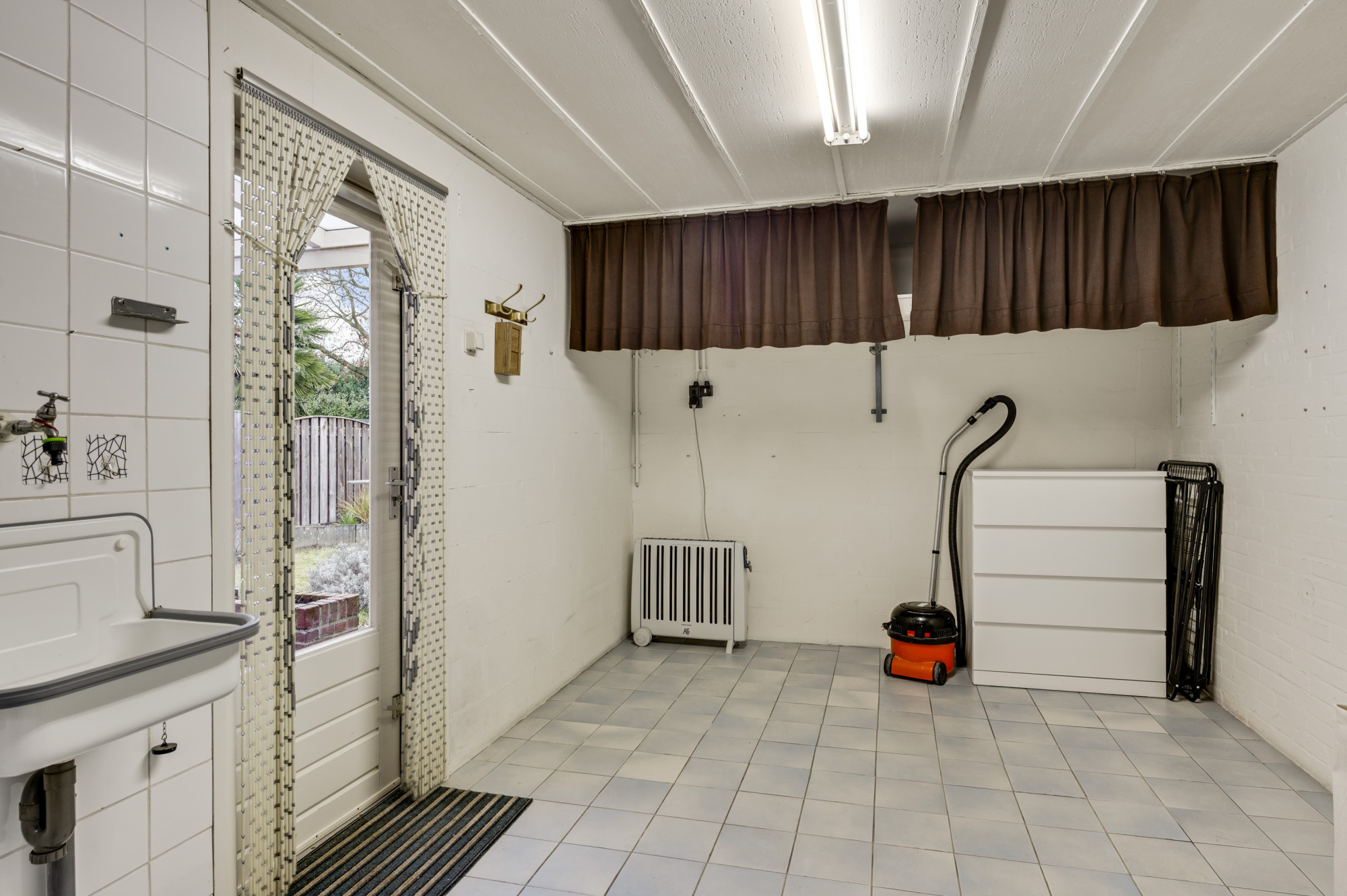 Via de entree bereikt u de hal met toiletruimte voorzien van een toilet en fonteintje, de meterkast, de trapopgang en toegang tot het souterrain. Vanuit de hal heeft u toegang tot de keuken met veel lichtinval, ingericht met een combinatie in hoekopstelling met inbouwapparatuur, waaronder een gasfornuis, afzuigkap, oven en een vaatwasser. Aansluitend bereikt u de woonkamer, die profiteert van een prettige lichtinval en beschikt over een extra loopdeur naar de achtertuin. Vanuit de keuken is tevens inpandig de voormalige garage bereikbaar, welke thans is ingericht als ruime berging/bijkeuken met witgoedaansluitingen, een wastafel en loopdeuren naar zowel de voorgelegen carport als de achtertuin. De begane grond is grotendeels afgewerkt met een laminaatvloer.