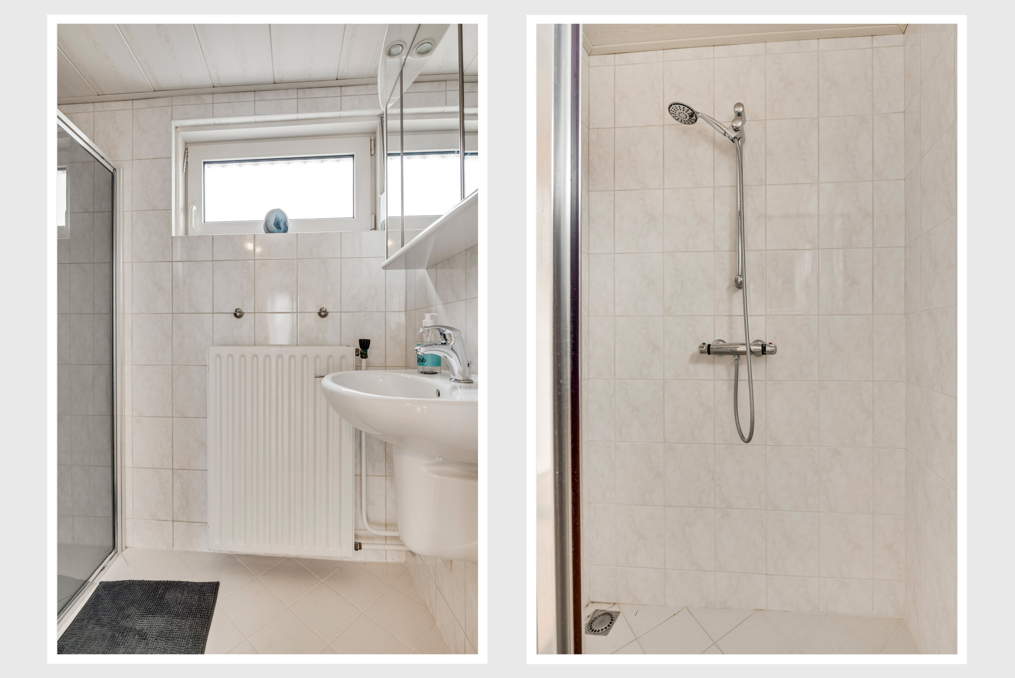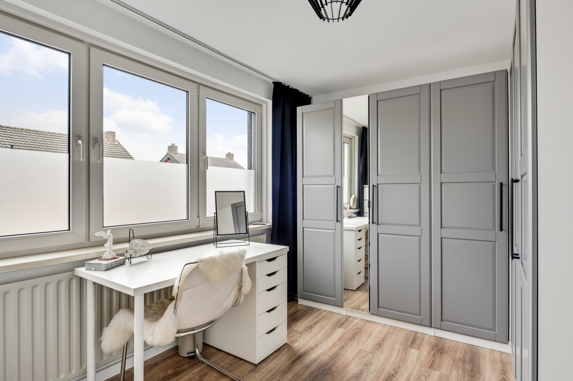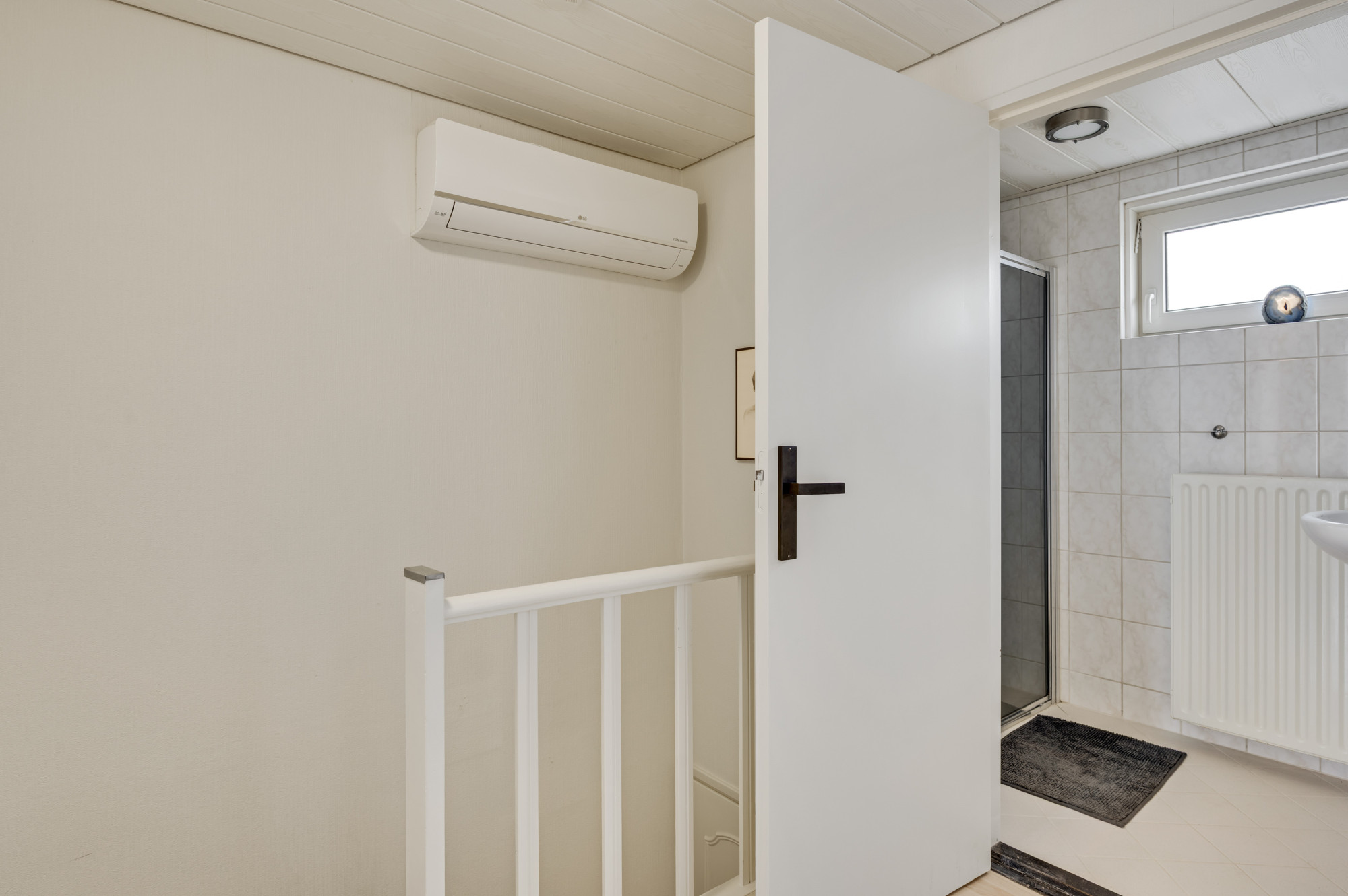 De overloop, voorzien van airconditioning, geeft toegang tot drie slaapkamers en de badkamer. De badkamer is uitgerust met een inloopdouche en een wastafel. Ook deze verdieping is grotendeels voorzien van een laminaatvloer.