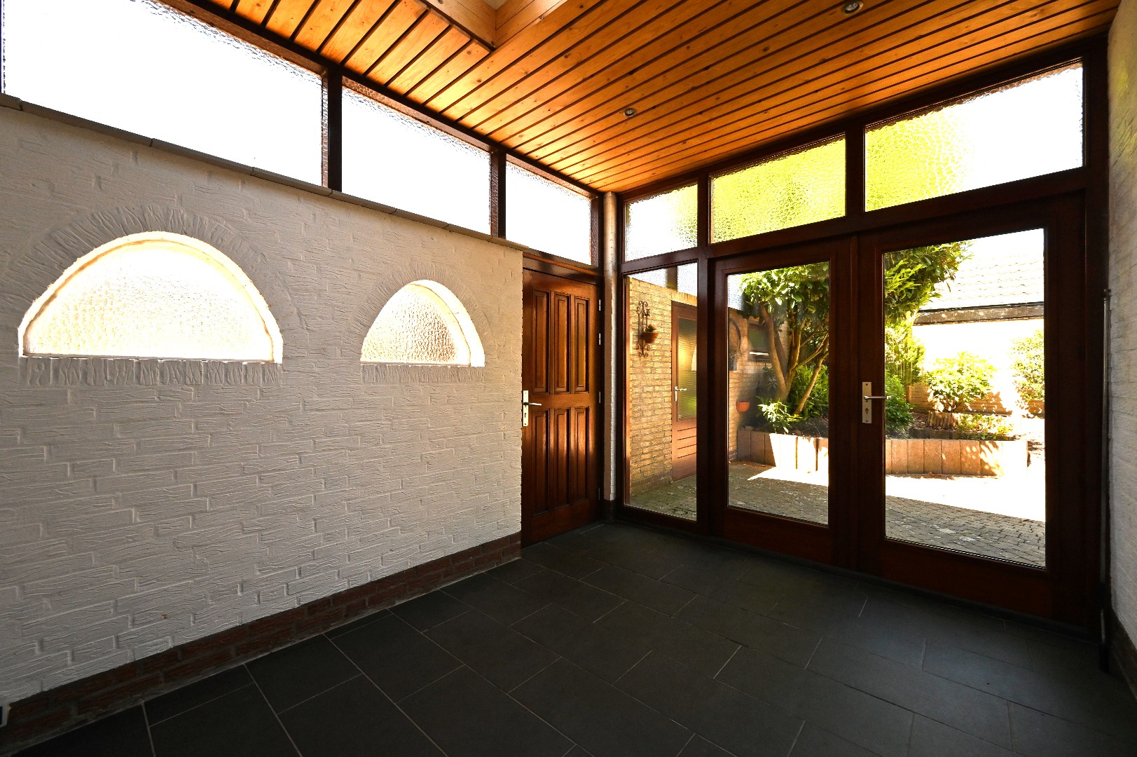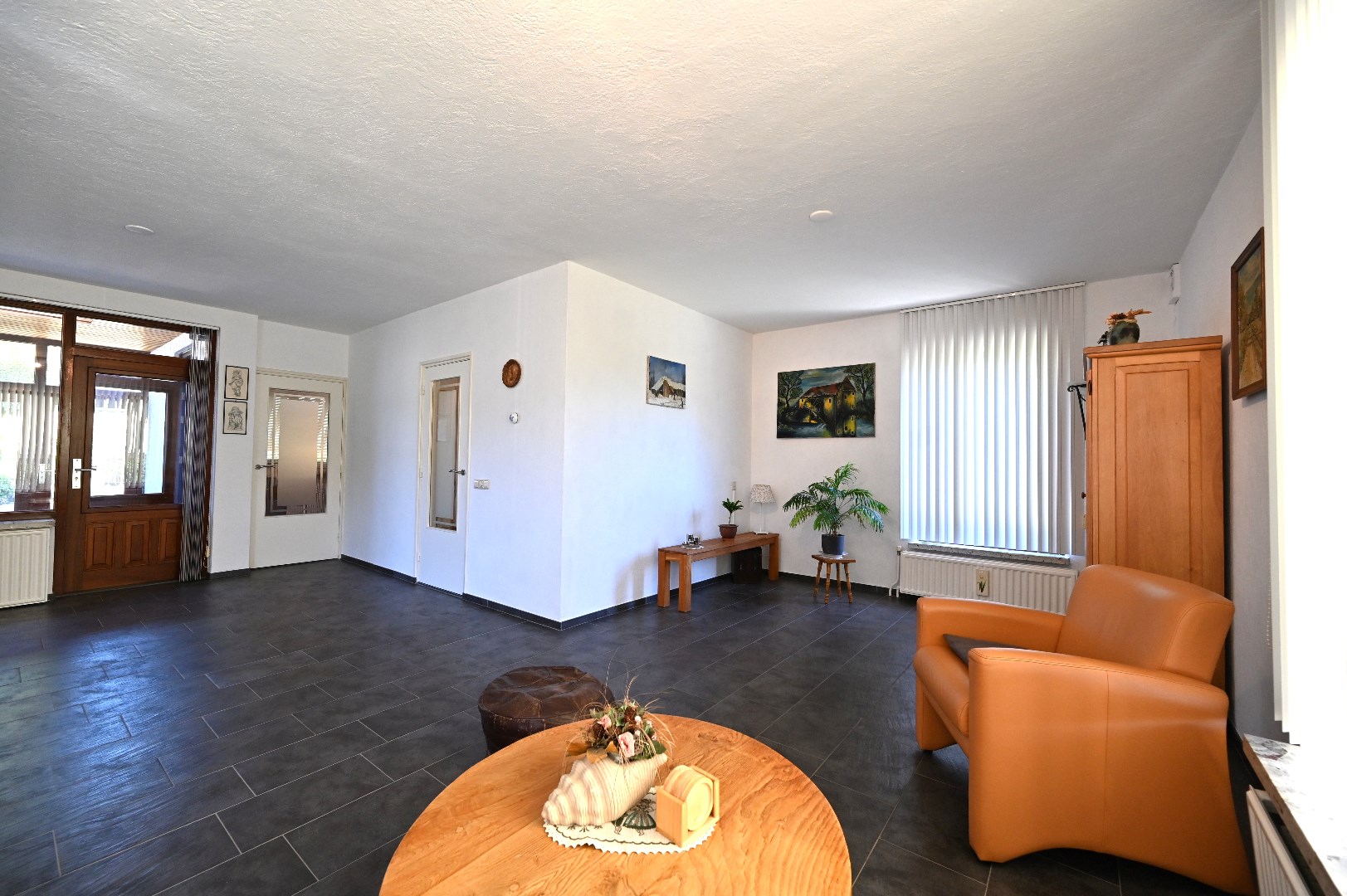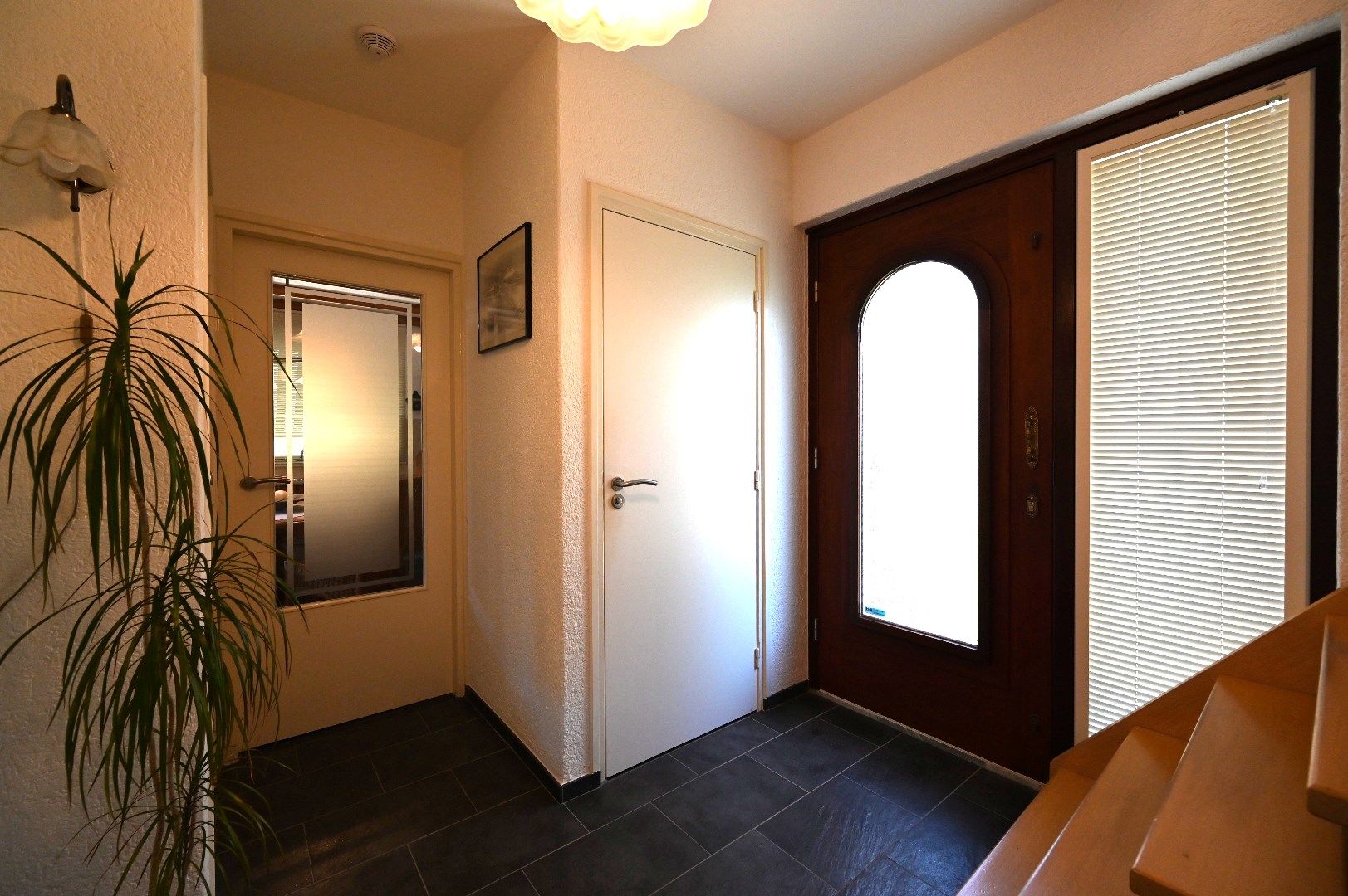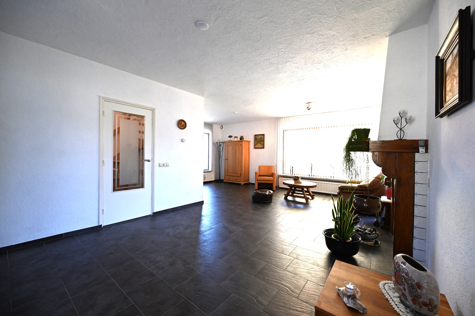 Wanneer men de voordeur opent dan treedt men de hal/entree binnen. Deze hal/entree (8m2) is voorzien van een tegelvloer en biedt toegang tot de woonkamer, keuken, toiletruimte en de kelder. De geheel betegelde toiletruimte (1.73m x 0.83m) is voorzien van een closet en fonteintje. De ruime L-vormige woonkamer (37m2) is afgewerkt met een tegelvloer en beschikt over een schouwpartij. Dankzij de vele raampartijen is aan lichtinval geen gebrek en kijkt men mooi uit over een aantal boerderijen van Jabeek. De gesloten keuken (3.71m x 3.46m) is eveneens afgewerkt met een tegelvloer en beschikt over een keukeninstallatie in hoekopstelling met de volgende ingebouwde keukenapparatuur: 4-pits gaskookplaat, afzuiging, koelkast en oven. De serre (3.56m x 2.74m), die zowel te bereiken is via de woonkamer als de keuken, biedt toegang tot de tuin en beschikt over een zijingang die uitkomt op de voorgelegen oprit.