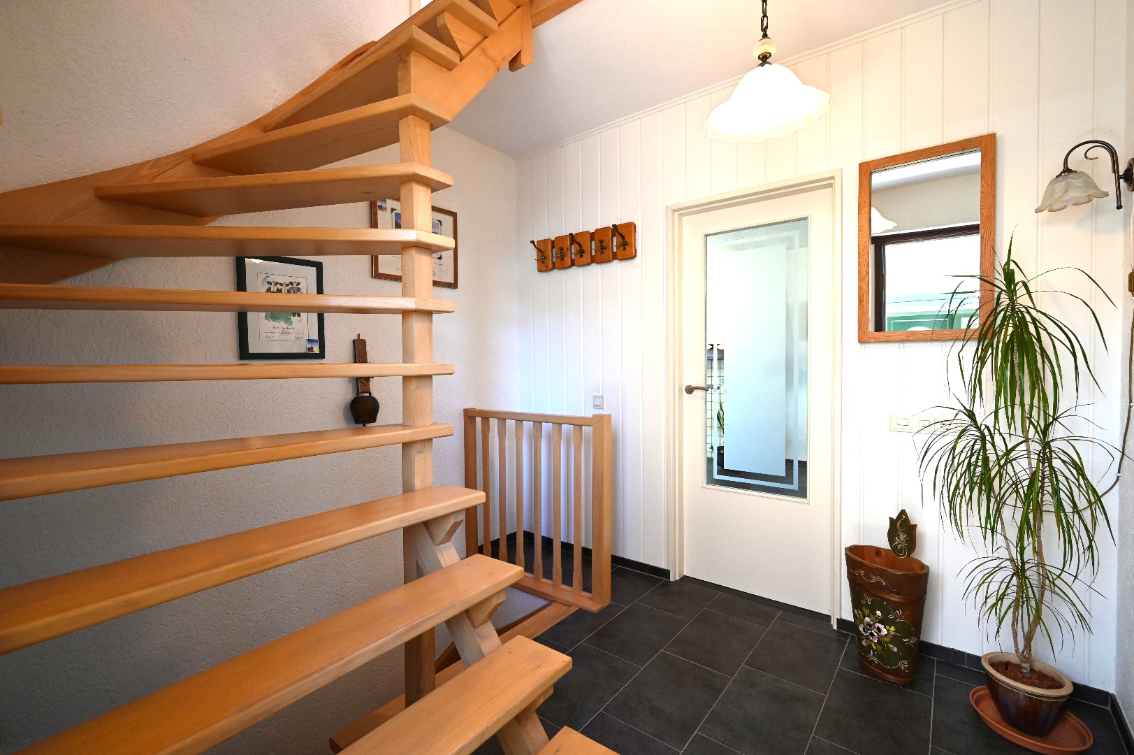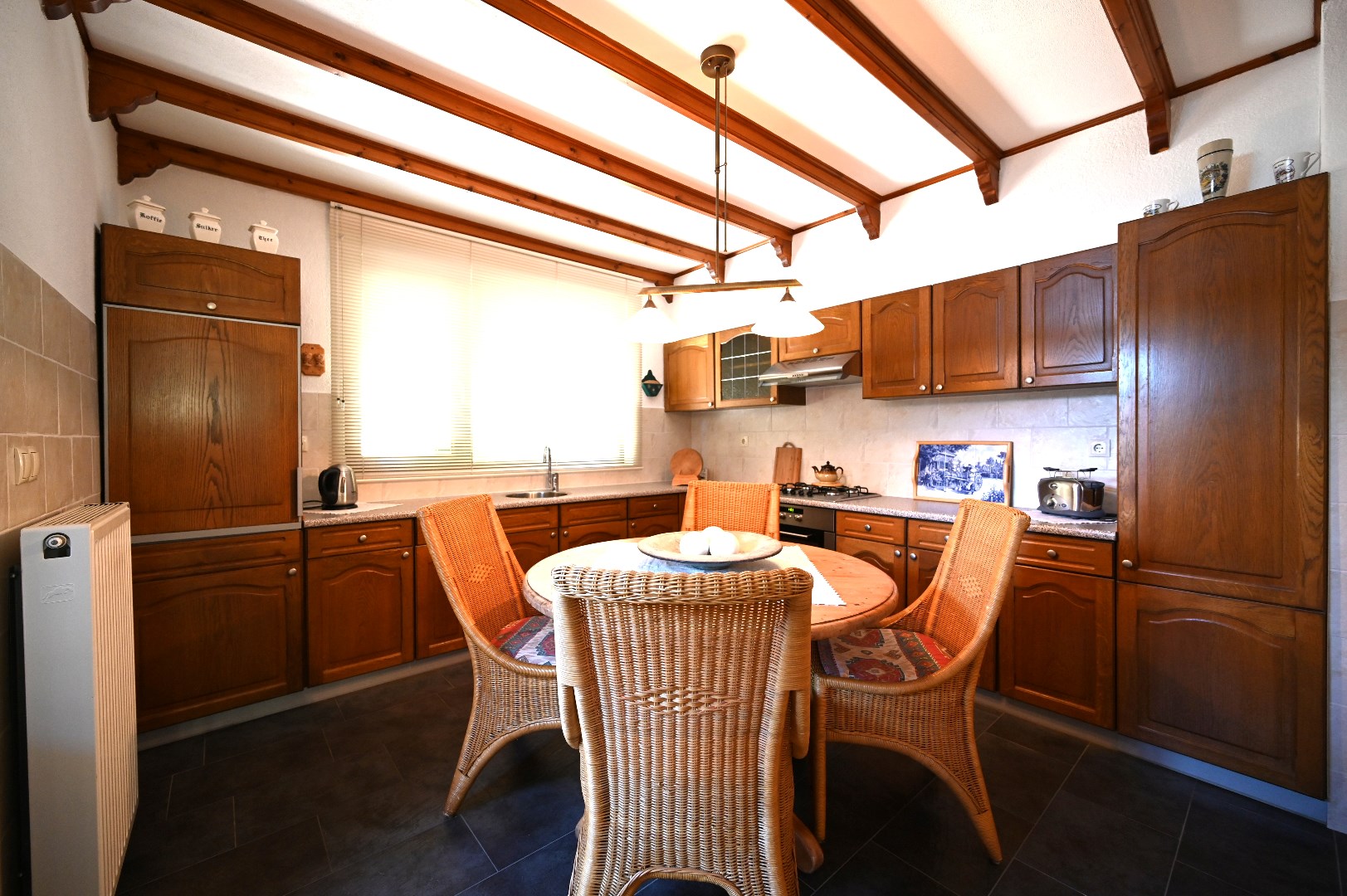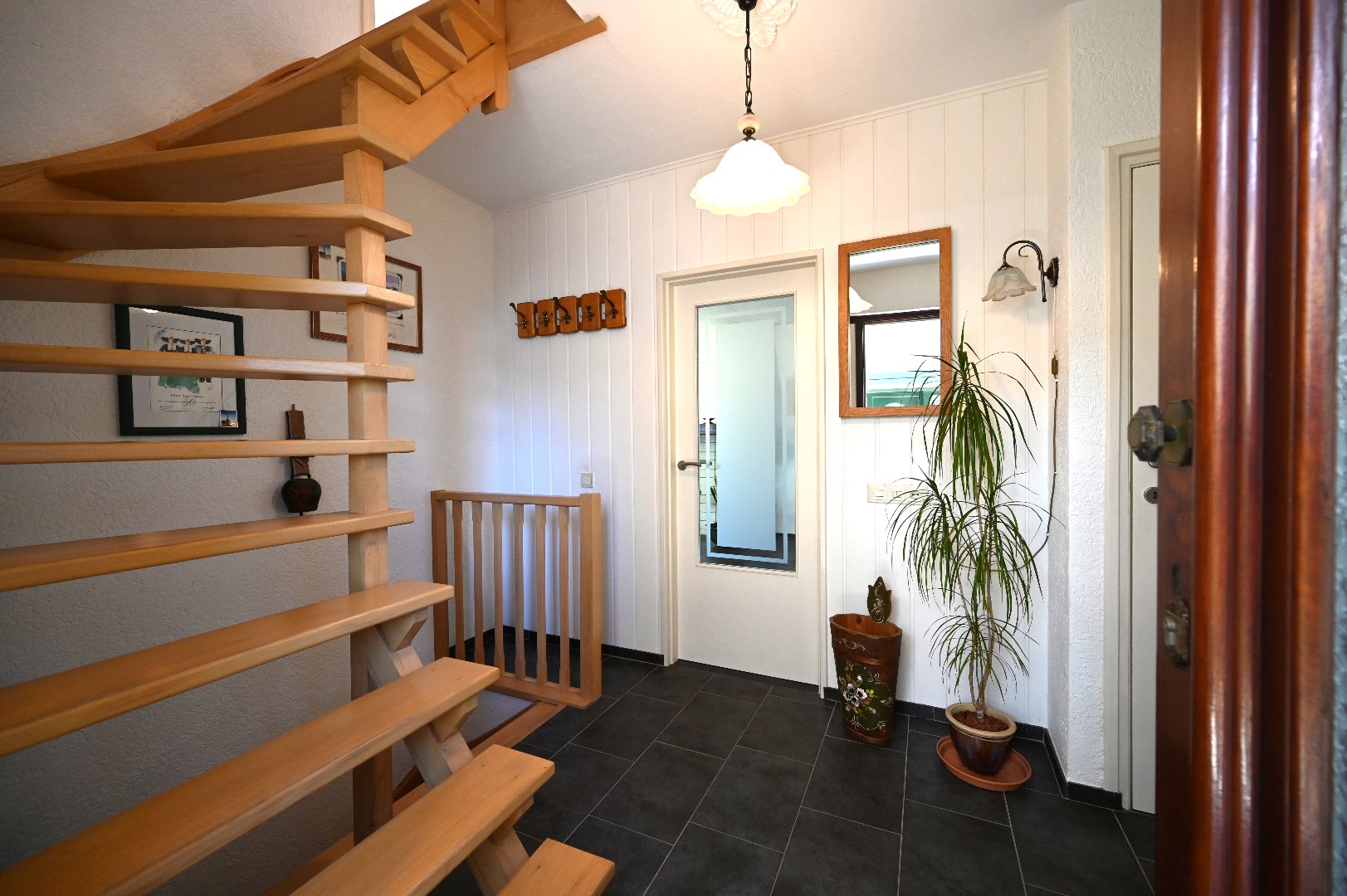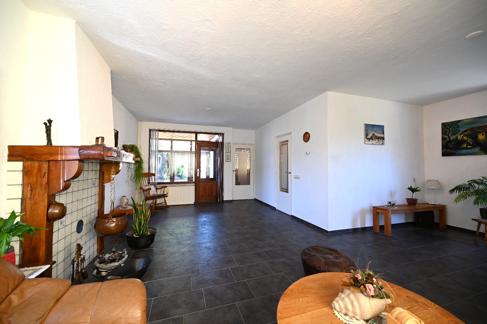 Wanneer men de voordeur opent dan treedt men de hal/entree binnen. Deze hal/entree (8m2) is voorzien van een tegelvloer en biedt toegang tot de woonkamer, keuken, toiletruimte en de kelder. De geheel betegelde toiletruimte (1.73m x 0.83m) is voorzien van een closet en fonteintje. De ruime L-vormige woonkamer (37m2) is afgewerkt met een tegelvloer en beschikt over een schouwpartij. Dankzij de vele raampartijen is aan lichtinval geen gebrek en kijkt men mooi uit over een aantal boerderijen van Jabeek. De gesloten keuken (3.71m x 3.46m) is eveneens afgewerkt met een tegelvloer en beschikt over een keukeninstallatie in hoekopstelling met de volgende ingebouwde keukenapparatuur: 4-pits gaskookplaat, afzuiging, koelkast en oven. De serre (3.56m x 2.74m), die zowel te bereiken is via de woonkamer als de keuken, biedt toegang tot de tuin en beschikt over een zijingang die uitkomt op de voorgelegen oprit.