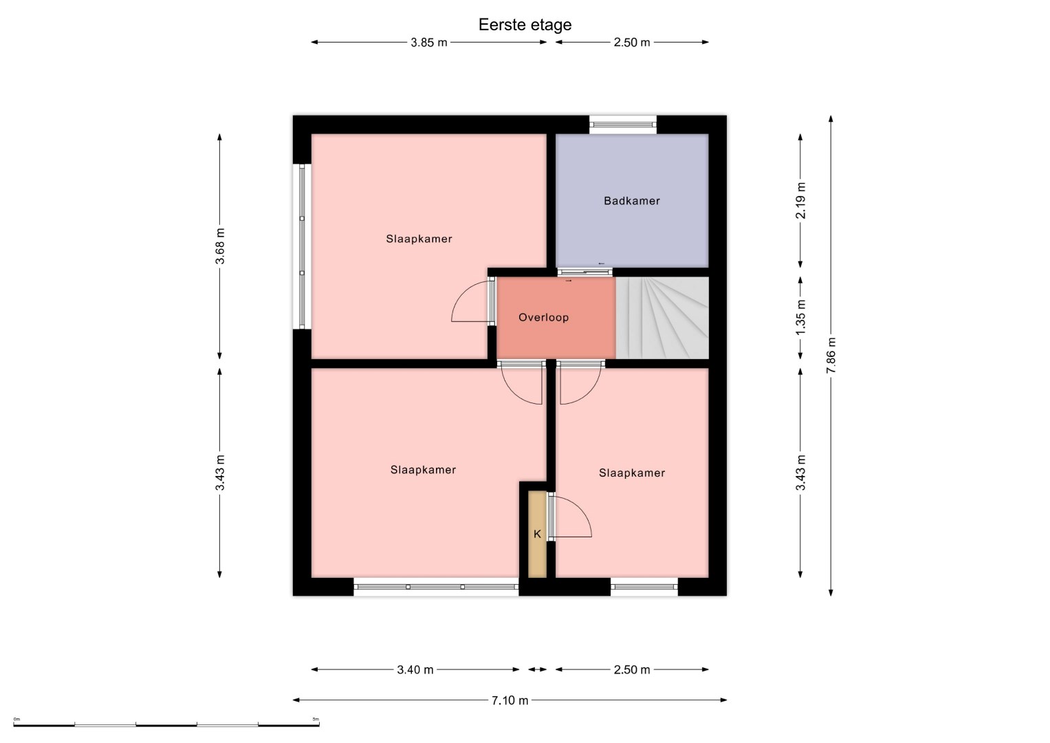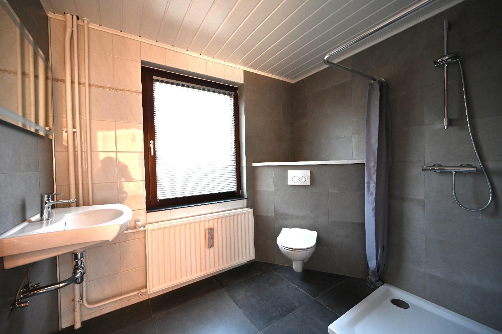 Via de trapopgang komt men uit op de overloop van de eerste etage. Deze overloop (1.97m x 1.34m) biedt vervolgens toegang tot de drie slaapkamers en de badkamer. De eerste twee slaapkamers bevinden zich aan de voorzijde van de woning, de grote slaapkamer (12m2) is afgewerkt met een parketvloer en de kleinere slaapkamer (9m2) is voorzien van een laminaatvloer. De derde slaapkamer (12m2) bevindt zich aan de achterzijde van de woning en is eveneens voorzien van een laminaatvloer. De geheel betegelde badkamer (2.50m x 2.14m) is voorzien van de volgende badkamerinstallaties: vaste wastafel, wandcloset en inloopdouche met thermostaatkraan.