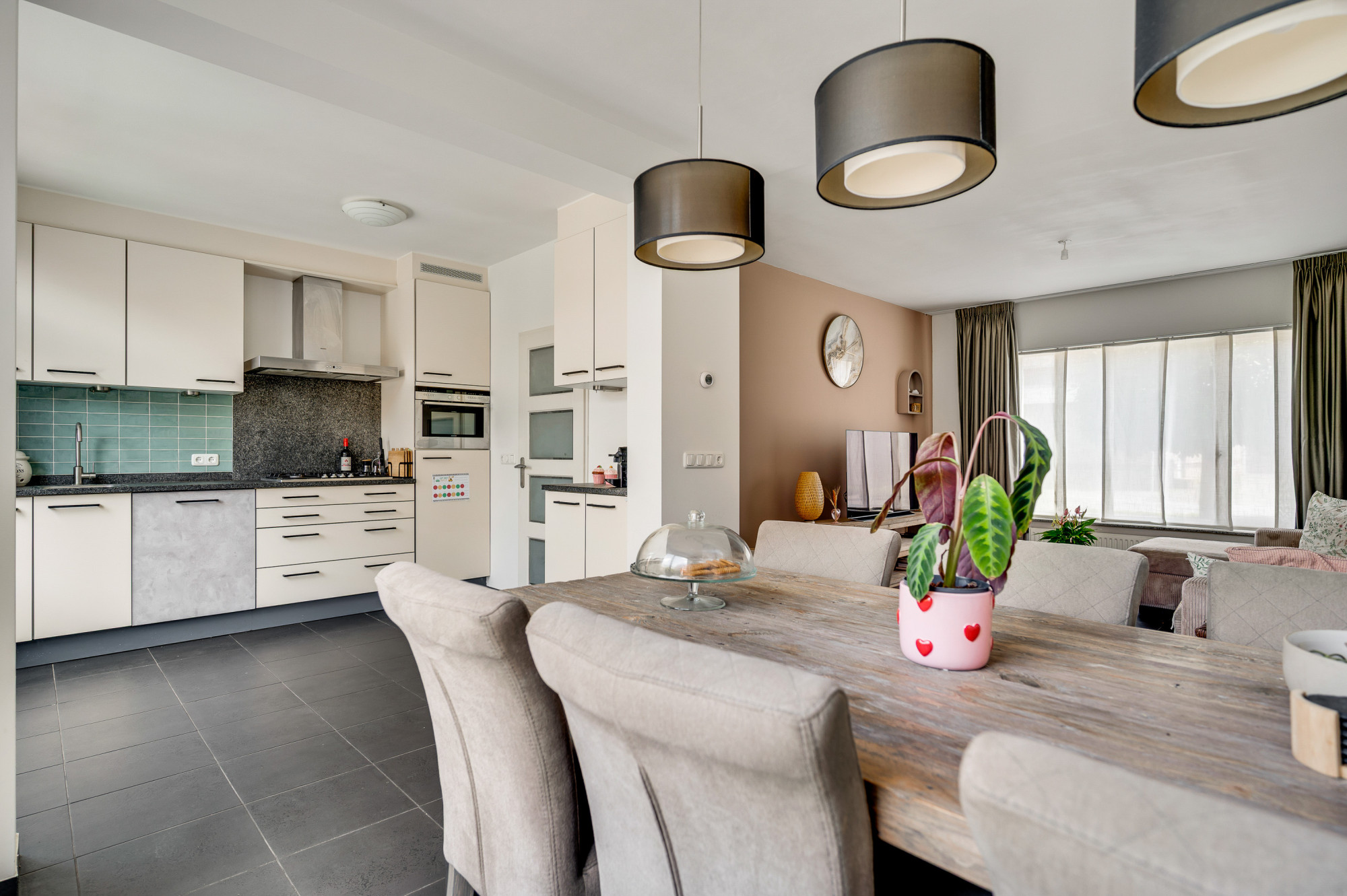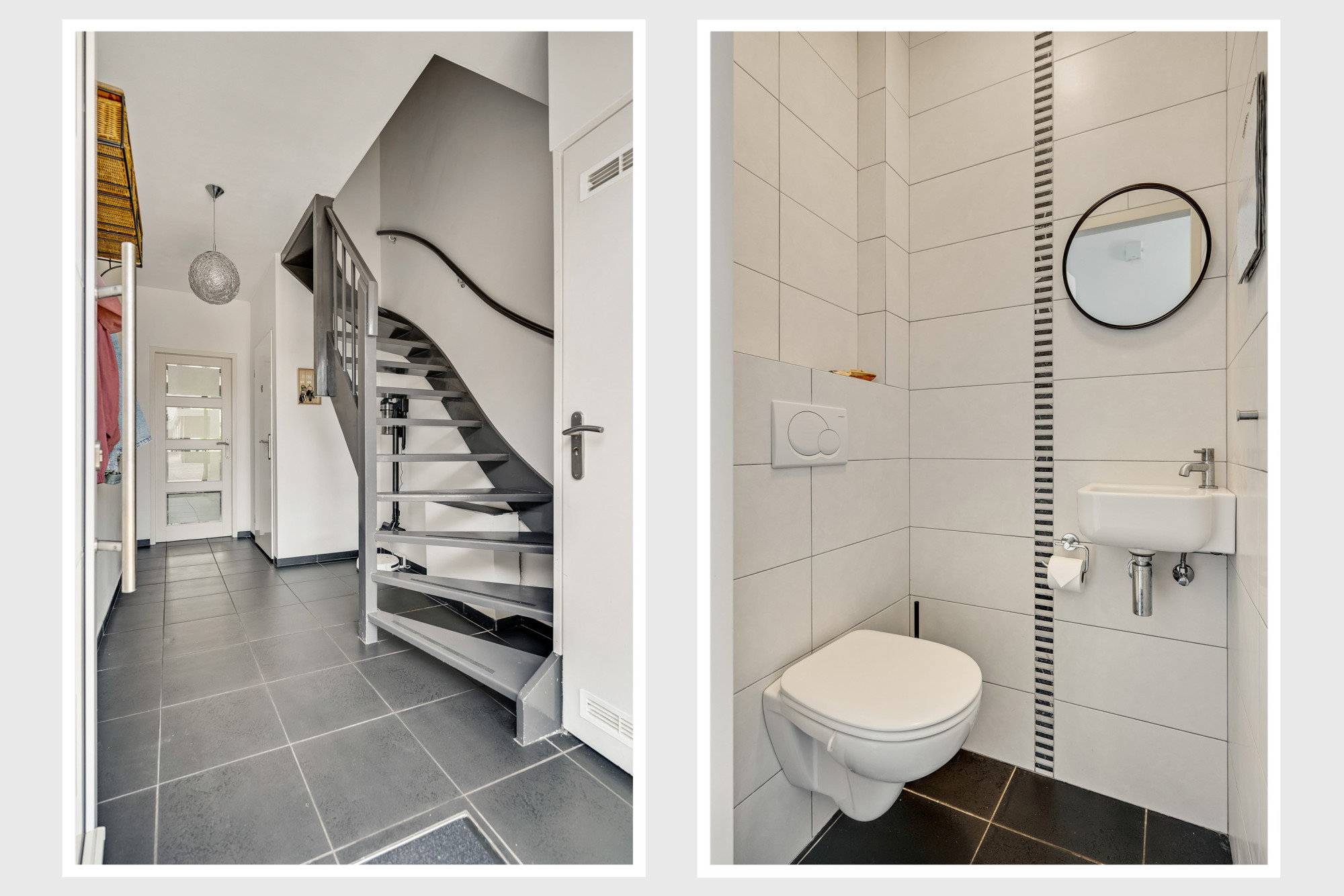 Je komt binnen in de ruime hal met vernieuwde meterkast, moderne toiletruimte met zwevend toilet en fonteintje, en de trapopgang naar de eerste verdieping. De woonkamer is aangenaam licht dankzij de grote raampartijen aan de voorzijde en een schuifpui naar de achtertuin. De open keuken in dubbele opstelling met koffie corner is voorzien van inbouwapparatuur, waaronder een gaskookplaat, afzuigkap, koelkast, combi-oven en een recent vernieuwde vaatwasser. Ook is de achterwand afgewerkt met moderne tegels. Vanuit de keuken is de tuin bereikbaar via een loopdeur. De gehele begane grond is afgewerkt met een tegelvloer, grotendeels voorzien van comfortabele vloerverwarming. De recent geplaatste Daikin airco zorgt hier voor verkoeling in de zomer en extra warmte in de winter.