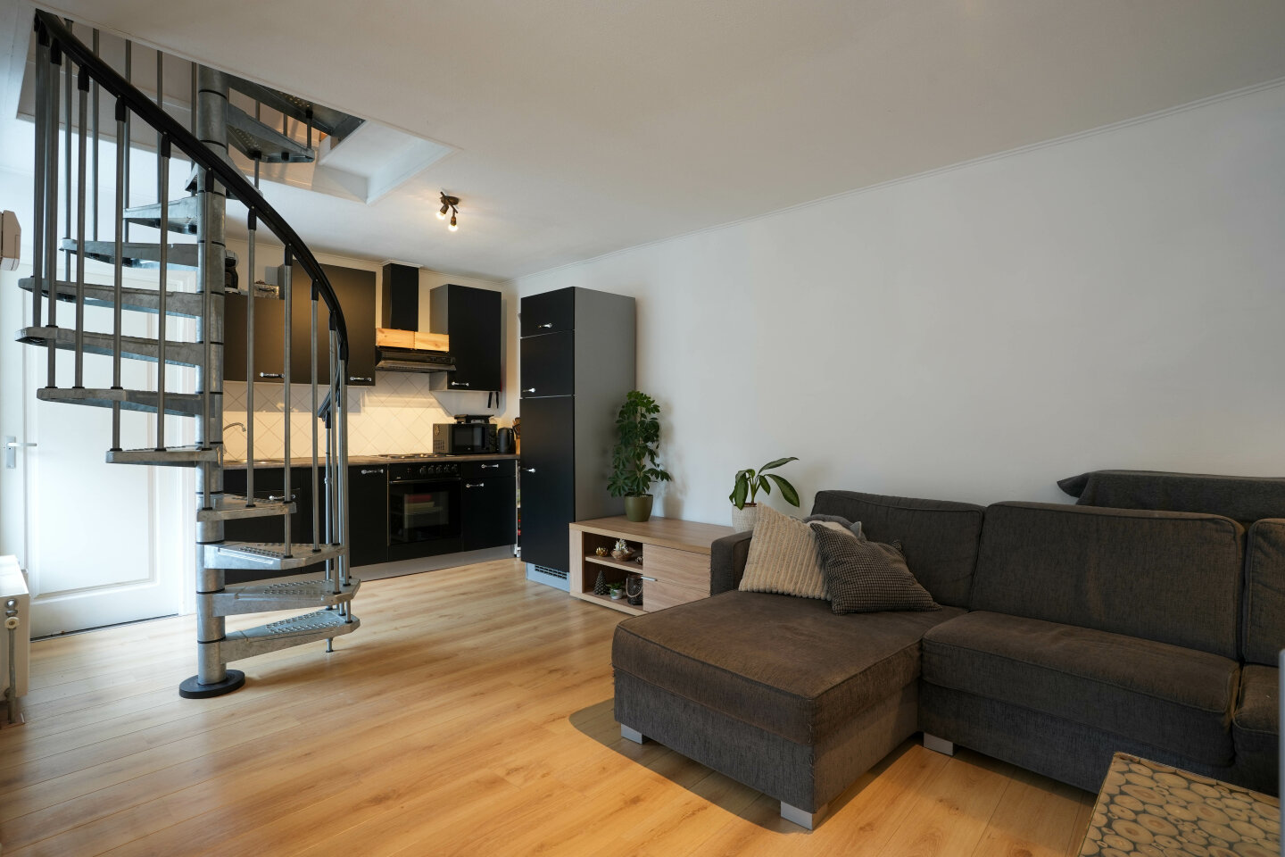 Entree, hal met toegang tot geheel betegeld toilet, badkamer met ligbad en wastafel. L-vormige woonkamer voorzien van laminaatvloer, open keuken met keukeninstallatie voorzien van elektrische kookplaat, afzuigkap en koelkast. De woonkamer en keuken zijn samen circa 32 m2. Witgoedaansluitingen , HR combi ketel (eigendom, bouwjaar ca. 2010) en toegang tot de kelder.