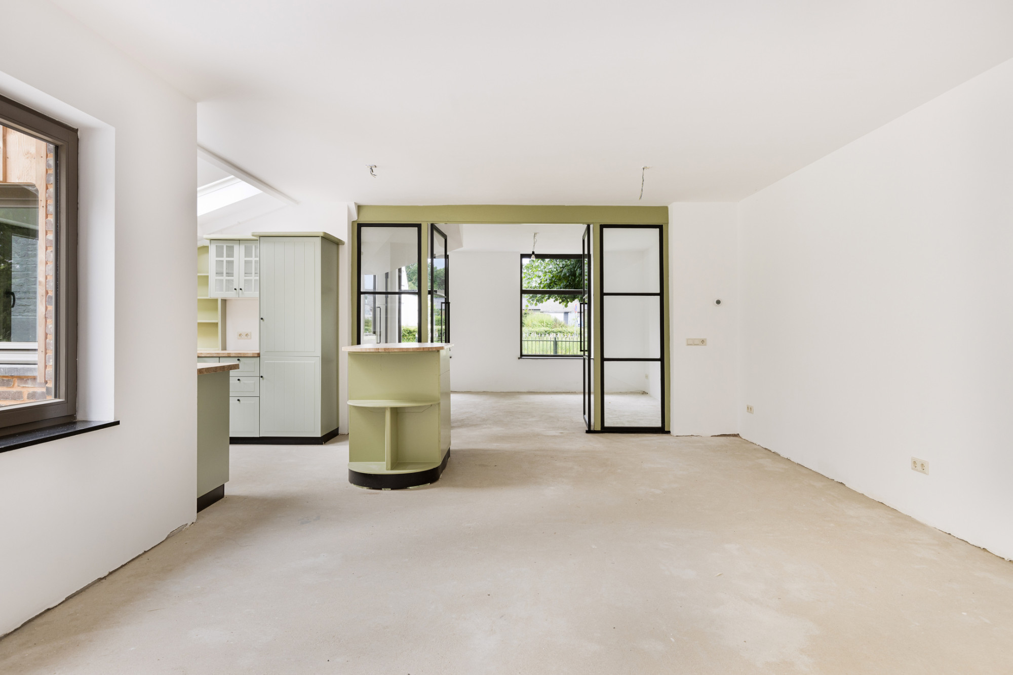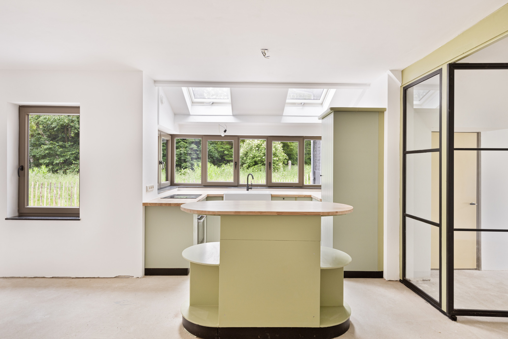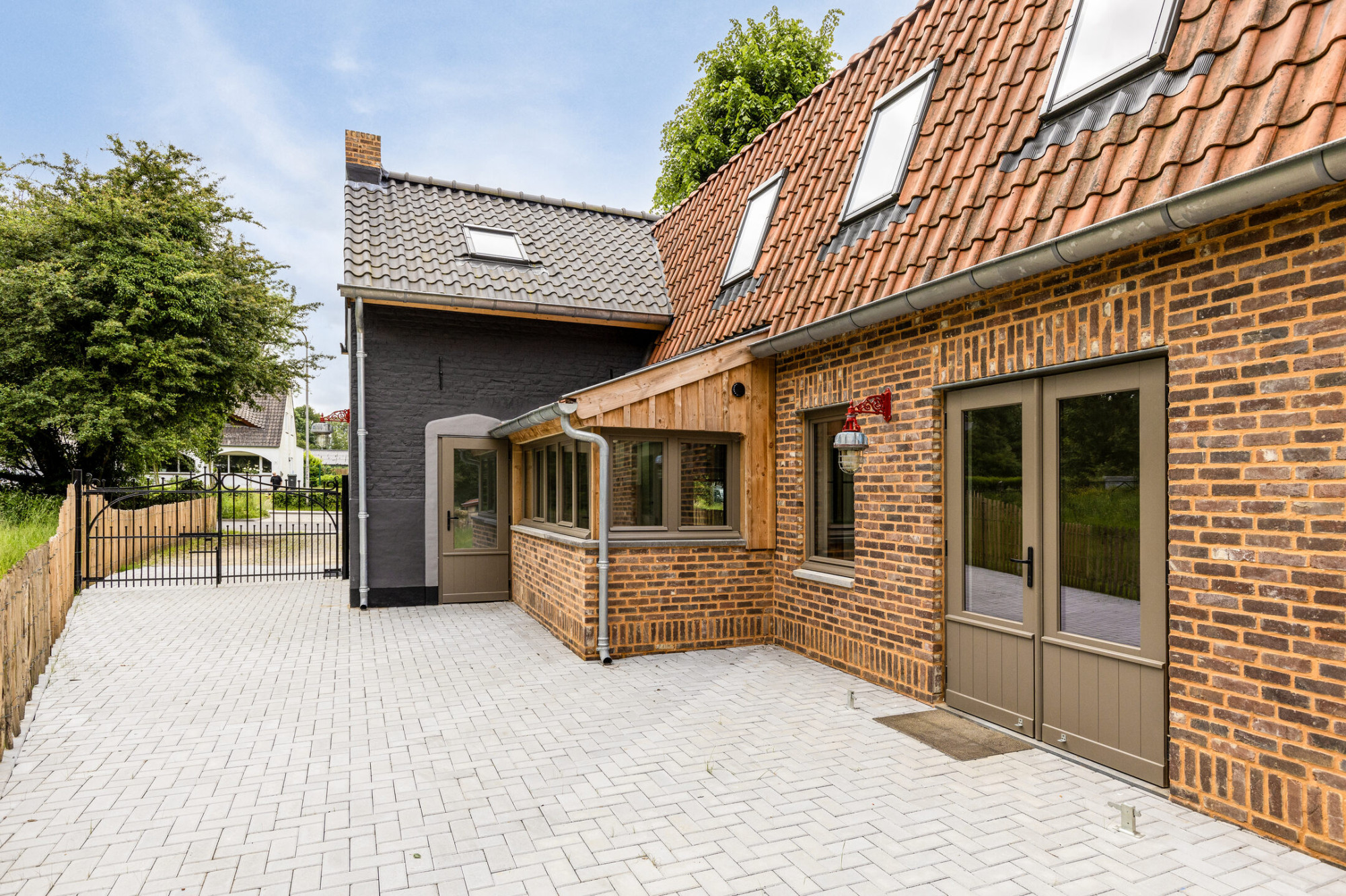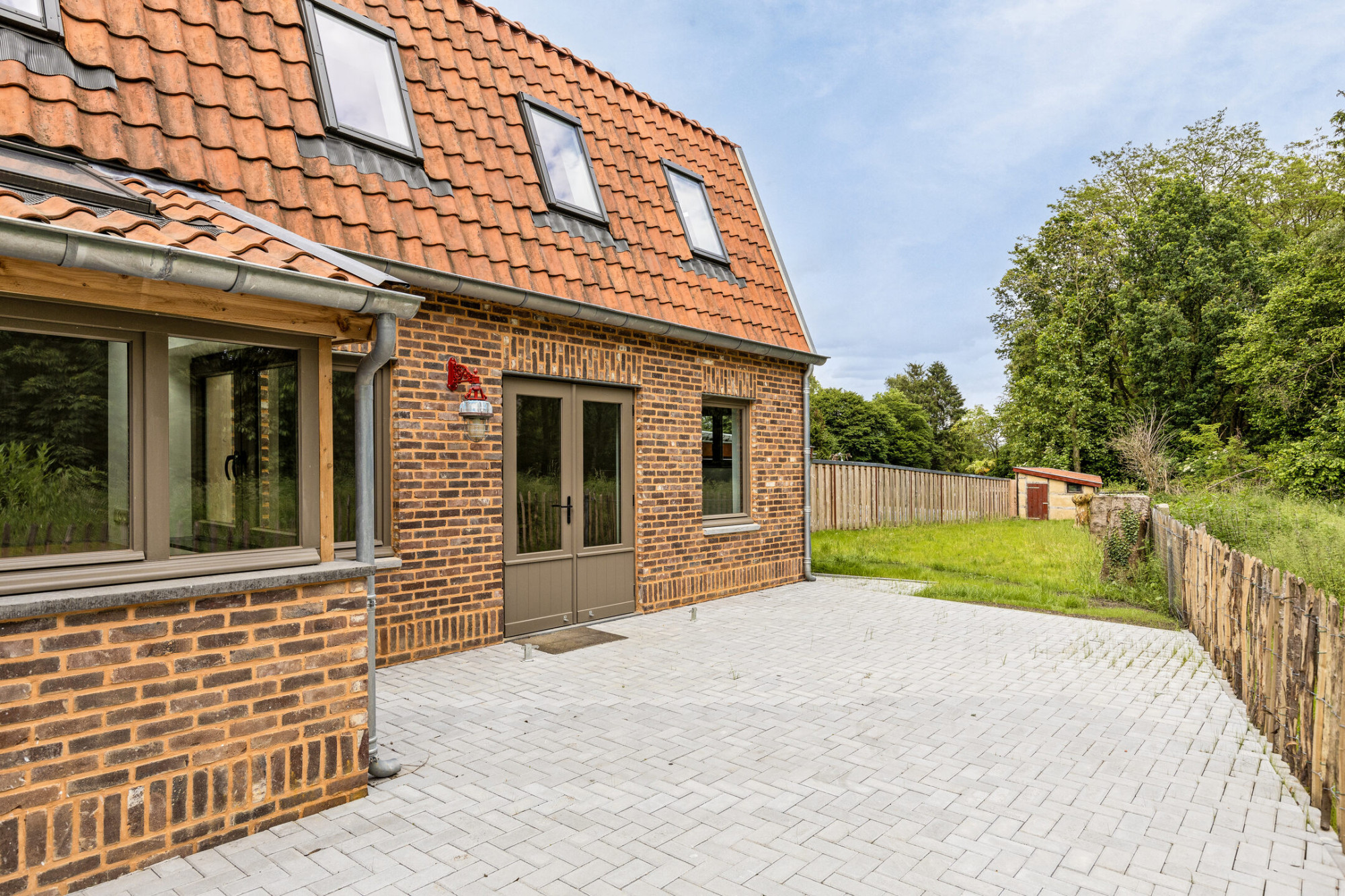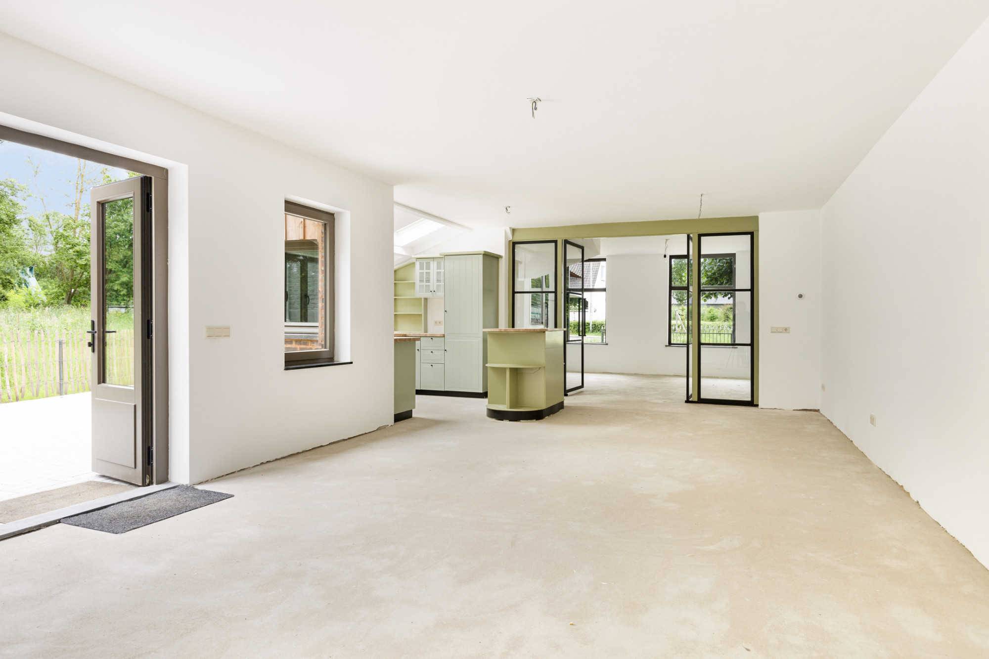 Middels voortuin met ruime oprit geschikt voor meerdere voertuigen toegang tot de entree. Hal (3.17 x 1.67 m) met toiletruimte voorzien van wandcloset en fonteintje. Middels zwarte stalen deur toegang tot de en-suite leefruimte welke is voorzien van vloerverwarming en verdeeld is in een woonkamer (4.62 x 3.98 m) en een woon/leef keuken (9.98 x 4.62 m) gescheiden middels stalen wand met openslaande dubbele deur samen totaal circa 65 m² ; keukeninstallatie in ruime lichte erker voorzien van 2 Velux dakramen met zicht op de groene omgeving in U opstelling met separaat werkeiland, inbouwapparatuur te weten: 4-pits inductie kookplaat, hete-lucht-oven, koelkast en vaatwasser. Vanuit de woon/leef keuken middels opslaande tuindeuren toegang tot het terras en tuin met 2 buitenbergingen (3.42 x 3.17 m) en (5.45 x 2.93/1.73 m) geheel in stijl opgetrokken.