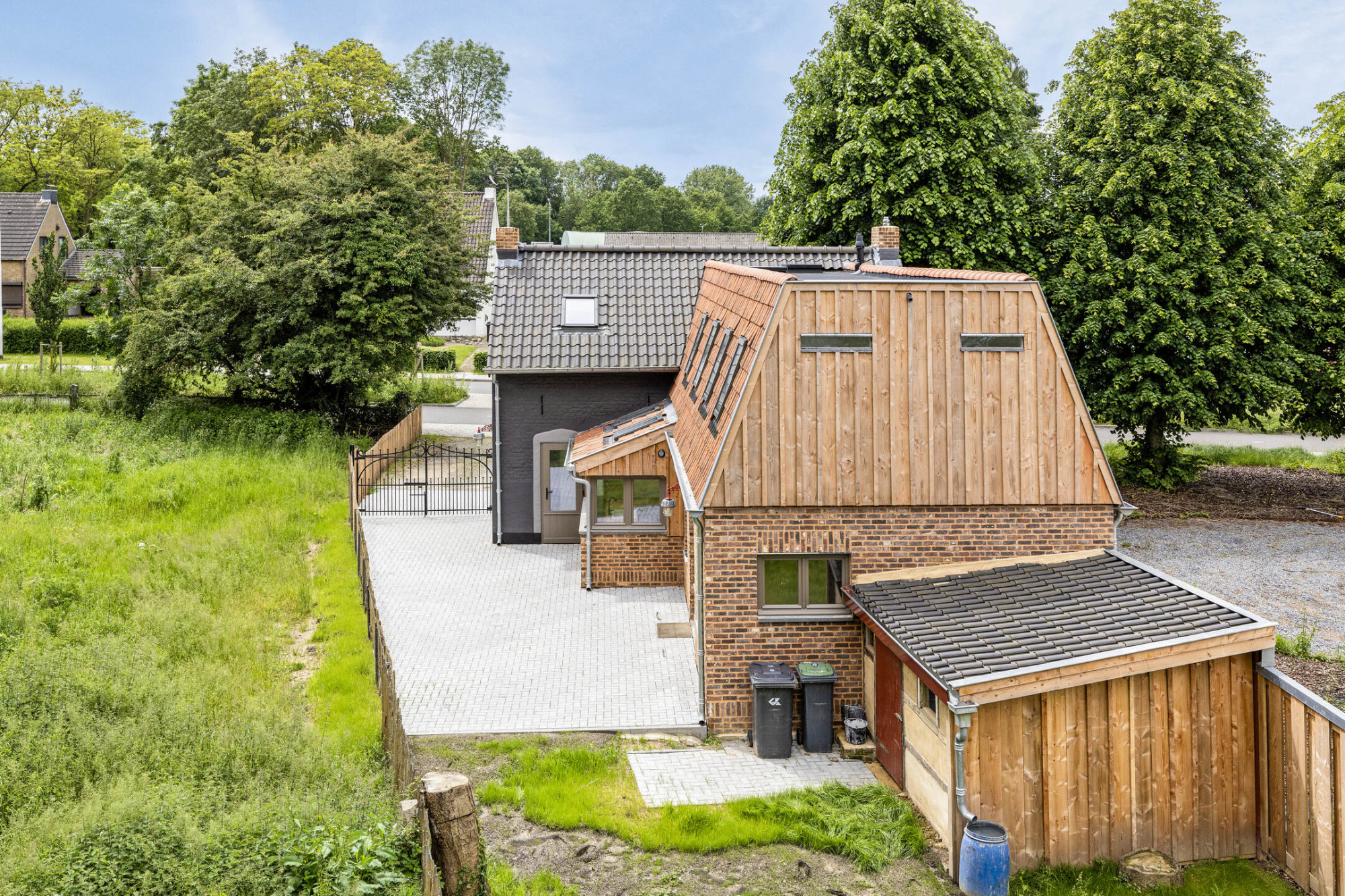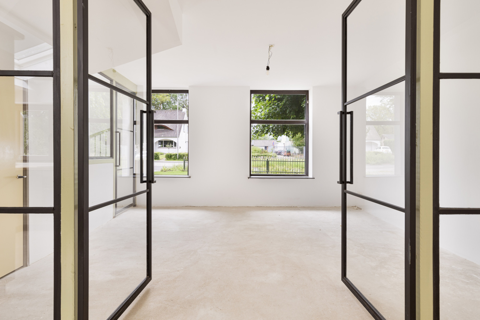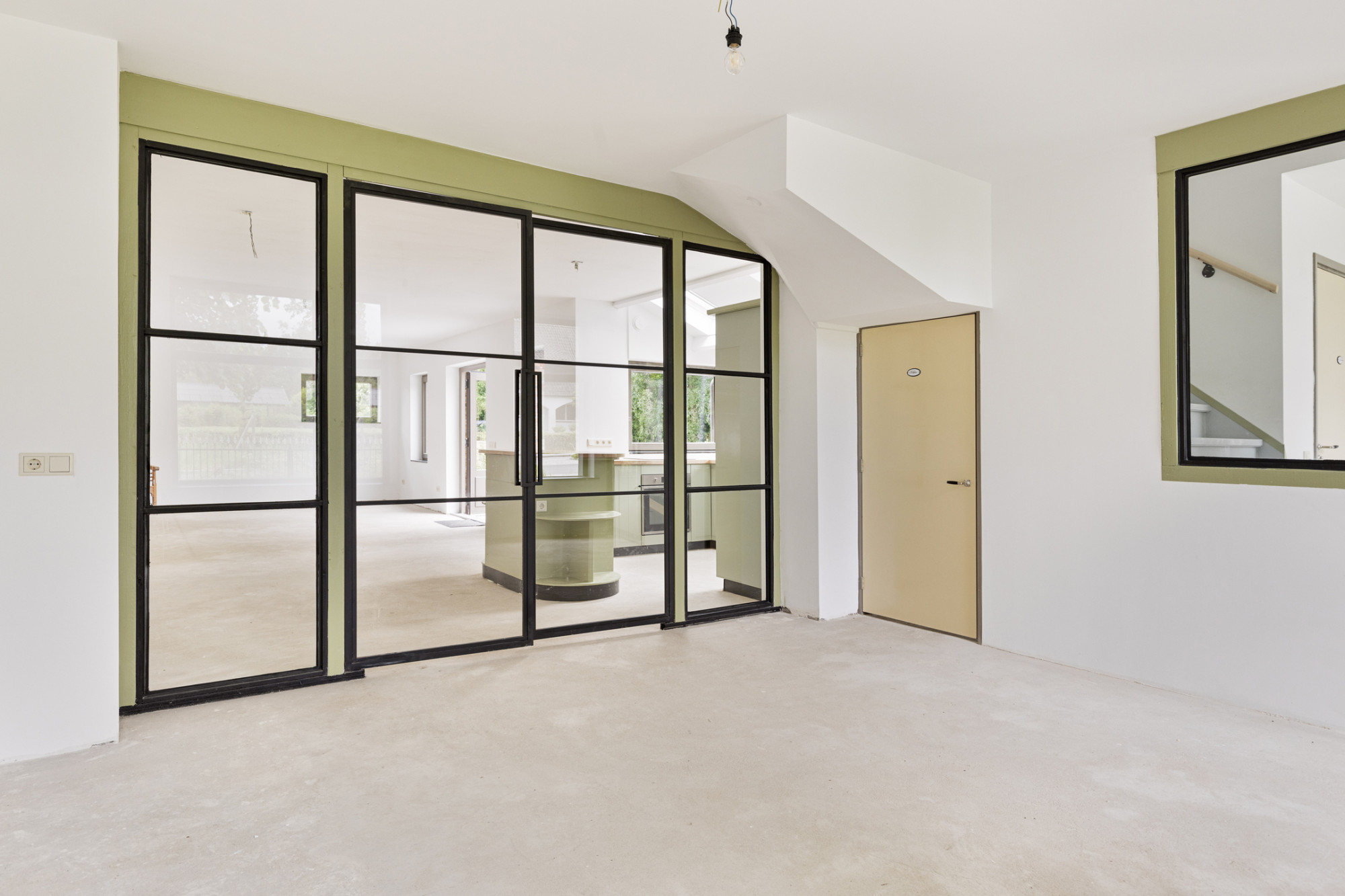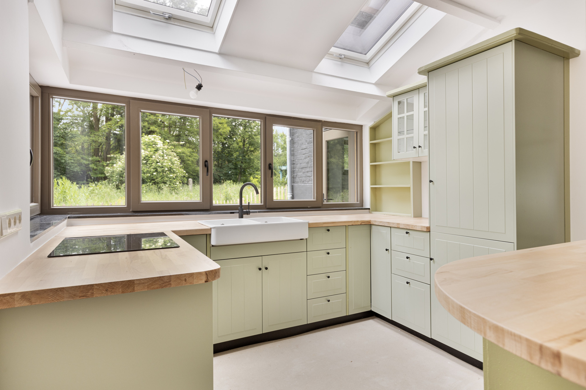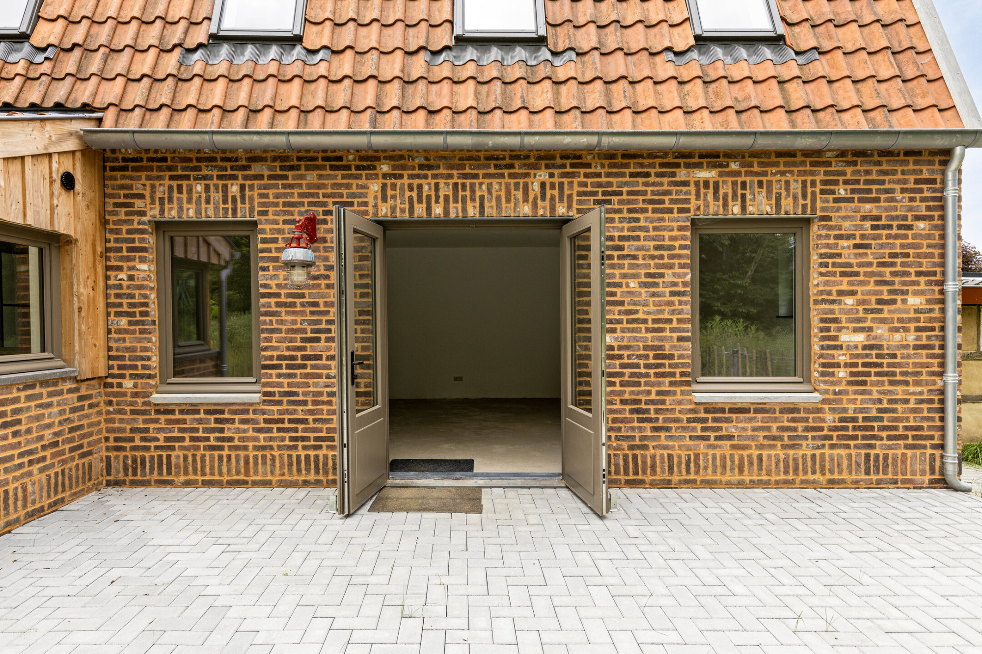 Middels voortuin met ruime oprit geschikt voor meerdere voertuigen toegang tot de entree. Hal (3.17 x 1.67 m) met toiletruimte voorzien van wandcloset en fonteintje. Middels zwarte stalen deur toegang tot de en-suite leefruimte welke is voorzien van vloerverwarming en verdeeld is in een woonkamer (4.62 x 3.98 m) en een woon/leef keuken (9.98 x 4.62 m) gescheiden middels stalen wand met openslaande dubbele deur samen totaal circa 65 m² ; keukeninstallatie in ruime lichte erker voorzien van 2 Velux dakramen met zicht op de groene omgeving in U opstelling met separaat werkeiland, inbouwapparatuur te weten: 4-pits inductie kookplaat, hete-lucht-oven, koelkast en vaatwasser. Vanuit de woon/leef keuken middels opslaande tuindeuren toegang tot het terras en tuin met 2 buitenbergingen (3.42 x 3.17 m) en (5.45 x 2.93/1.73 m) geheel in stijl opgetrokken.