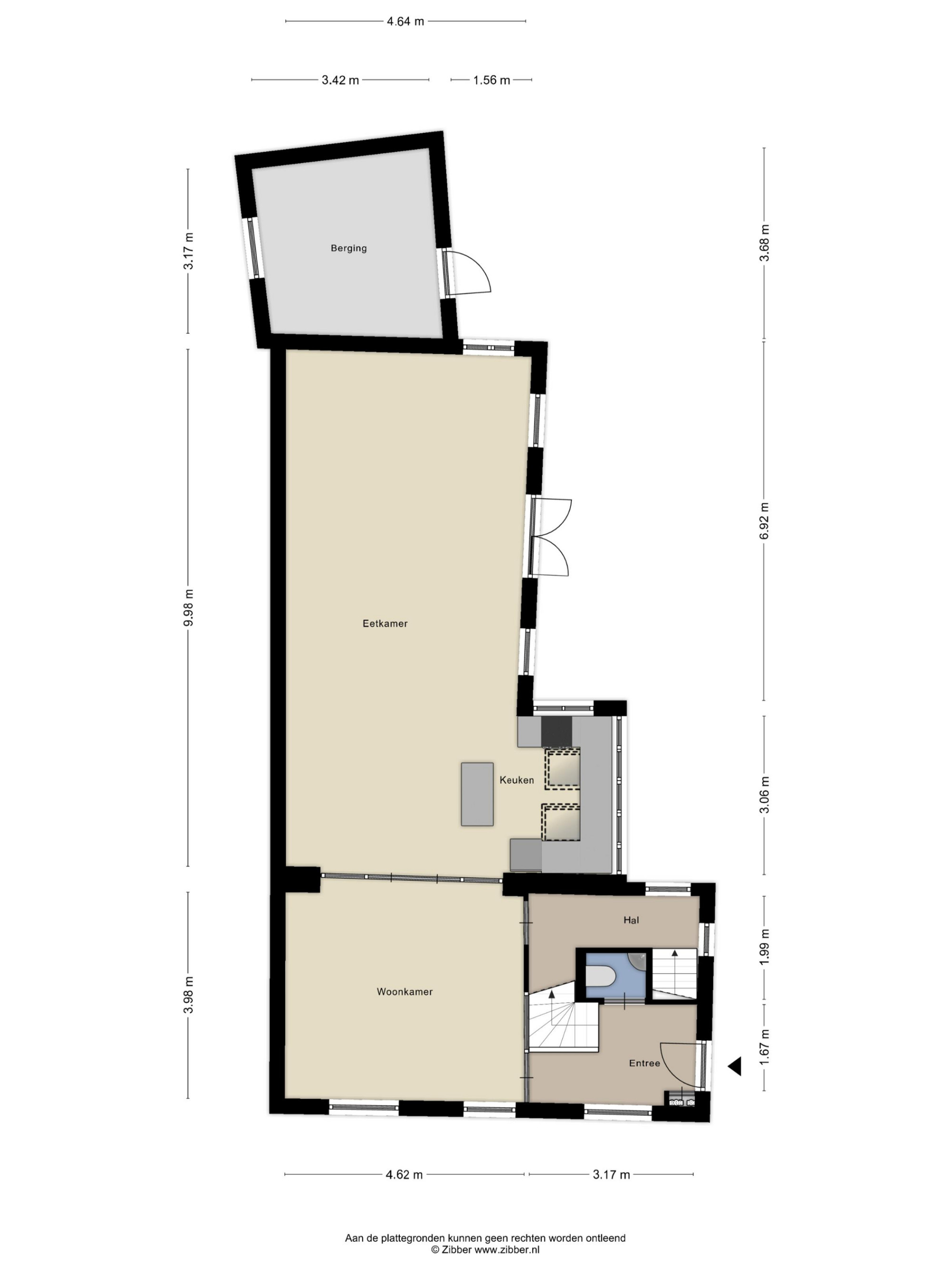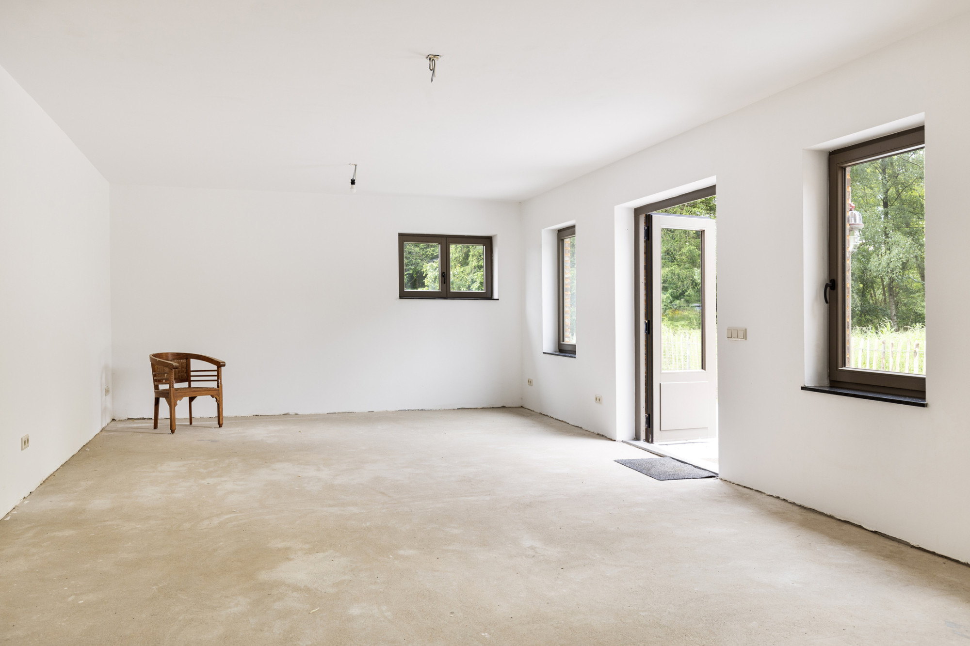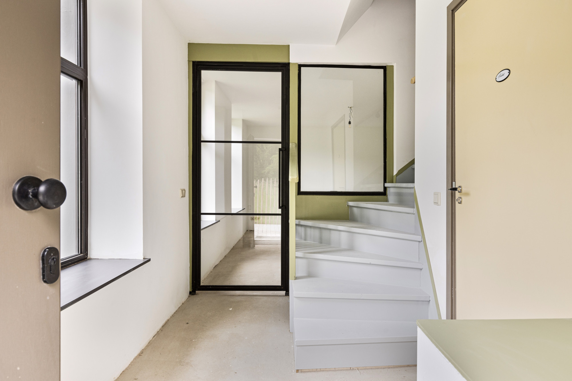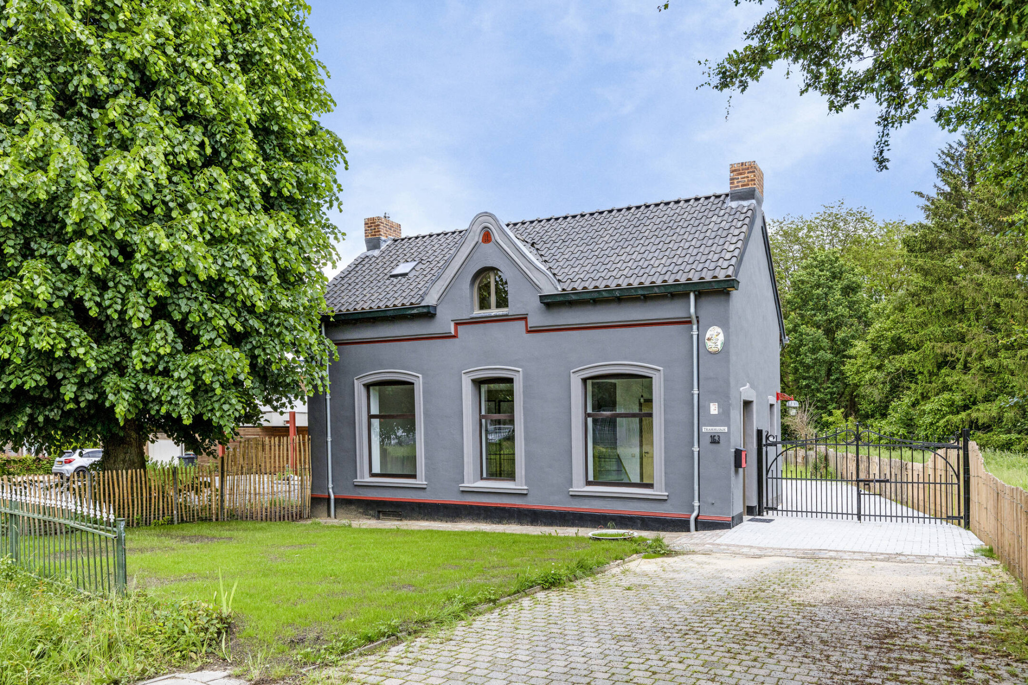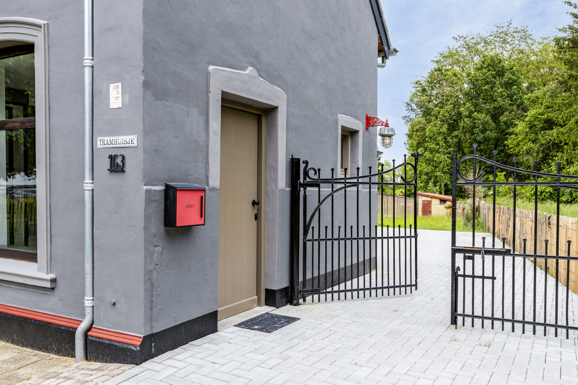 Middels voortuin met ruime oprit geschikt voor meerdere voertuigen toegang tot de entree. Hal (3.17 x 1.67 m) met toiletruimte voorzien van wandcloset en fonteintje. Middels zwarte stalen deur toegang tot de en-suite leefruimte welke is voorzien van vloerverwarming en verdeeld is in een woonkamer (4.62 x 3.98 m) en een woon/leef keuken (9.98 x 4.62 m) gescheiden middels stalen wand met openslaande dubbele deur samen totaal circa 65 m² ; keukeninstallatie in ruime lichte erker voorzien van 2 Velux dakramen met zicht op de groene omgeving in U opstelling met separaat werkeiland, inbouwapparatuur te weten: 4-pits inductie kookplaat, hete-lucht-oven, koelkast en vaatwasser. Vanuit de woon/leef keuken middels opslaande tuindeuren toegang tot het terras en tuin met 2 buitenbergingen (3.42 x 3.17 m) en (5.45 x 2.93/1.73 m) geheel in stijl opgetrokken.
