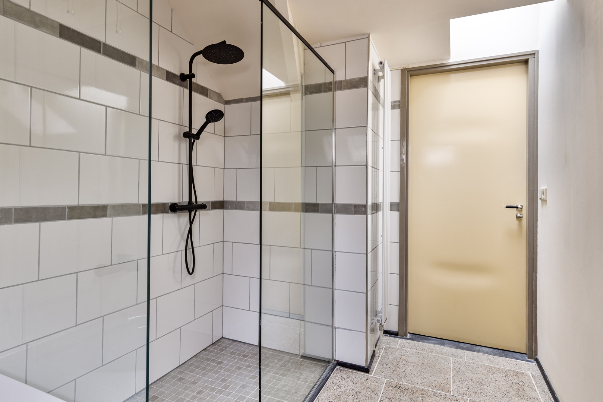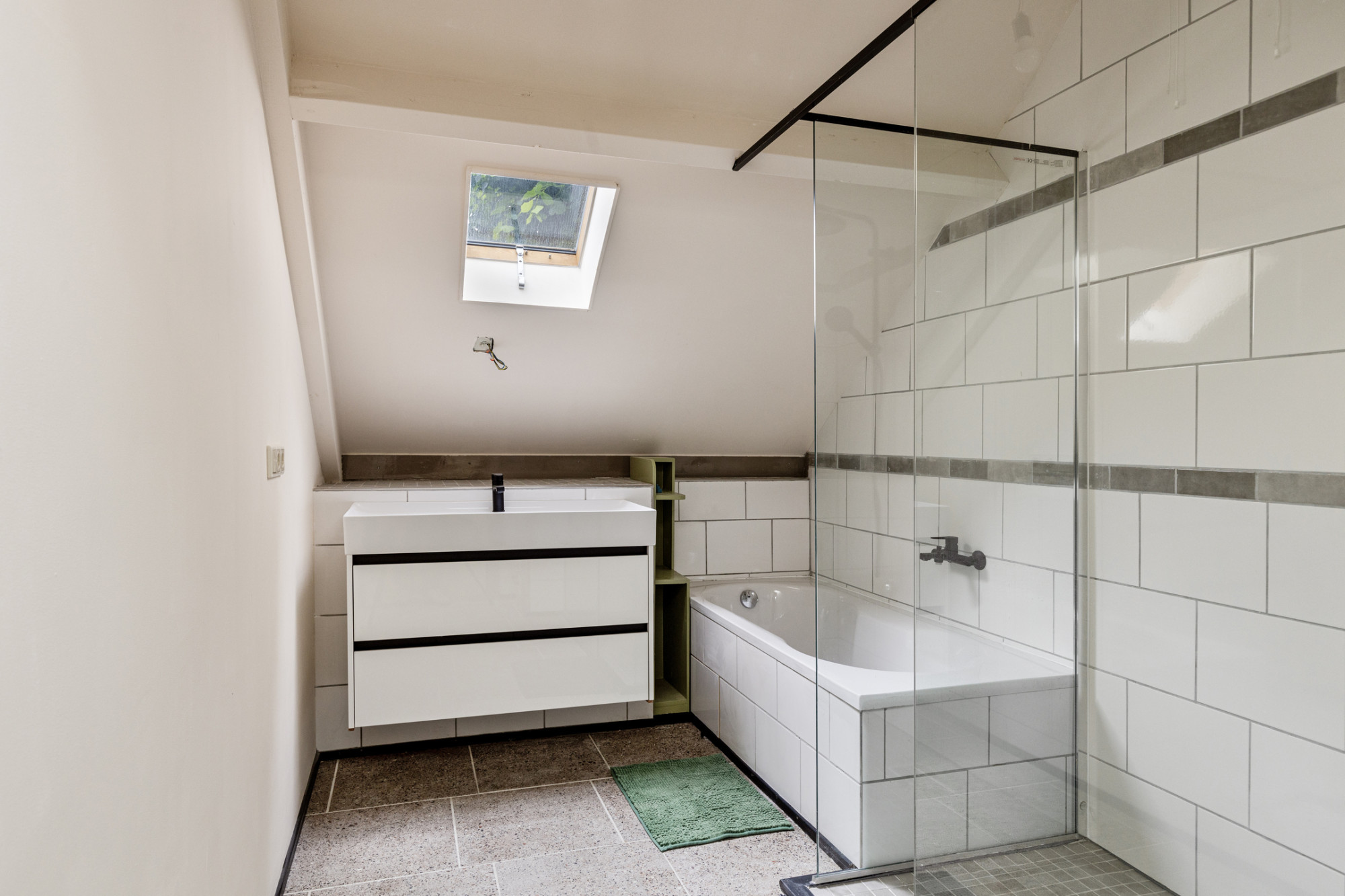 Moderne badkamer (2.86 x 2.04 m) voorzien van bad, inloop douche en badmeubel met vaste wastafel.