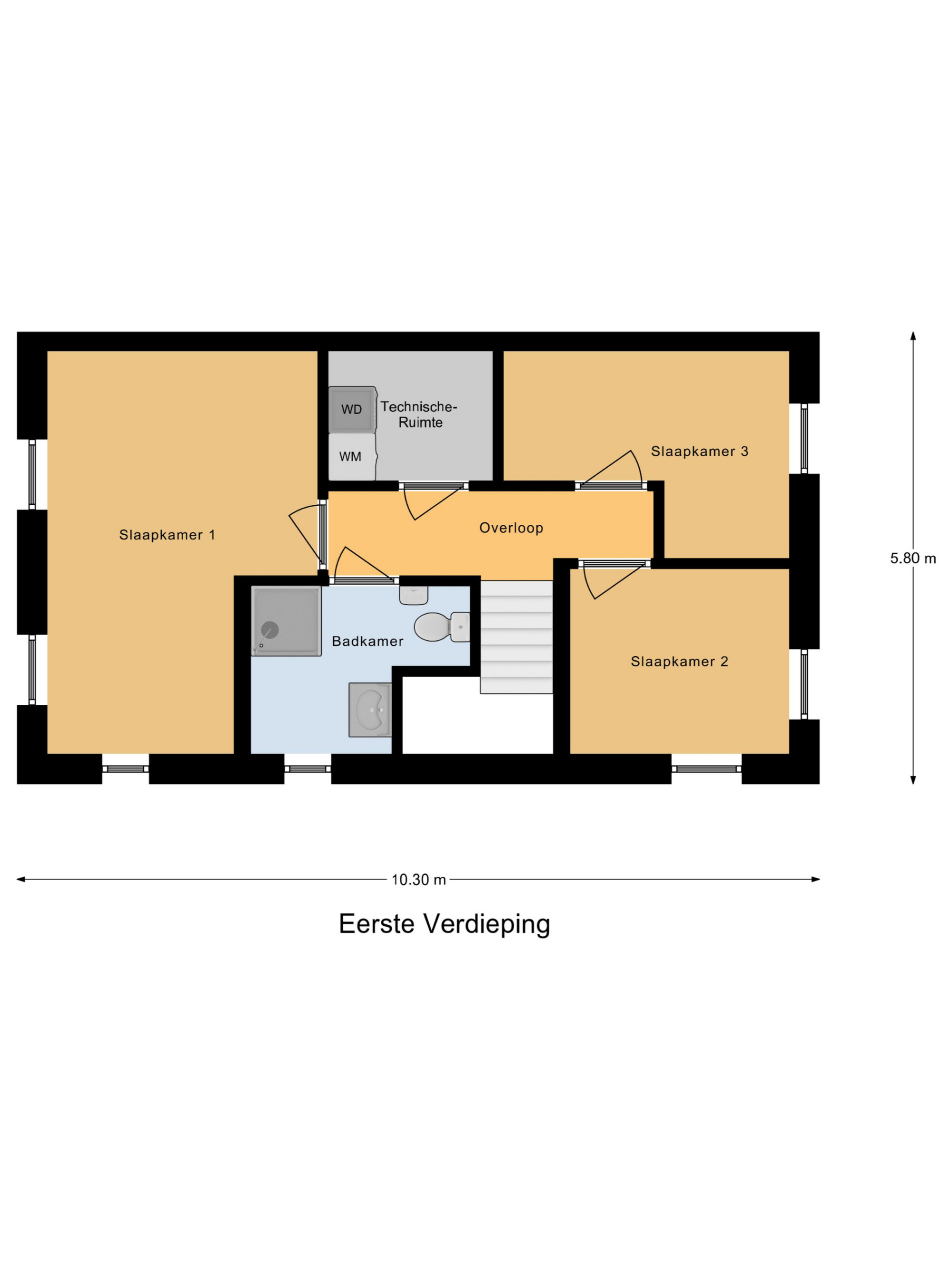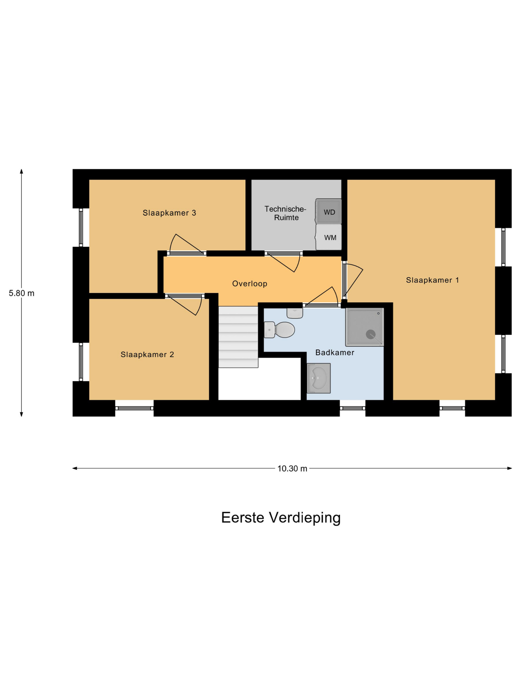 De eerste verdieping beschikt over drie slaapkamers en badkamer die je naar eigen inzicht tot een droombadkamer kunt ontwerpen. Tevens bevindt zich hier een technische ruimte met de opstelplaats van de Warmte-Terug-Win installatie en de witgoedaansluitingen.