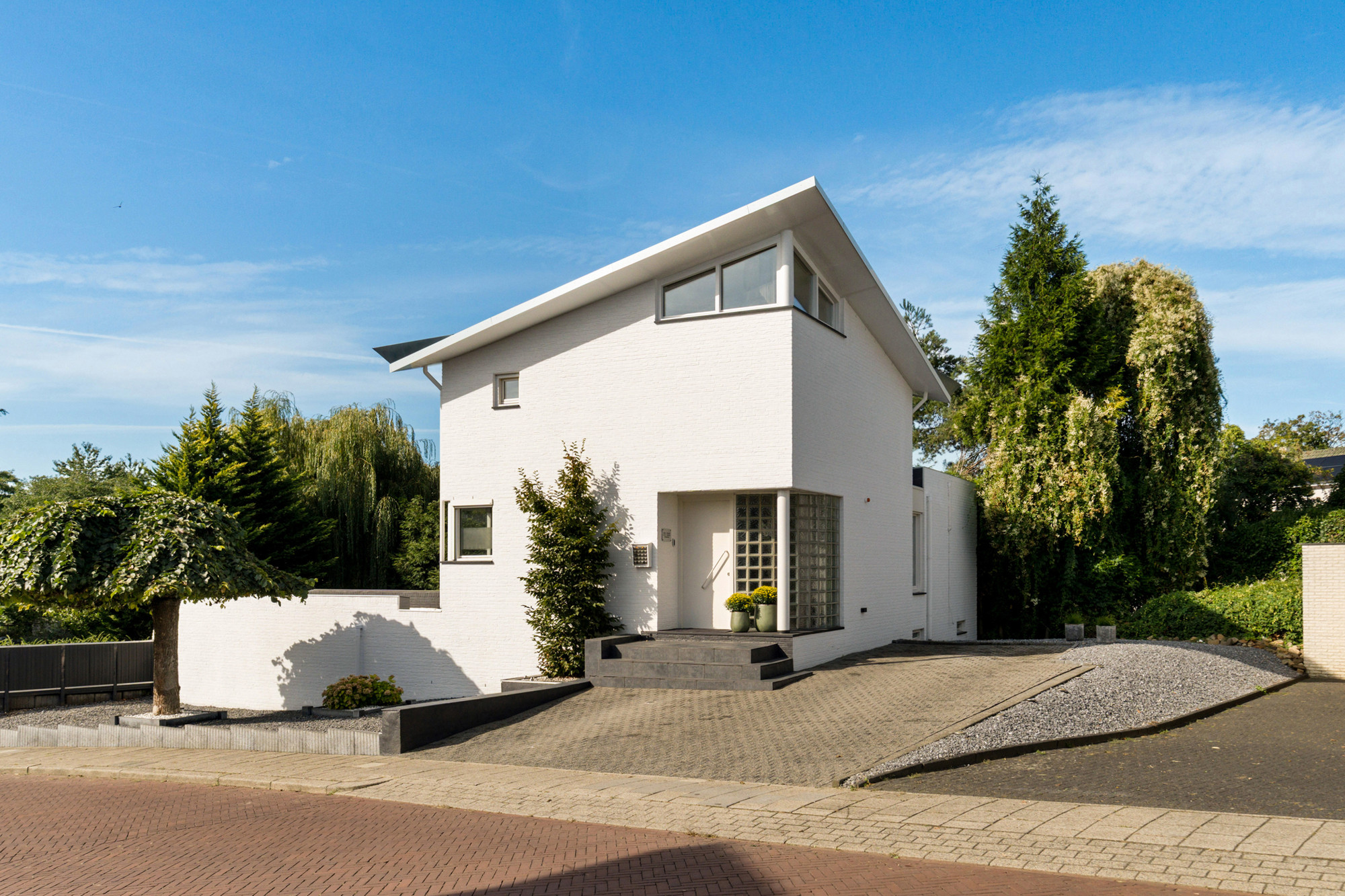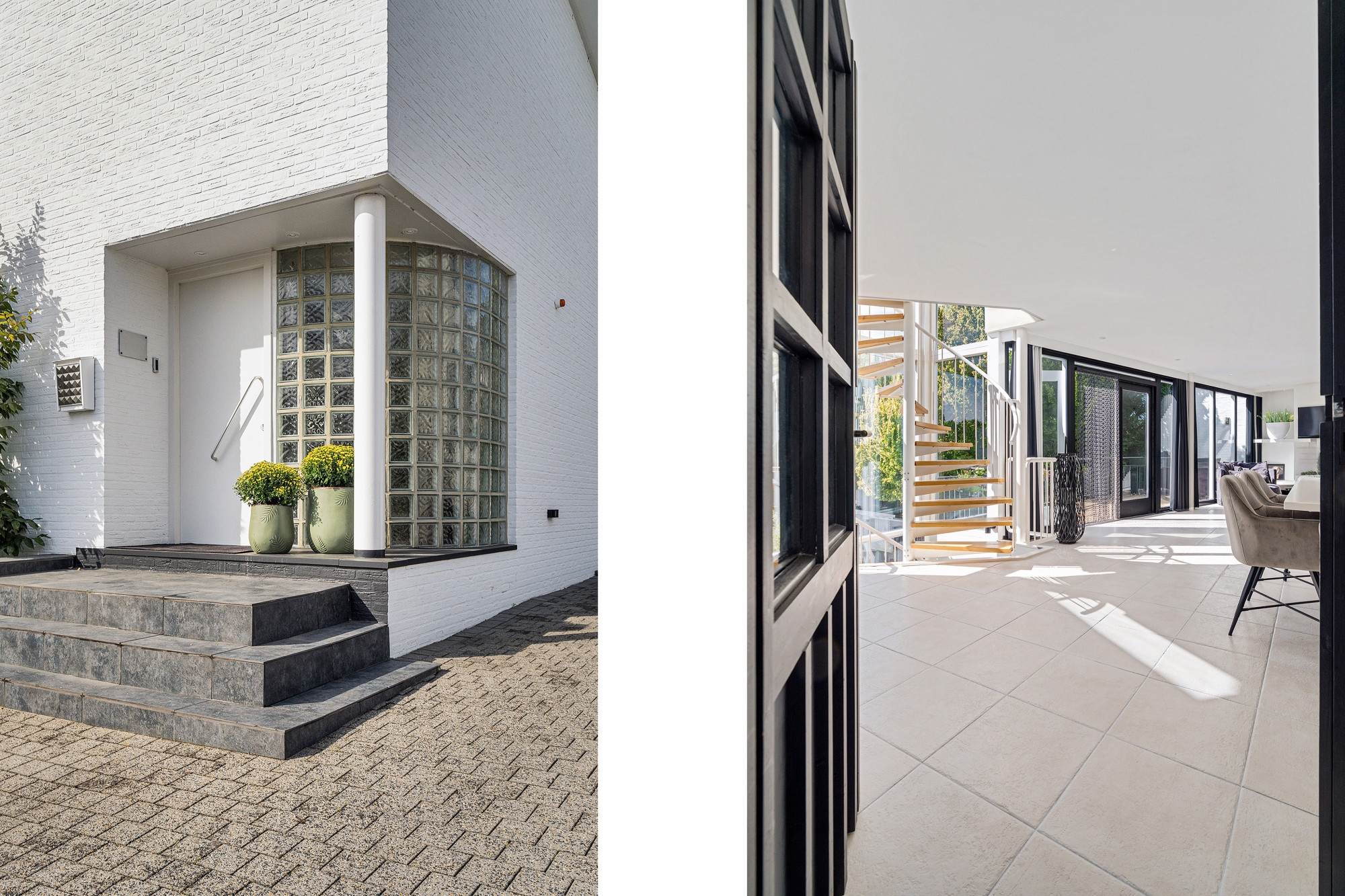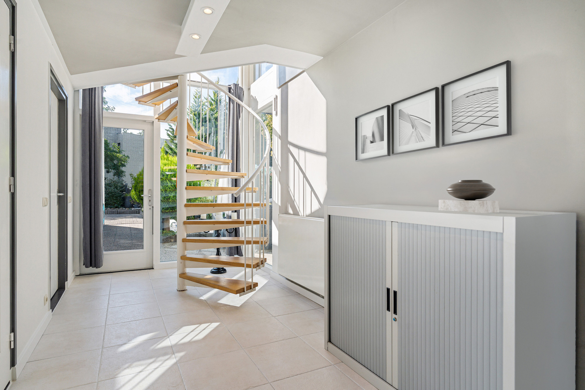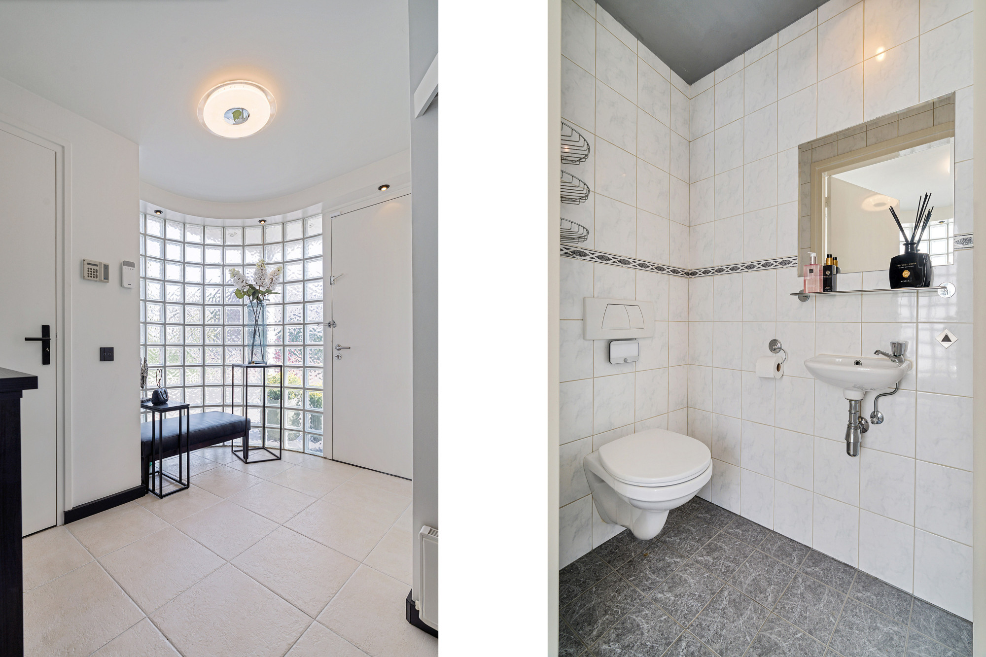 De hoofdentree biedt een stijlvolle binnenkomst met een glasblokkenmuur en garderobe. Links bevindt zich het volledig betegelde toilet met fonteintje en rechts de meterkast (3-fasen). Vanuit de hal loopt u door naar de ruime woonkamer en open keuken.