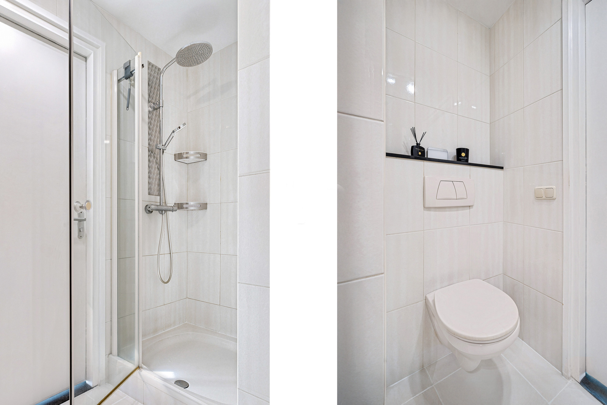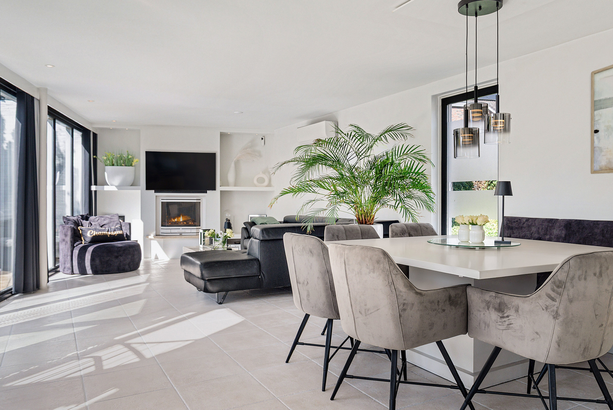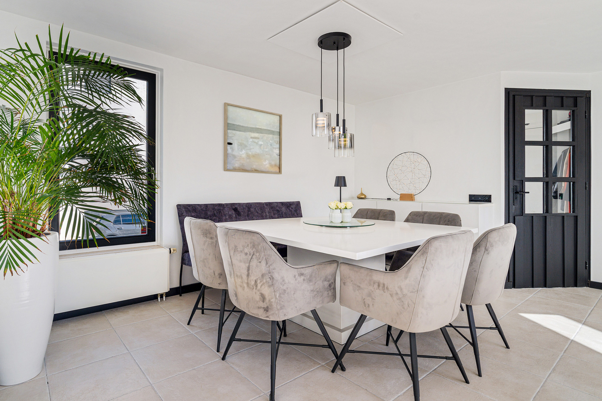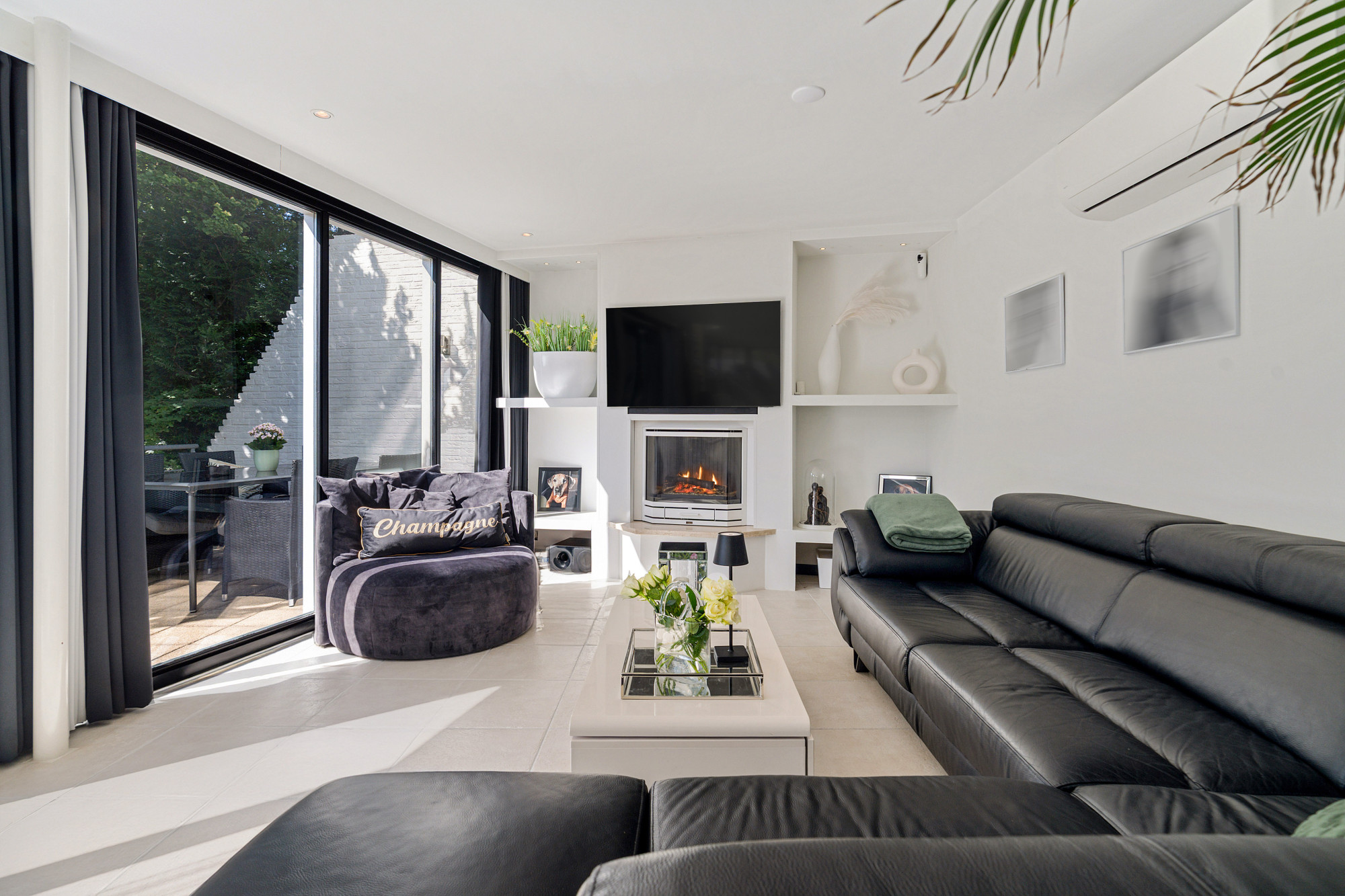 De hoofdentree biedt een stijlvolle binnenkomst met een glasblokkenmuur en garderobe. Links bevindt zich het volledig betegelde toilet met fonteintje en rechts de meterkast (3-fasen). Vanuit de hal loopt u door naar de ruime woonkamer en open keuken.