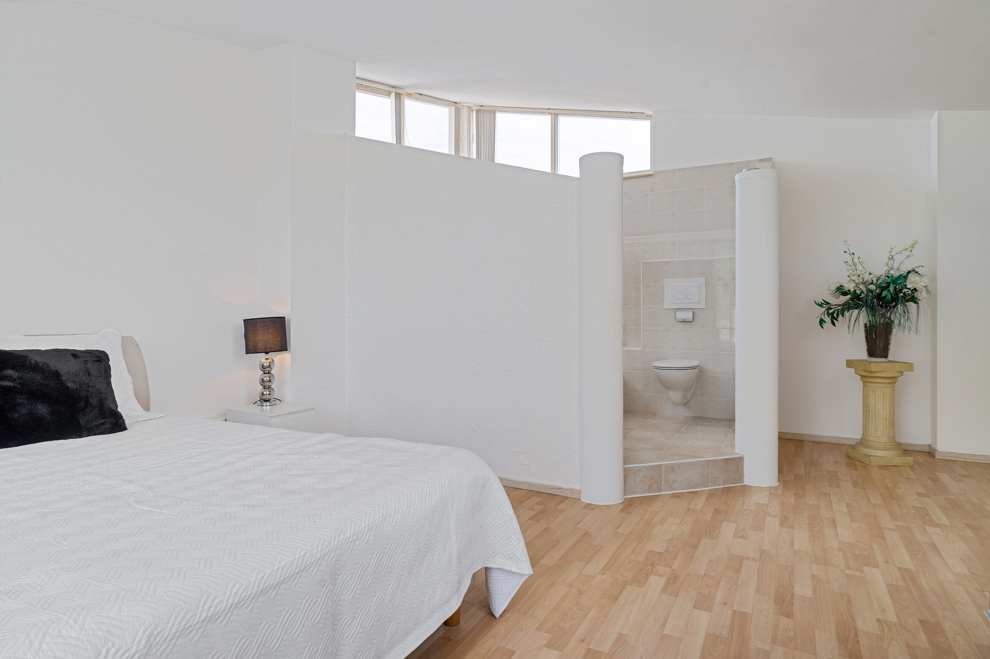 Ook dit niveau bereikt u via de spiltrap. Hier bevindt zich de master suite: een ruime slaapkamer met open badkamer. Deze is voorzien van toilet, ligbad met douchefunctie en een vaste wastafel in meubel. Vanuit de slaapkamer heeft u toegang tot een royaal dakterras met zitgedeelte, ideaal om in alle privacy te loungen. De kamer beschikt verder over een laminaatvloer en een praktische vaste kast.