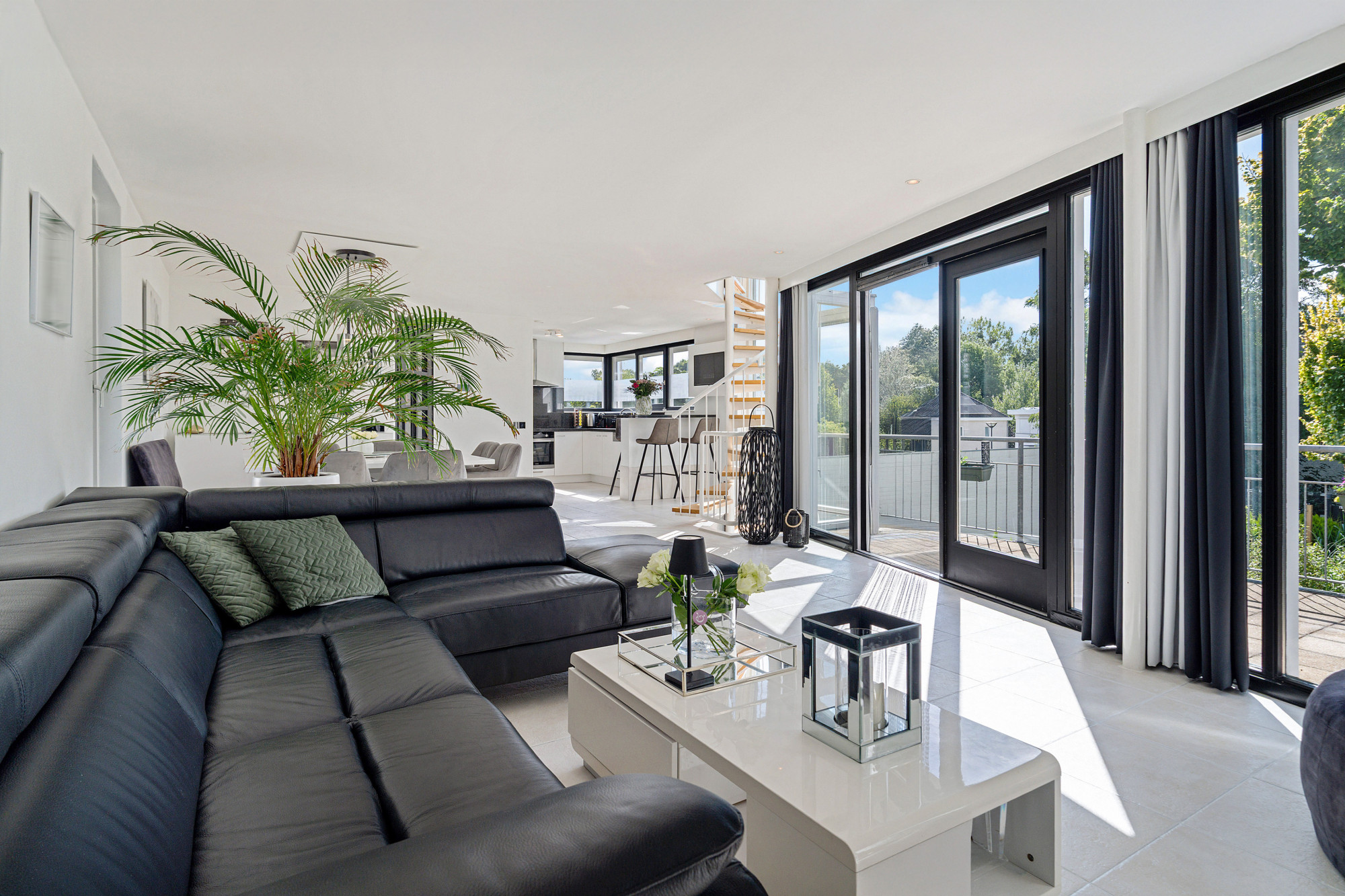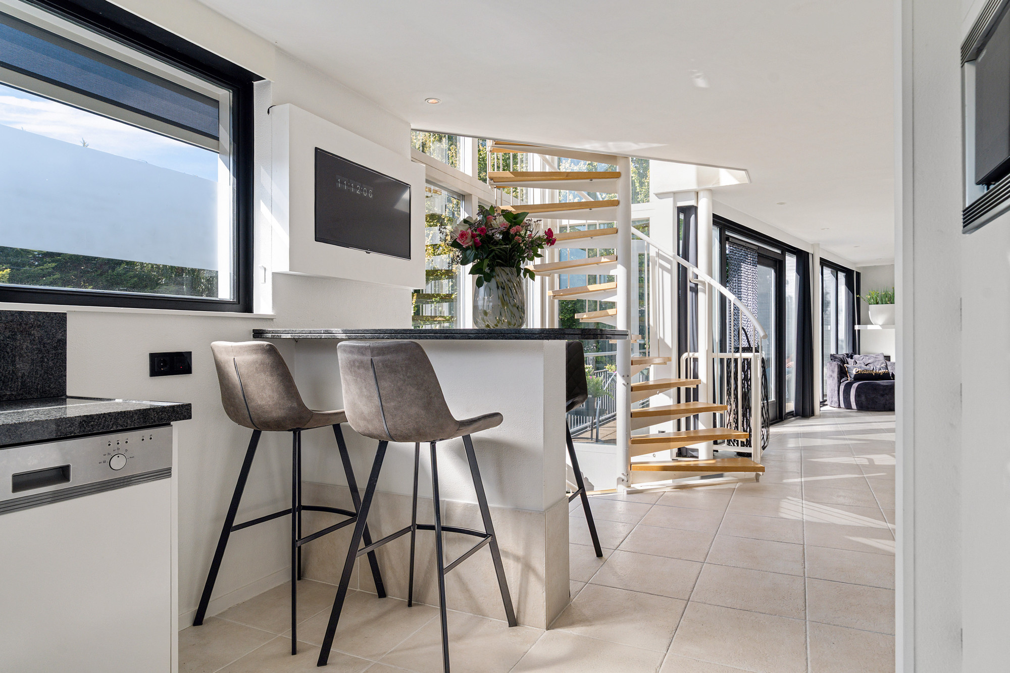 De woonkamer is een lichte en comfortabele leefruimte met een eet- en zitgedeelte, voorzien van gashaard, airconditioning en openslaande deuren naar het dakterras. De moderne keuken beschikt over alle benodigde apparatuur zoals koelkast, combimagnetron, heteluchtoven, inductiekookplaat, afzuigkap, vaatwasser en een stijlvol stenen werkblad. De gehele verdieping is voorzien van vloerverwarming.
