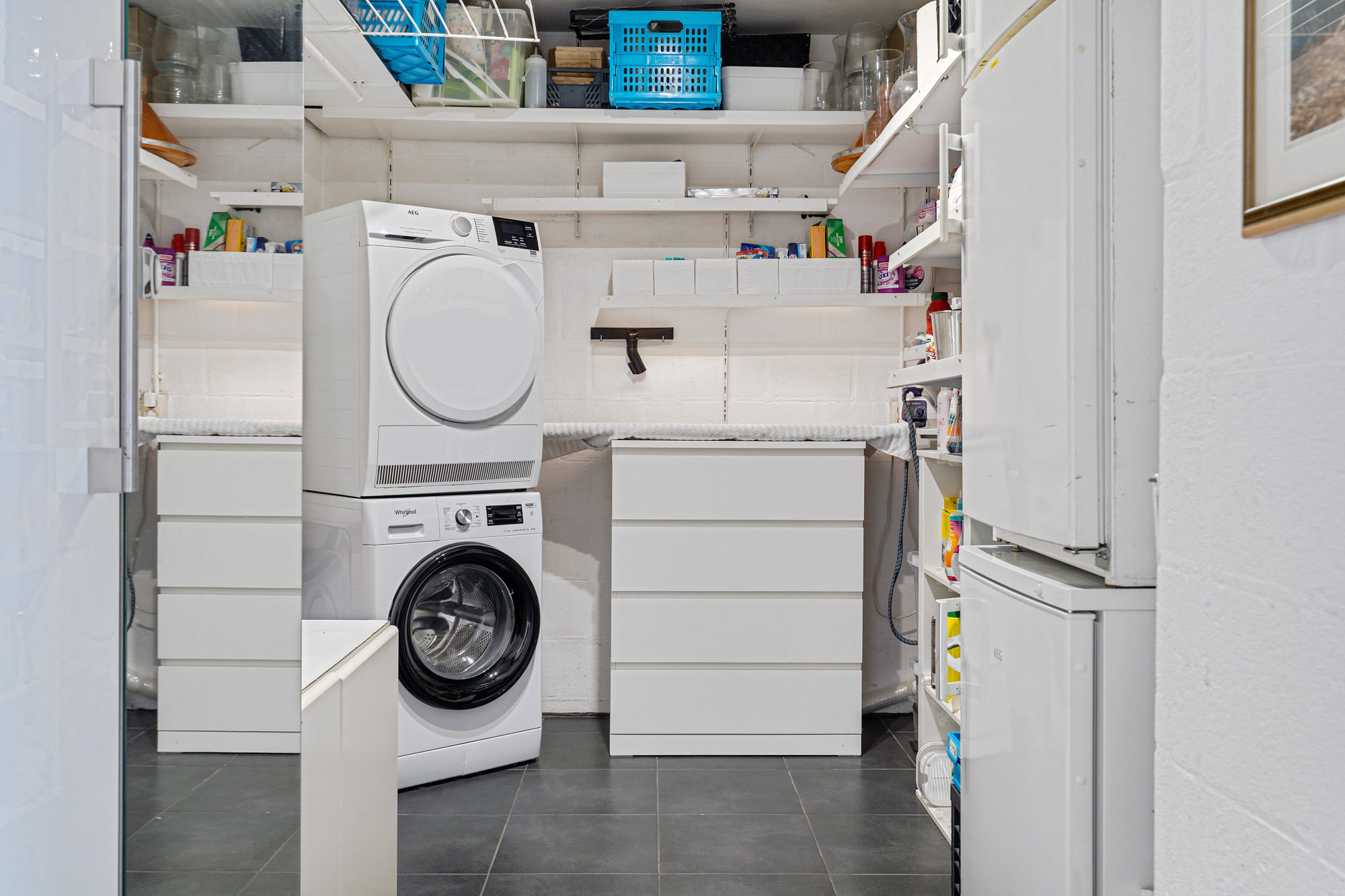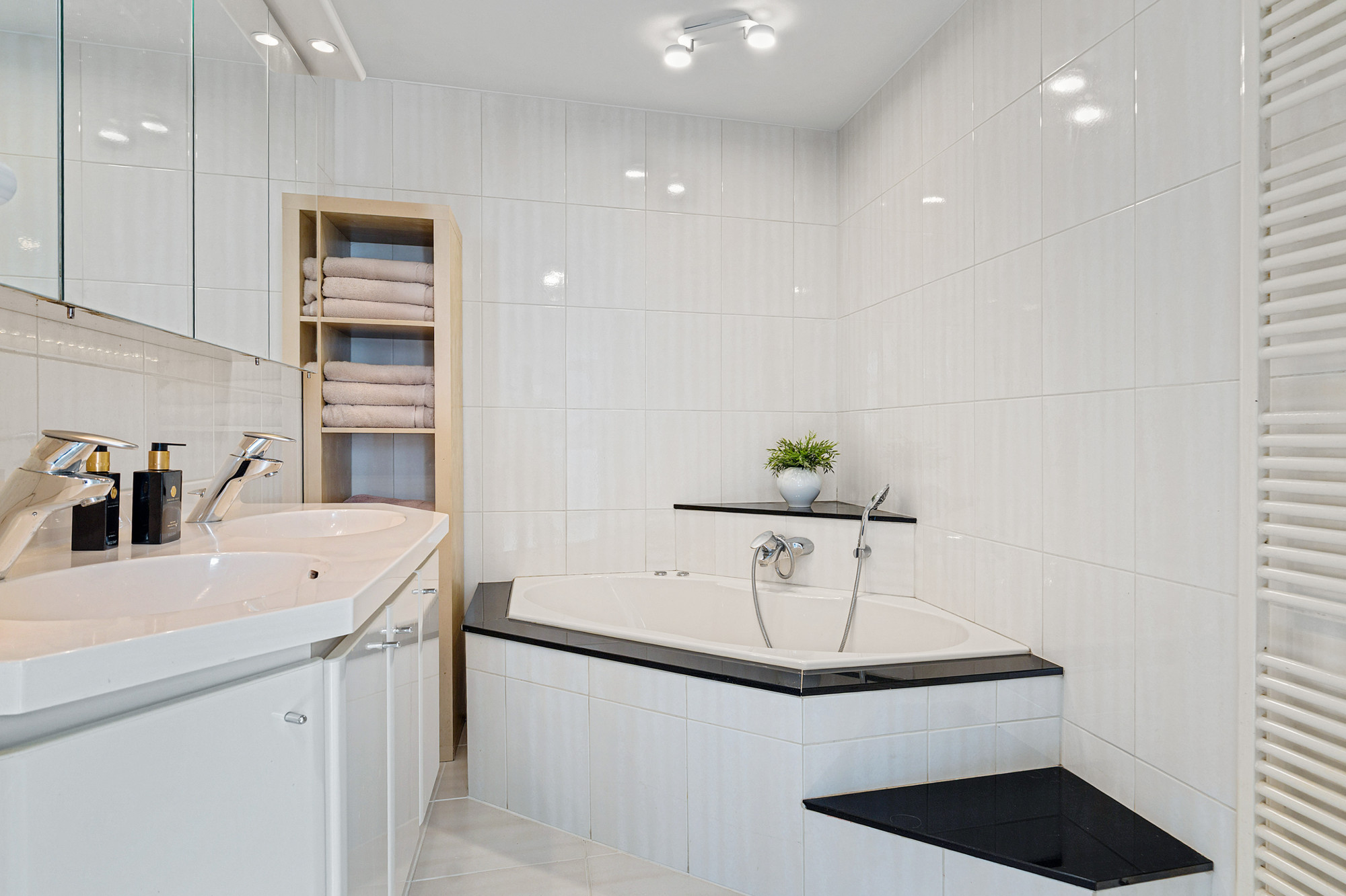 Via een spiltrap bereikt u het souterrain, dat door de royale opzet als volwaardige woonlaag fungeert. Hier vindt u drie slaapkamers, waarvan twee direct toegang geven tot de tuin middels openslaande deuren. De luxe badkamer is compleet uitgerust met vloerverwarming, whirlpoolbad, dubbele wastafel, douche, toilet en designradiator. Daarnaast is er een praktische ruimte met witgoedaansluitingen en de cv-installatie (Nefit Ecomline).