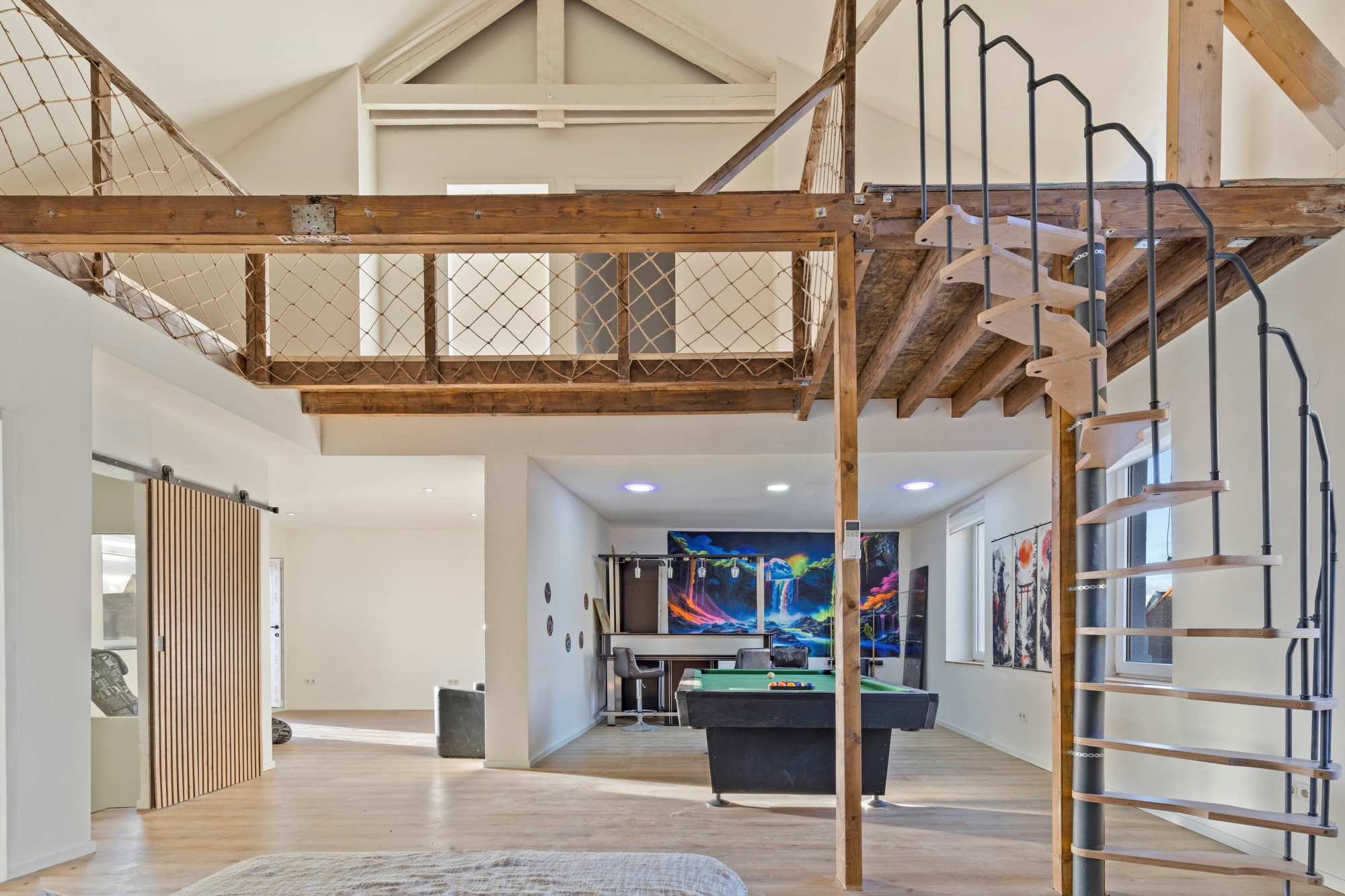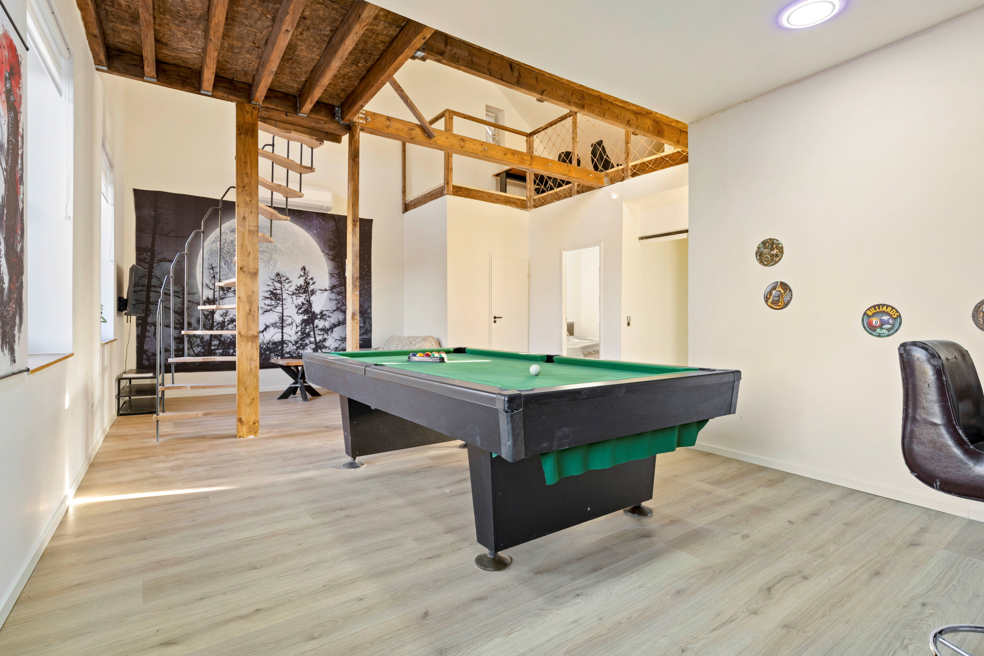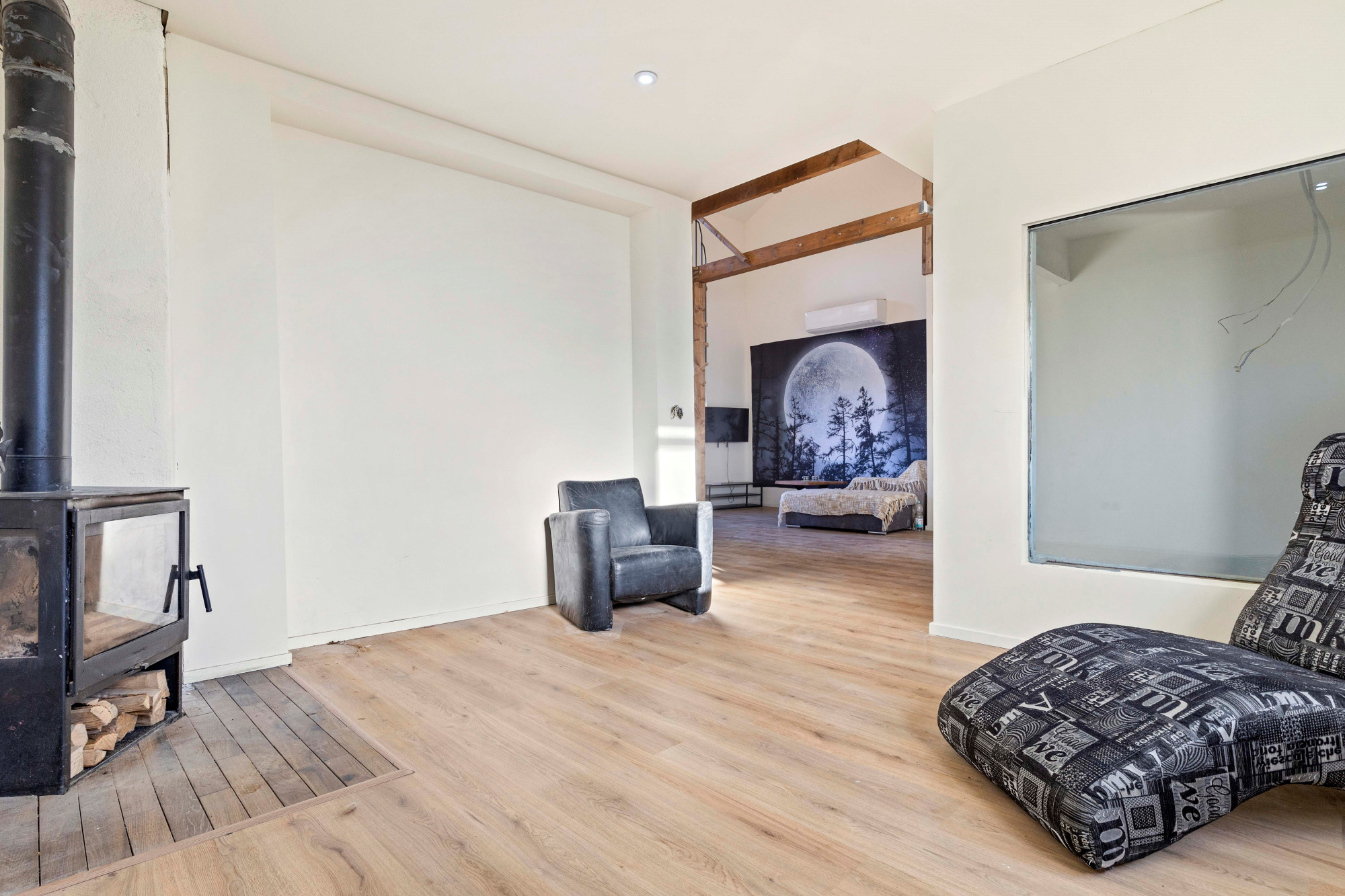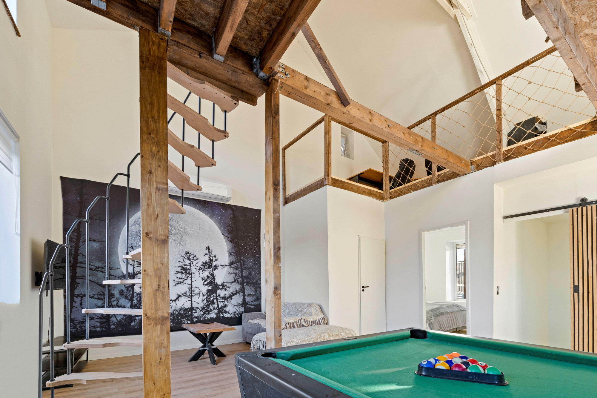 Grote open woonkamer met airco en spiltrap naar tweede verdieping. Hoge plafonds met inbouwverlichting. Mooie houten balken en diverse houtaccenten. Barruimte. Moderne toiletruimte met toilet en fonteintje. Slaapkamer. Multifunctionele zitkamer met houtkachel en toegang tot groot dakterras.