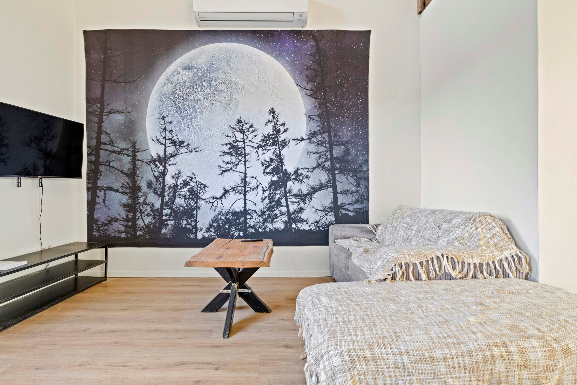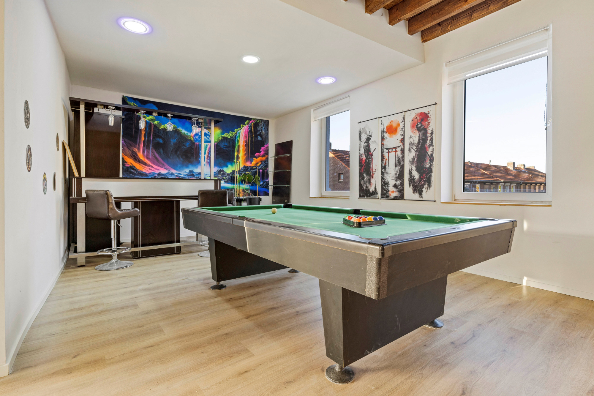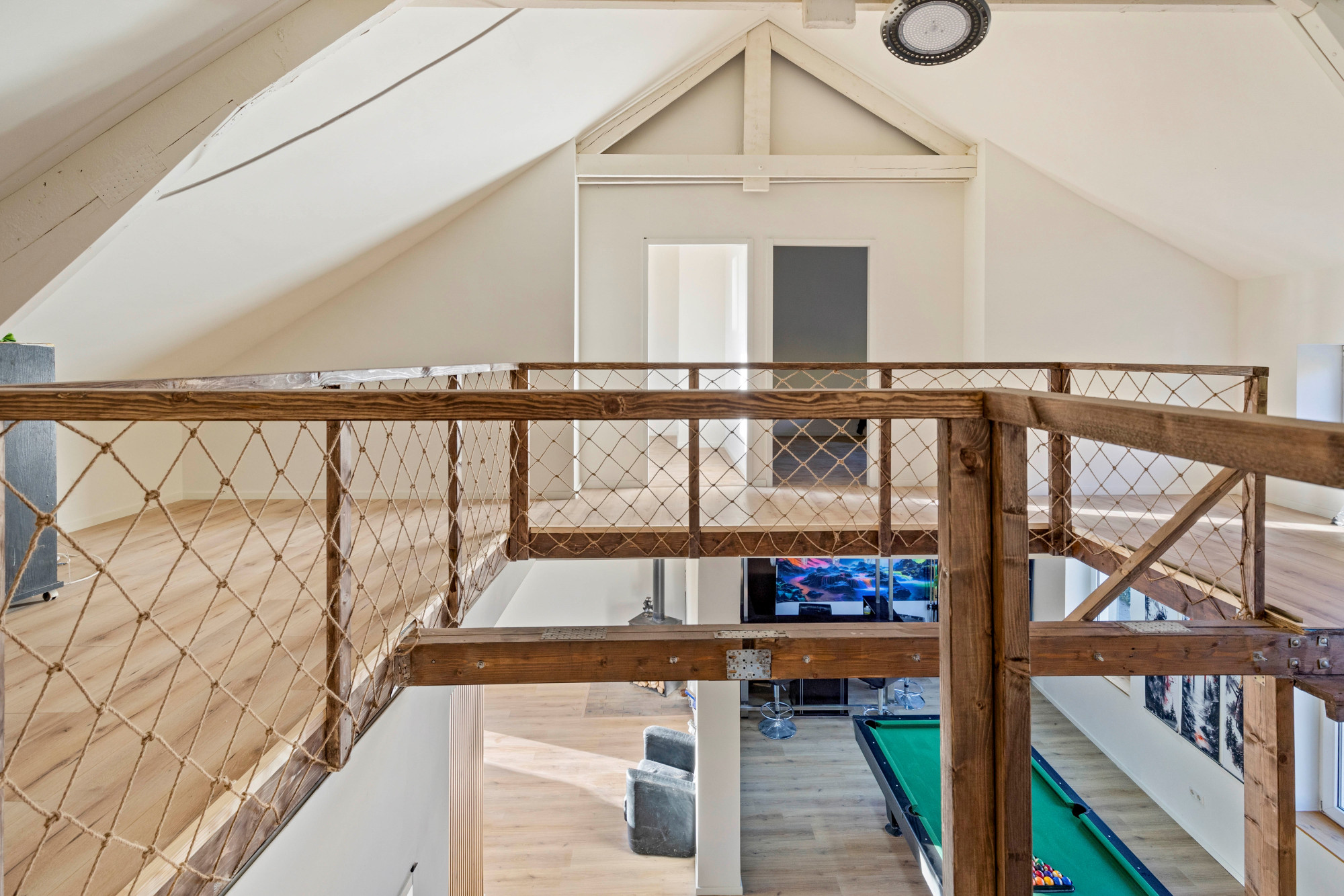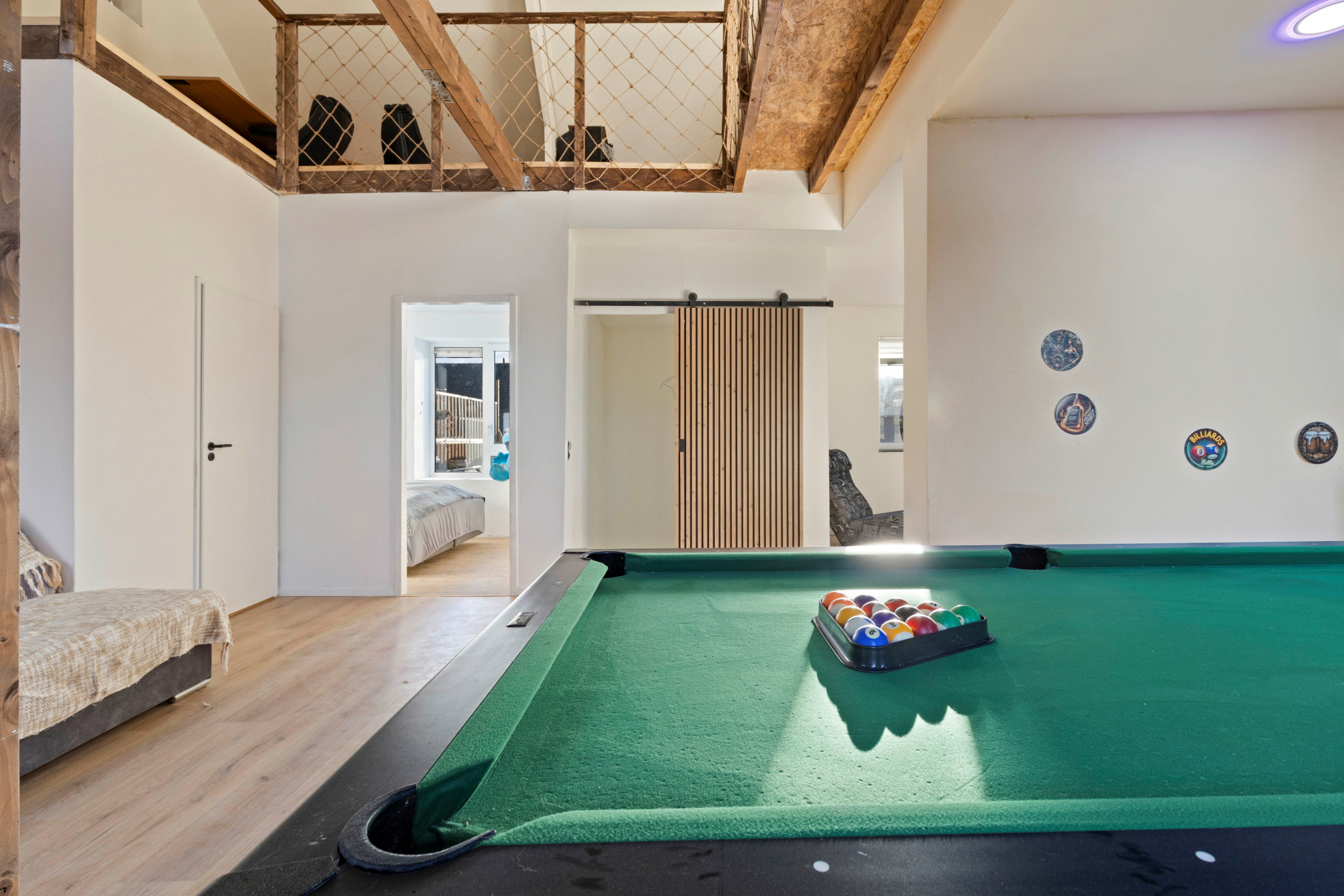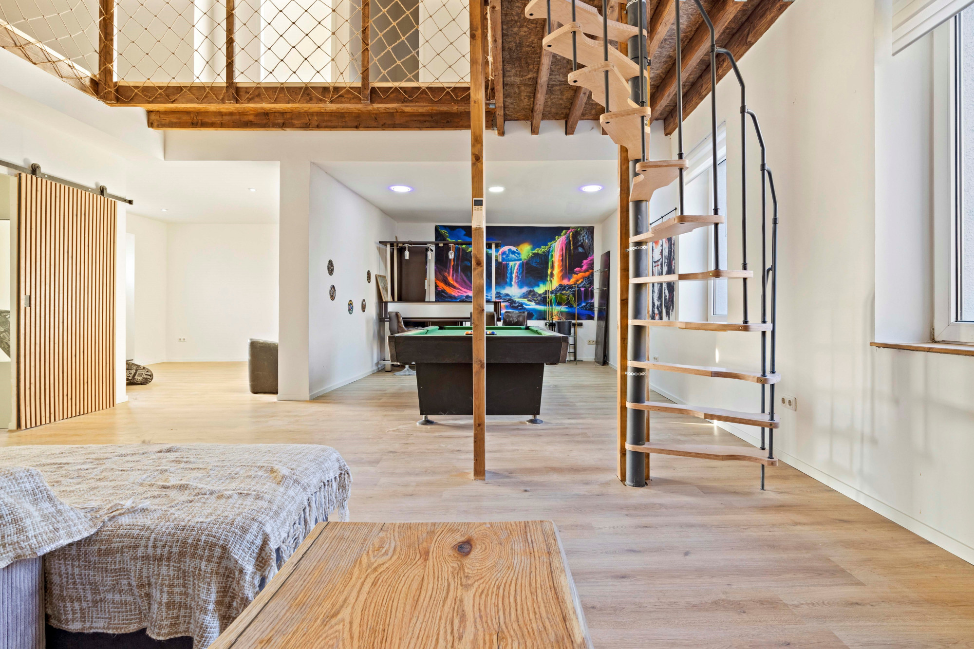 Grote open woonkamer met airco en spiltrap naar tweede verdieping. Hoge plafonds met inbouwverlichting. Mooie houten balken en diverse houtaccenten. Barruimte. Moderne toiletruimte met toilet en fonteintje. Slaapkamer. Multifunctionele zitkamer met houtkachel en toegang tot groot dakterras.