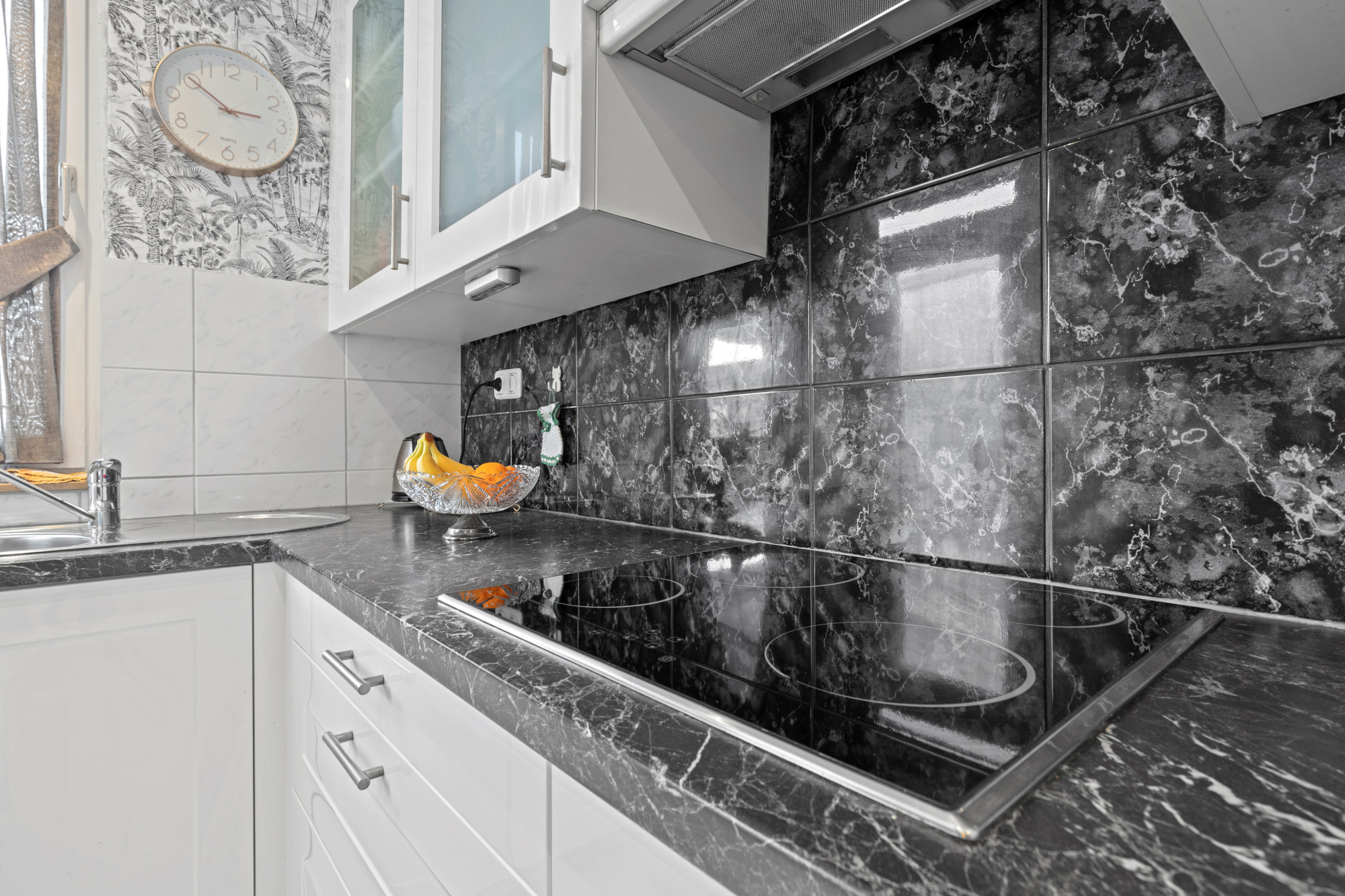 Half open keuken v.v. laminaatvloer en keurige witte aanbouwinstallatie incl. apparatuur, te weten combi-oven, koelkast en wasemkap. Ruime trapberging.