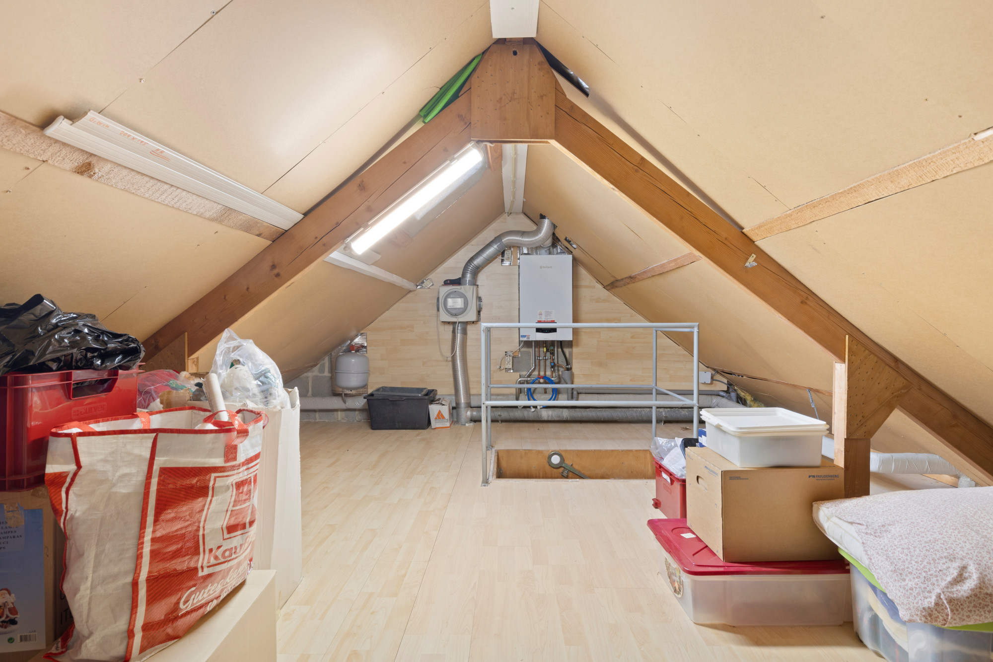 Berging voorzien van dakraam en met opstelling Cv combi installatie (Vailiant Eco Tec Plus, 2025, eigendom) en mechanische ventilatie.