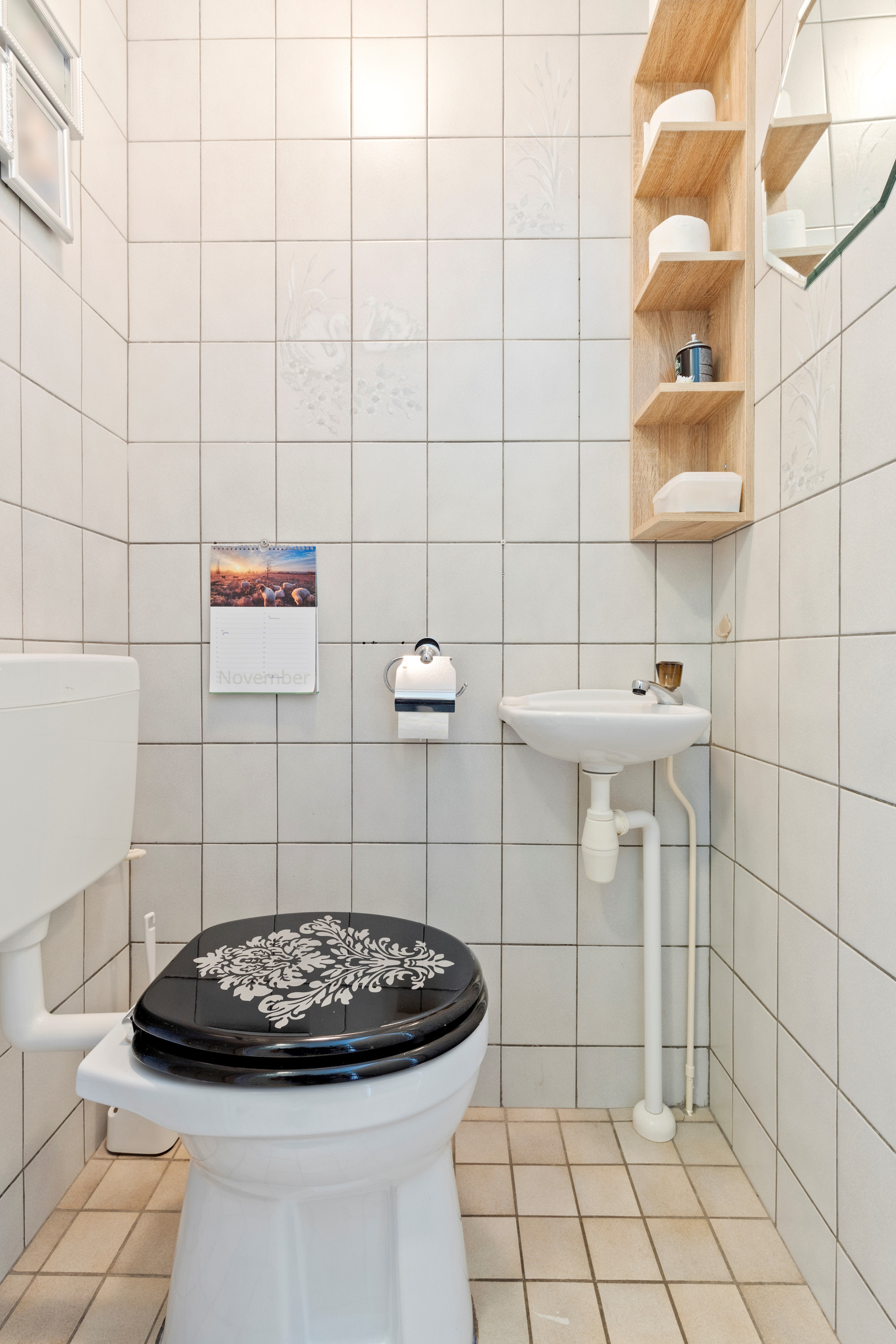 Betegelde badkamer voorzien van douche, badkamermeubel, 2e (vrij hangend) toilet met inbouwreservoir en aansluitpunten voor wasmachine en droger.