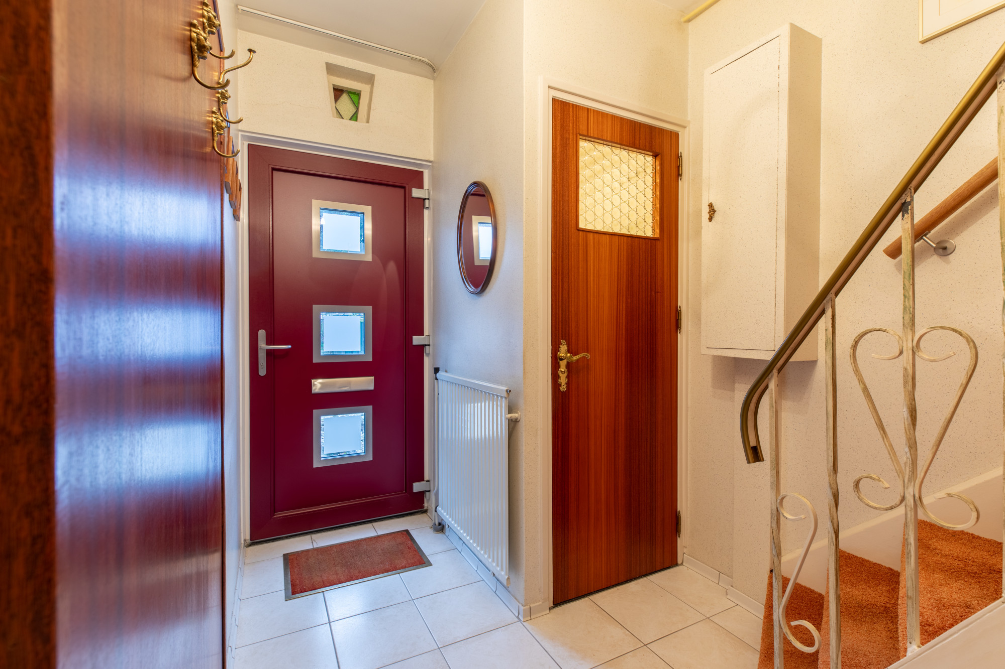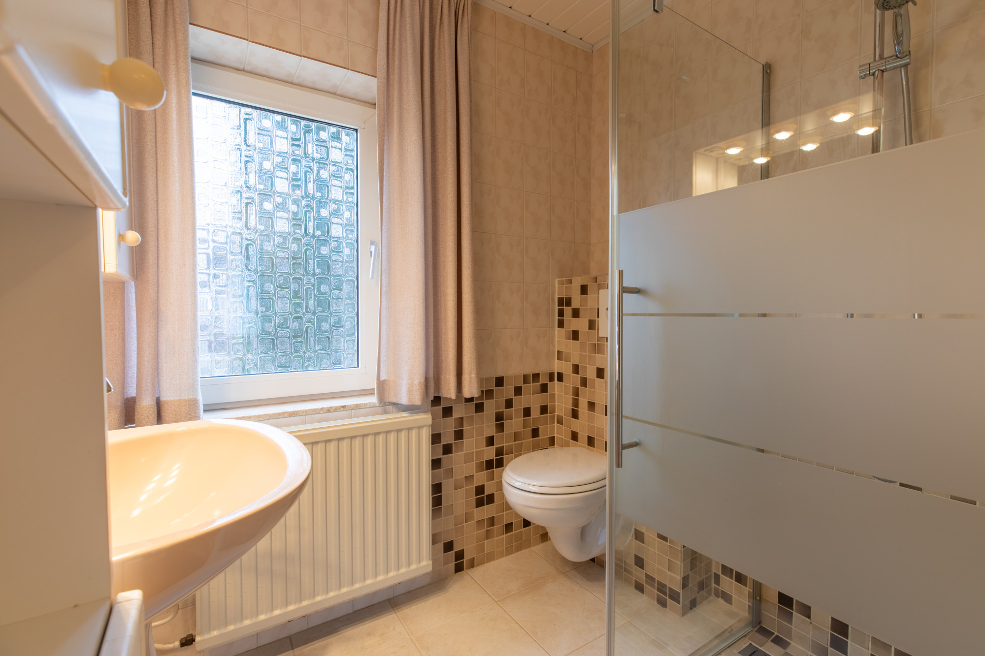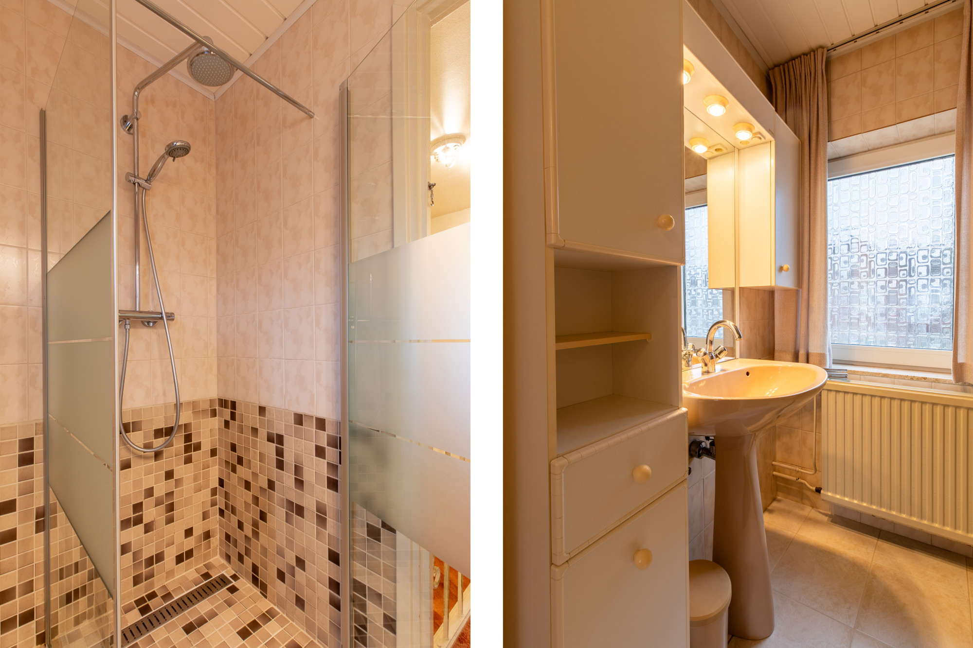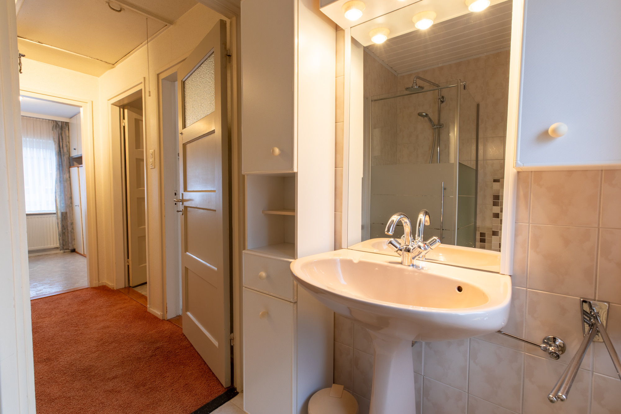 Overloop met toegang naar 3 slaapkamers. Badkamer met douche, 2e toilet (zwevend) en wastafelmeubel.